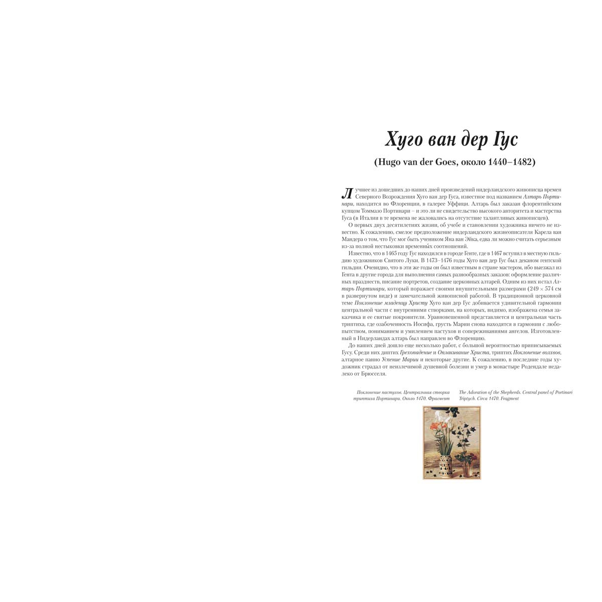 Лучшее из дошедших до наших дней произведений нидерландского живописца времен Северного Возрождения Хуго ван дер Гуса, известное под названием «Алтарь Портинари», находится во Флоренции, в галерее Уффици. Алтарь был заказан флорентийским купцом Томмазо Портинари – и это ли не свидетельство высокого авторитета и мастерства Гуса (в Италии в те времена не жаловались на отсутствие талантливых живописцев). В альбоме представлены 22 живописные работы Хуго ван дер Гуса.