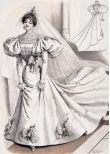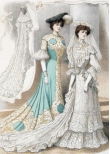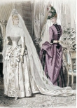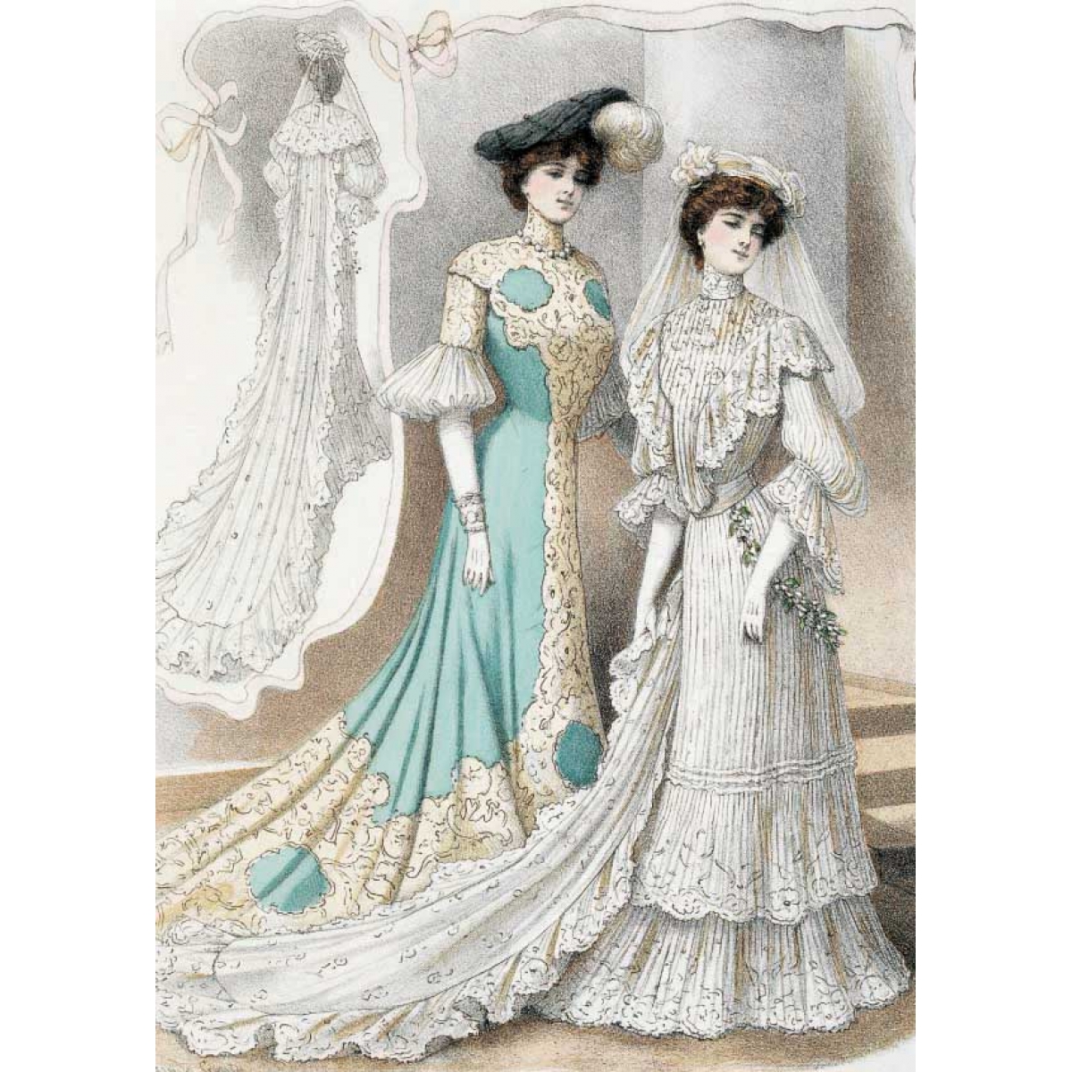 Мода причудлива и капризна. В 1870–1880-х годах фаворитом дамской моды были платья с турнюром. Турнюр (ватная подушечка) располагали на юбке сзади, чуть ниже талии, для формирования особого, грациозно изогнутого силуэта. В 1890-е годы силуэт женского костюма изменился. Турнюр вышел из моды и покрой платья заметно упростился. Акцент делали на узкую талию и широкие рукава-буфы, юбка плотно обтягивала бедра и расширялась колоколом внизу. Мода 1900–1906 годов отличалась особенным изяществом. В ней отразились элементы господствующего в европейском искусстве стиля модерн. Все эти нюансы касались и свадебной моды. Каждую деталь вы сможете увидеть в представленных открытках, которые будут интересны любому человеку, интересующемуся модой и историей дамского костюма.