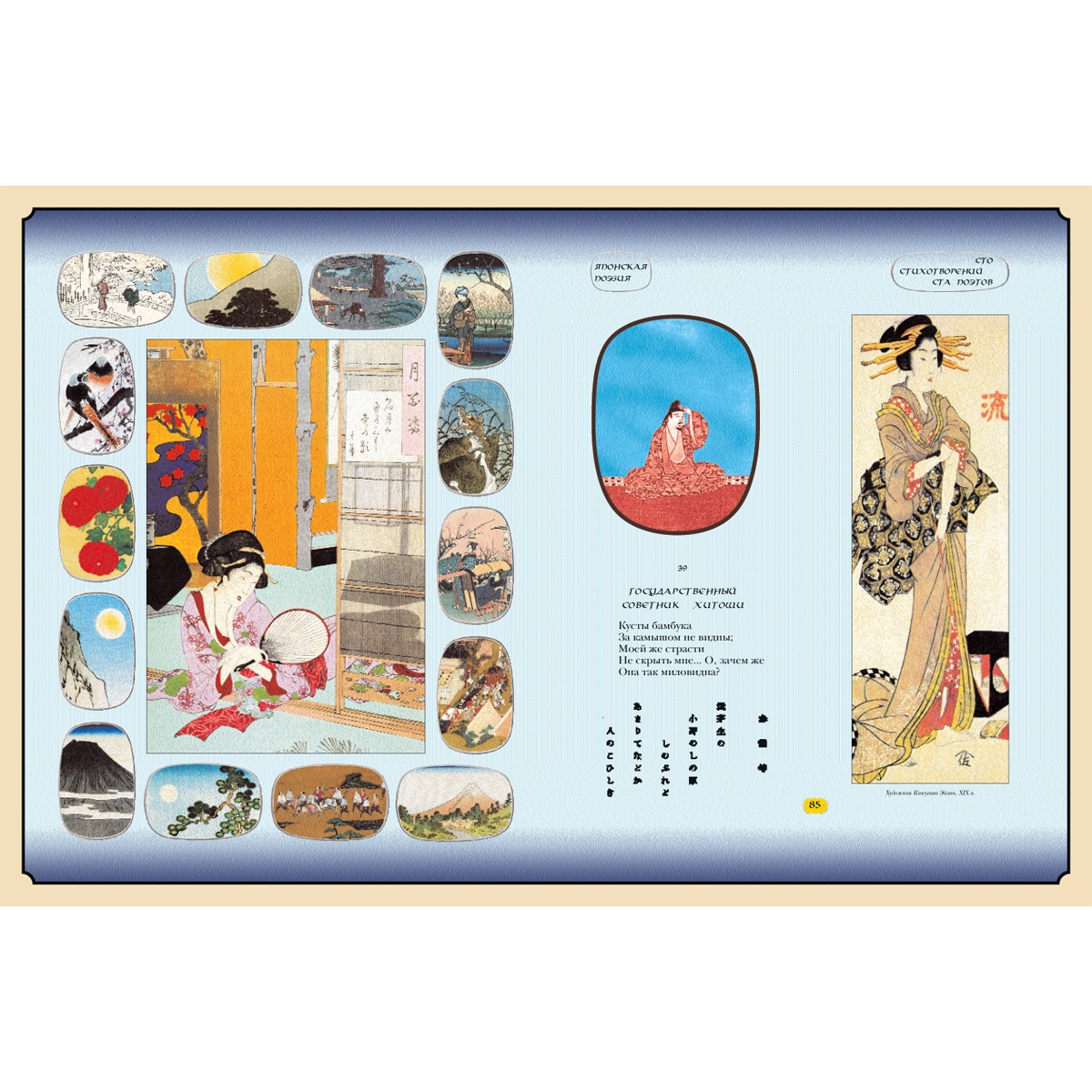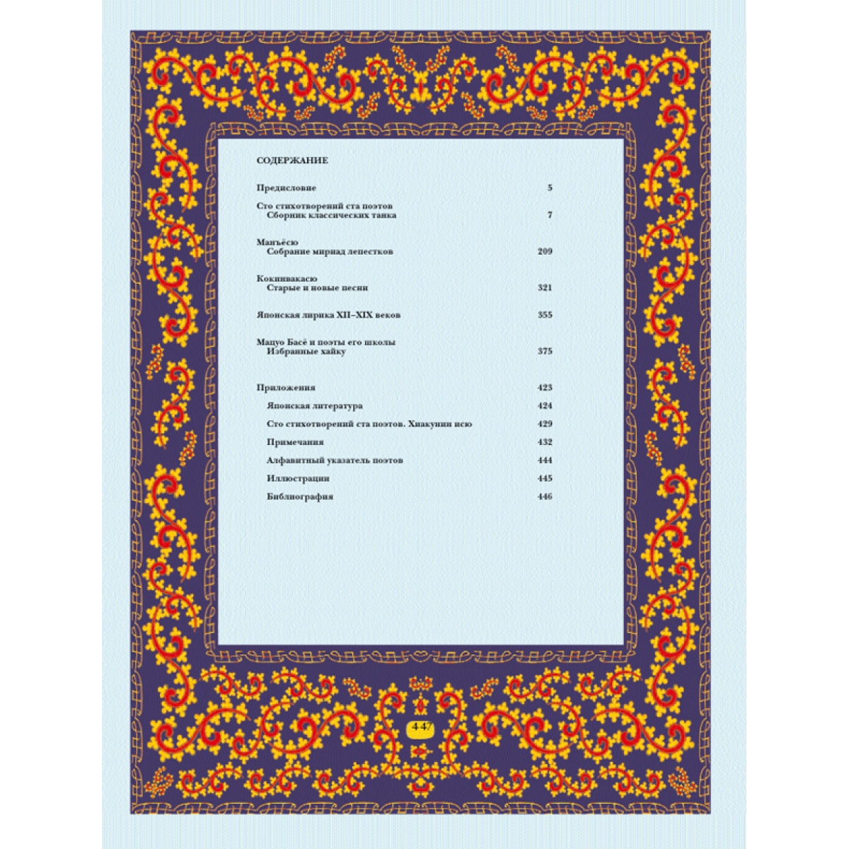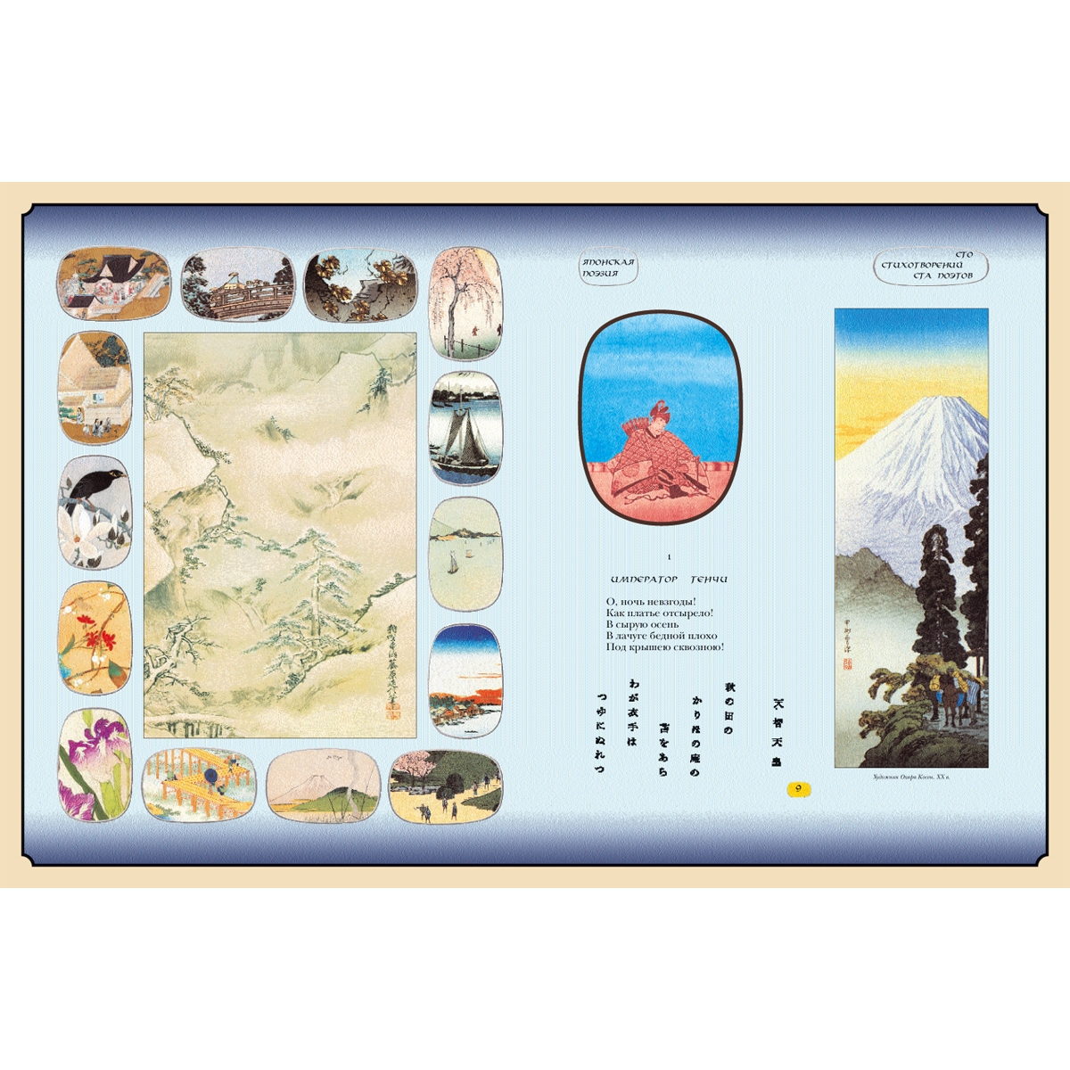 Издание такого объемного и богато иллюстрированного сборника (поэзия IX–XIX веков в переводах начала ХХ века) – событие в культурной жизни. В книгу включены: сборник классических танка XIII века («Сто стихотворений ста поэтов»), антологии «Манъёсю» («Собрание мириад лепестков»), «Кокинвакасю» («Старые и новые песни»), японская лирика XII—XIX веков, стихотворения Мацуо Басё и поэтов его школы. Издание дополняют многочисленные приложения (очерки, примечания, указатели, библиография). Французский цельнокожаный переплет ручной работы на шнурах. Натуральная переплетная кожа. Форзац составной на кожаной слизуре. Дизайнерская бумага. Каптал двойной наборный, ручное плетение из шелковых нитей. Обрез торшорированный золотой фольгой. Ляссе шелковое. Тиснение полиграфической фольгой. Ювелирная накладка-художественное литье, эмаль.