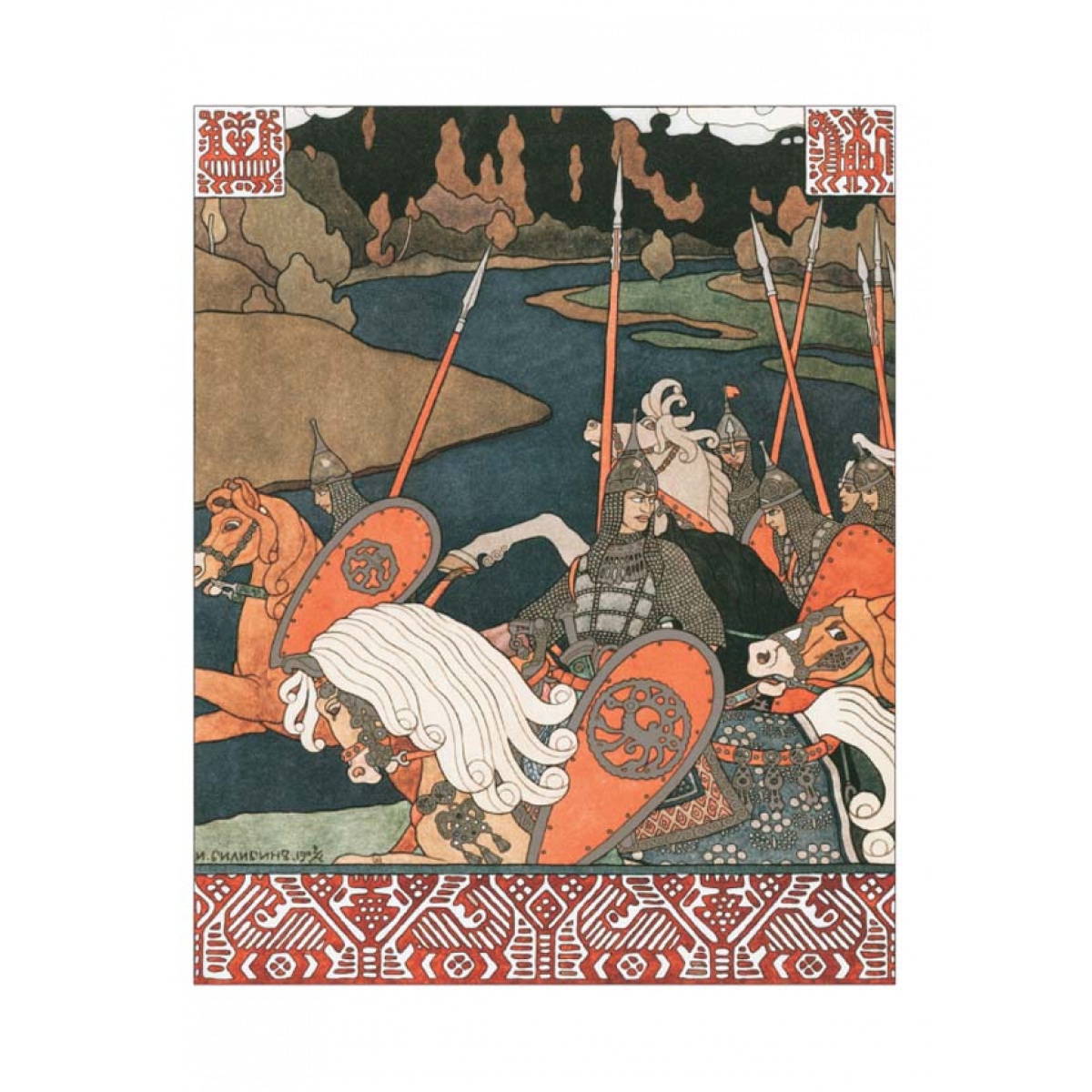 Иван Билибин был одним из лучших мастеров, воплощавших «русскую тему» в книгах и театральных декорациях. Образы былинных героев –Ильи Муромца, Добрыни, Вольги и пр. – давали выразительное и едва ли не реальное представление о защитниках Отечества.