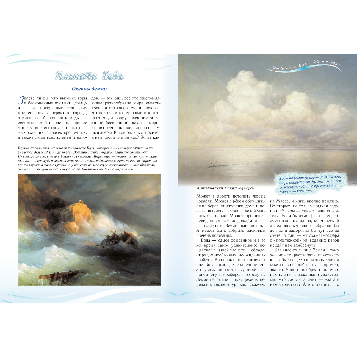 У воды нет вкуса, цвета и запаха. Зато она обладает необыкновенными свойствами. Она нас поит и... кормит. Нагреваясь, отдает тепло, а остывая, охлаждает в жару. Писатель Антуан де СентЭкзюпери, обращаясь к воде, сказал: «Нельзя сказать, что ты необходима для жизни — ты есть сама жизнь». А помним ли мы о том, что состоим из воды… на 70 процентов? И 70 процентов поверхности планеты занято водой? Так что мы тоже ее порождение, хотя в глубокой древности и выбрались на сушу из мирового океана — оттуда и пошла жизнь!