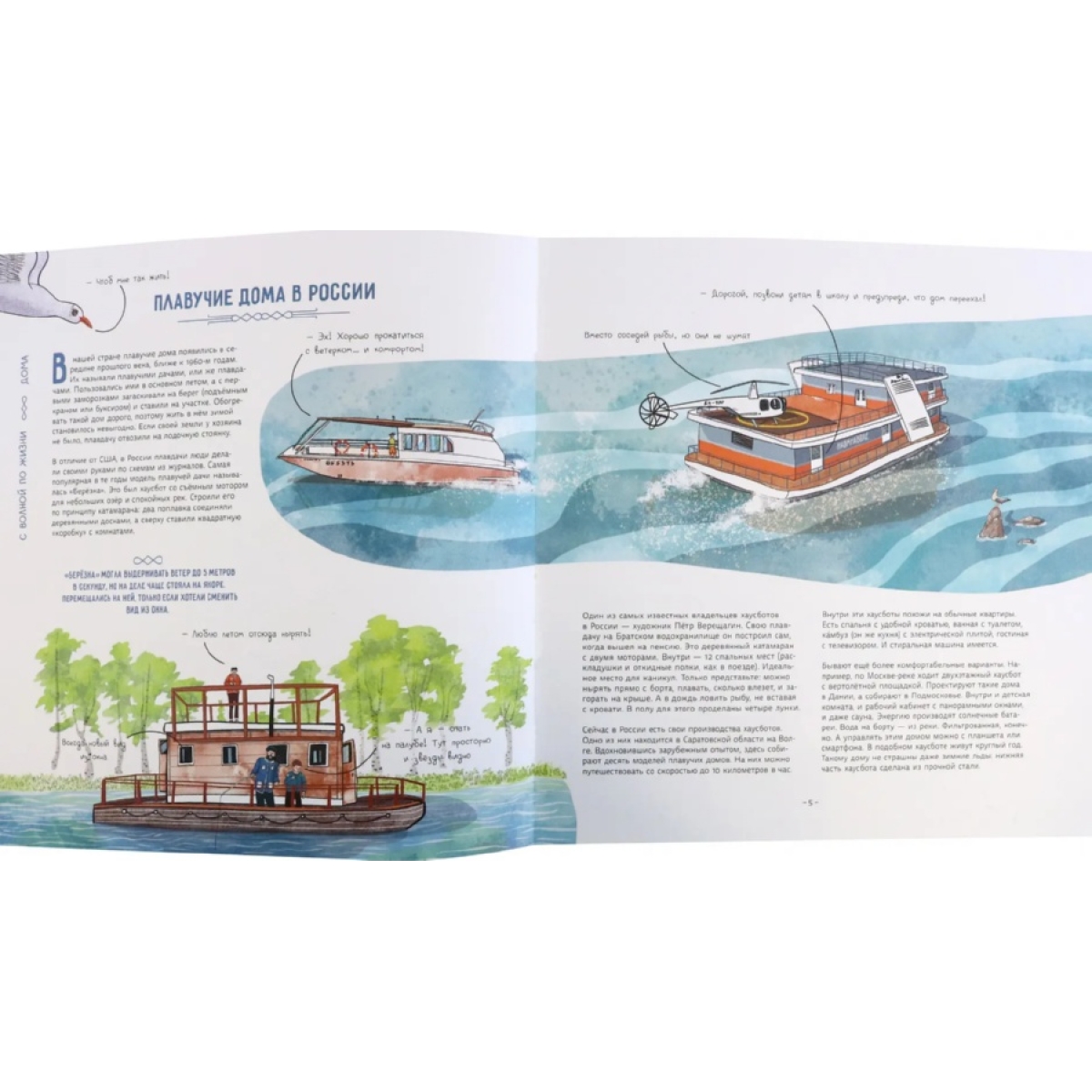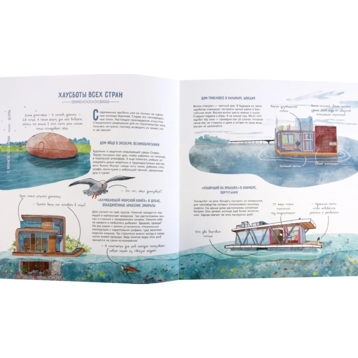 Как вы думаете, кому и зачем пришло в голову жить на воде? Из чего можно построить плавучий дом? Какие правила есть у водной жизни? Давайте проплывём по улицам водных деревень, заглянем на плавучую ферму, перекусим пиццей на дне океана и найдём ответы на эти вопросы. Заодно отдохнём в подводном отеле, покатаемся в автобусе-амфибии, узнаем, как устроена плавучая электростанция, познакомимся со знаменитыми путешественниками, которые в одиночку переплыли океан. А ещё наденем акваланг и посетим подводный музей. Готовы? Тогда открывайте книгу и плывите за нами!
