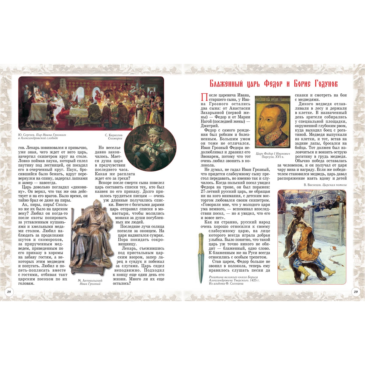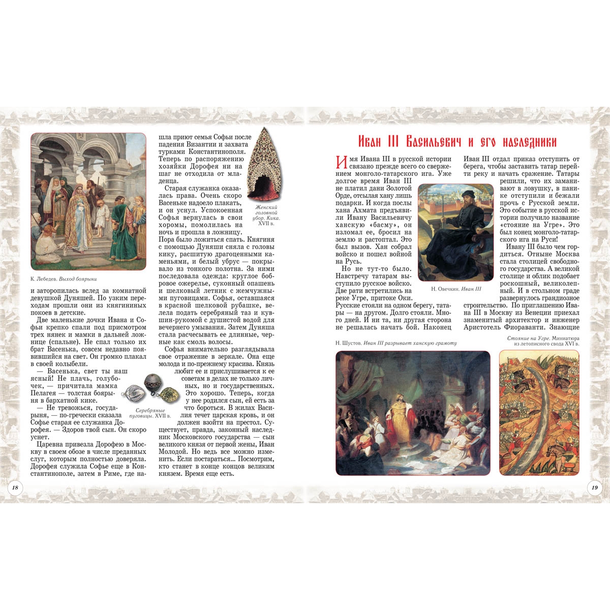«Русский ребенок должен с самого начала почувствовать и понять, что он славянин, сын великого славянского пле¬мени и в то же время сын великого русского народа, имеющего за собою величавую и трагическую историю, перенесшего великие страдания и крушения и выходившего из них не раз к подъему и расцвету» – эти слова русского писателя и философа Ивана Александровича Ильина могли бы стать эпиграфом, объединяющим все книги серии «История России» для детей. Действительно, нет ничего важнее, чем научить юного гражданина гордиться своей страной и ее прошлым. Книга «Московская Русь» о том, как по крупицам собирали московские князья окрестные земли, чтобы родилось сильное Московское государство, ставшее преемником Руси Киевской и Владимирской, как Русь освободилась, наконец, от 300-летнего монголо-татарского ига, как из крошечного, никому не известного селения на Боровицком холме Москва превратилась в столицу могучей державы. Но прежде всего эта книга о людях – князьях и царях, святых подвижниках и воинах, великих зодчих и живописцах – о тех, кто творил историю и создавал культуру России. Книга «Московская Русь», хотя и выходит в серии «История России», ничуть не похожа на учебник истории. Автор, говоря о значительных исторических событиях, смотрит на них глазами своих героев: гордо шествующего по Москве Ивана Калиты, отправляющегося на Куликово поле Дмитрия Донского, великого князя Ивана III, при котором Русь сбросила, наконец, 300-летнее монголо-татарское иго, вспоминающего о своих праведных делах и раскаивающегося в грехах Ивана Грозного, уличных мальчишек, прибежавших к Москве-реке поглазеть на «гуляй-город» и других реальных и вымышленных персонажей. Многочисленные иллюстрации: репродукции икон, портретов московских государей, жанровых картин, написанных замечательными русскими живописцами XIX–XX столетий и нашими современниками, помогают сделать образы живыми и яркими и почувствовать дух Московской Руси XIV–XVI столетий. «Клянусь Вам моей честью, что я ни за что не согласился бы ни переменить родину, ни иметь другую историю, чем история наших предков, какую нам послал Бог», – писал Пушкин а письме к Чаадаеву. Согласитесь, каждый из нас мечтает, чтобы так же думали и чувствовали наши дети. А для этого они должны знать эту самую родную историю. Книга «Московская Русь» поможет совершить увлекательное путешествие в средневековую Москву XIV–XVI столетий: увидеть князя Ивана Калиту, гуляющего по Кремлю, почувствовать тревогу и сомнения Дмитрия Донского перед Куликовской битвой, узнать, как при Иване III Русь сбросила, наконец, ненавистное монголо-татарское иго, подивиться вместе с уличными мальчишками на диковинный «гуляй-город» на Москве-реке, спуститься в сокровищницу Ивана Грозного, поиграть вместе с юным царевичем Алексеем Михайловичем – словом, узнать, а благодаря многочисленным иллюстрациям и увидеть много интересного. Книга «Московская Русь», изданная в серии «История России», – это занимательное путешествие в русское Средневековье, которое представлено в ярких образах московских князей и царей, святых и воинов, живописцев и зодчих XIV–XVI столетий. При стандартном объеме книга содержит 146 цветных иллюстраций. Все это делает издание полезным и интересным для школьников младшего и среднего школьного возраста. об авторе Роньшин