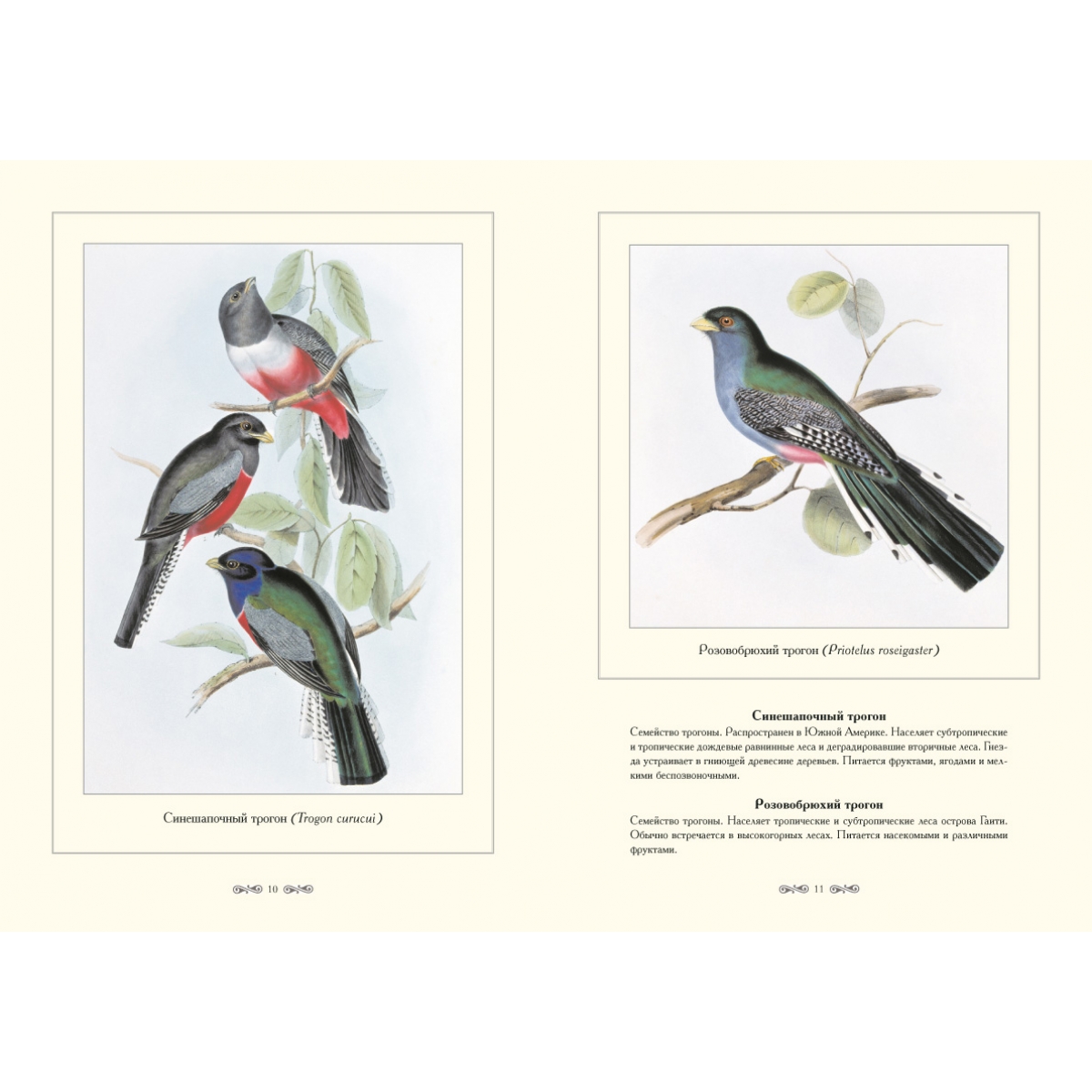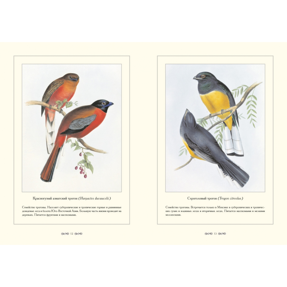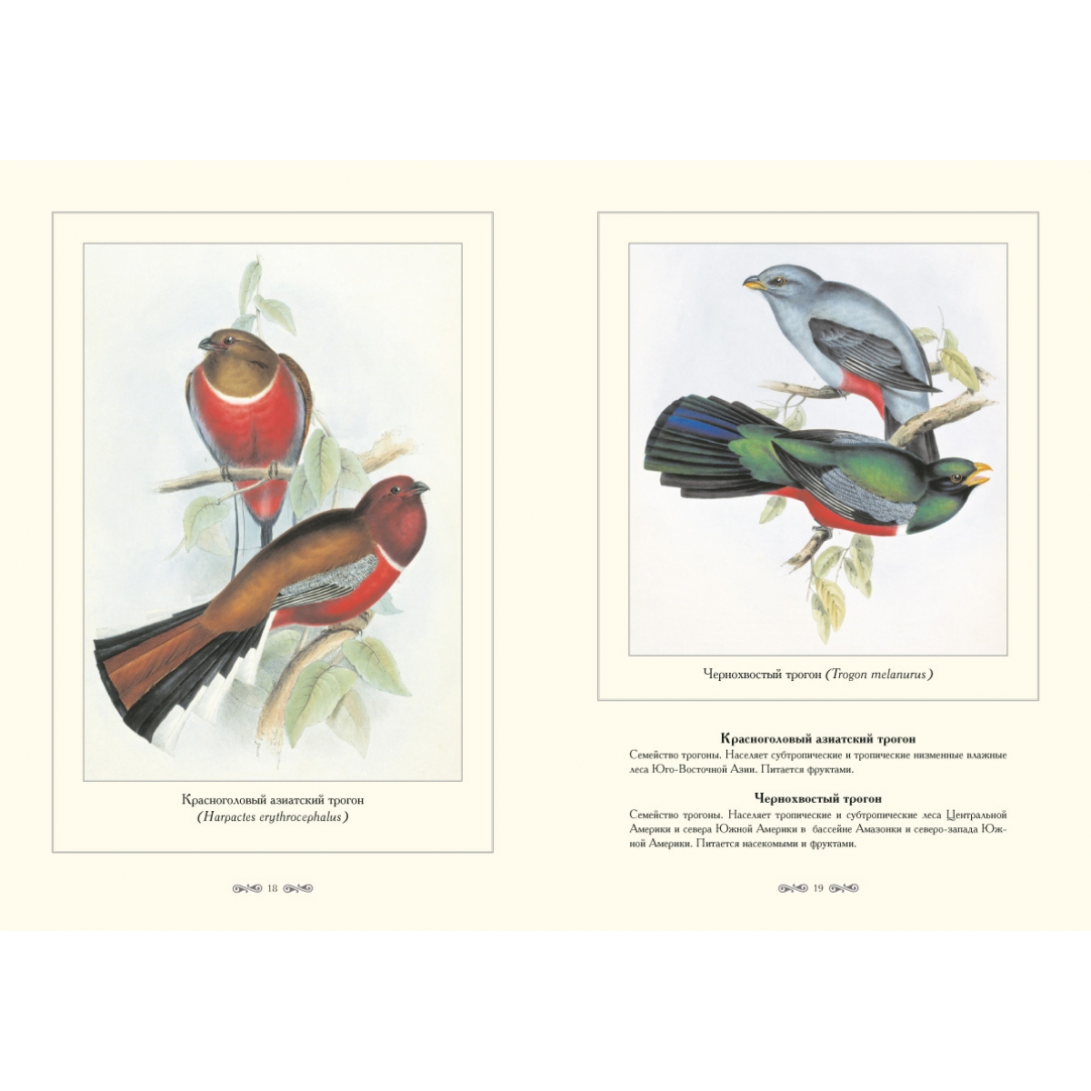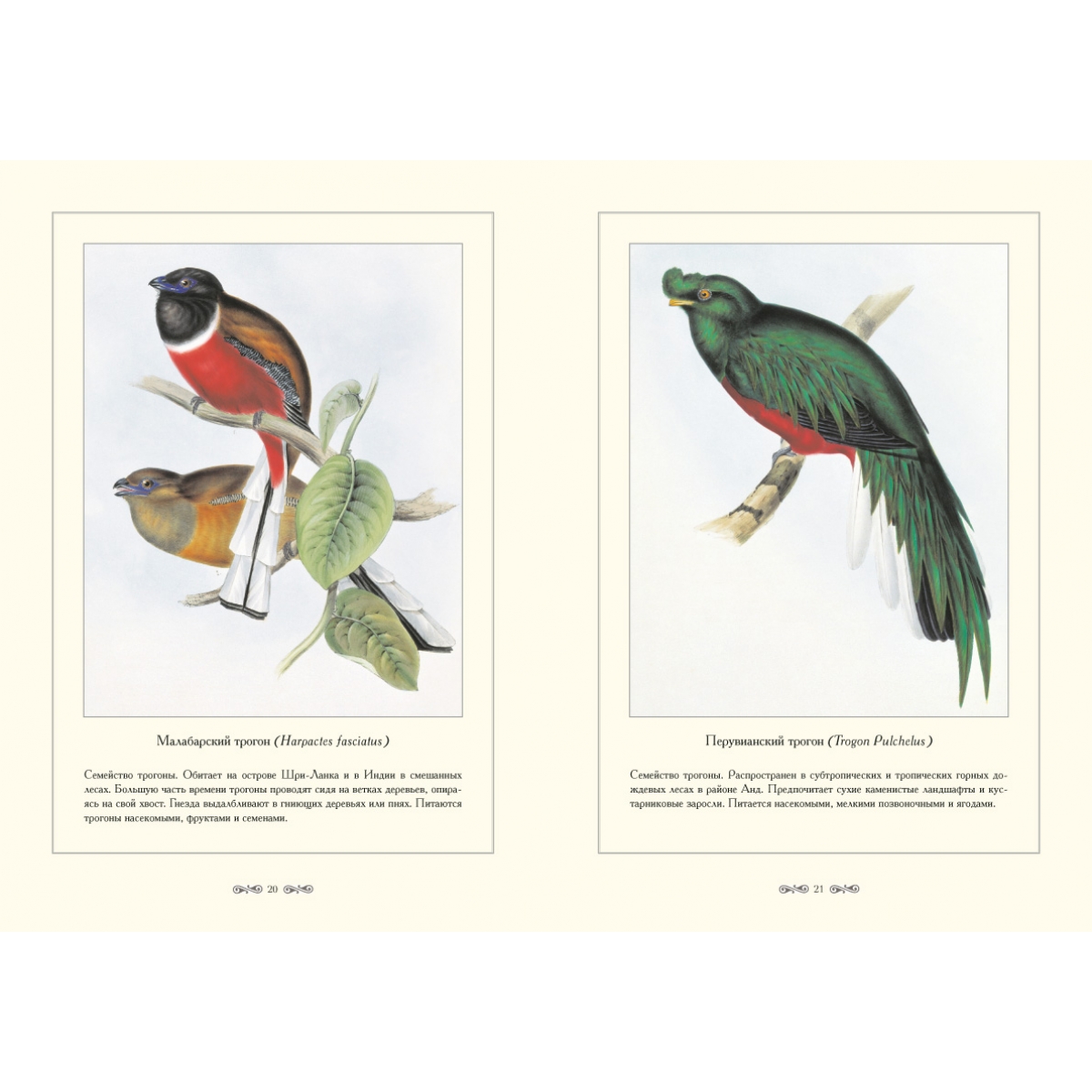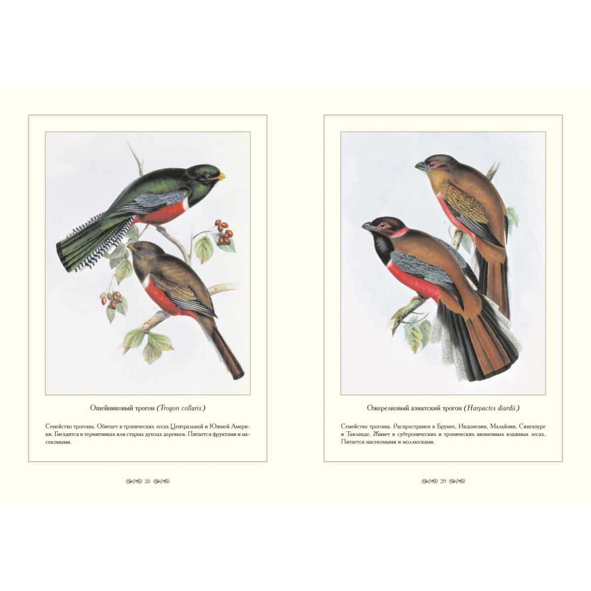 Птицы, о которых рассказывается в этой книге – трогоны, лесные обитатели, которые населяют Африку, Южную Азию и Америку. Они встречаются либо в одиночку, либо парами в жарких долинах и в прохладных поясах высоких гор. Немногие виды живут на лесных полянах, некоторые проникают в культурный ландшафт – гнездятся на территории кофейных плантаций. Трогоны занимают для размножения естественные дупла, реже делают дупла сами. Работы по устройству гнезда и выкармливанию птенцов выполняют оба родителя. Трогоны питаются и растительными и животными кормами. Африканские трогоны едят главным образом насекомых, американские виды предпочитают фрукты и ягоды.