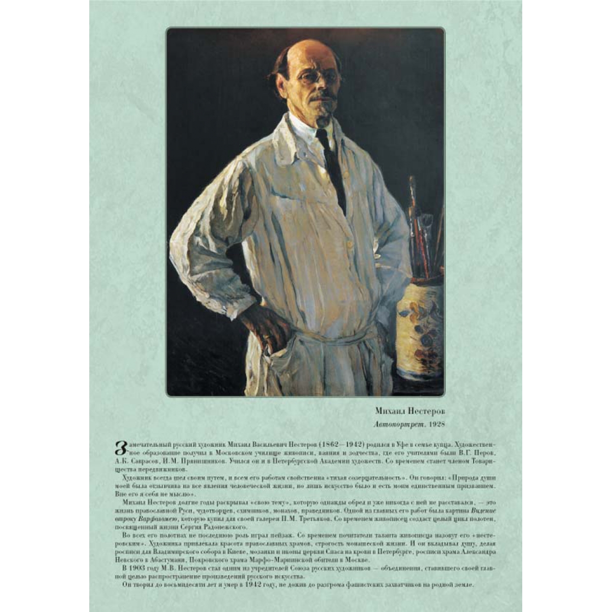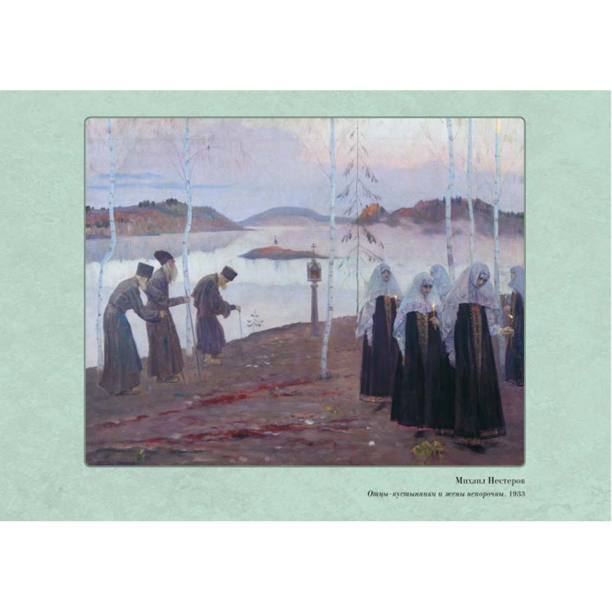 М.В. Нестеров писал скромные березки, вербы с пушистыми сережками, приглушенную зелень садов, спокойные воды рек... Он говорил: «Я избегал изображать так называемые сильные страсти, предпочитая им наш тихий пейзаж, человека, живущего внутренней жизнью». Современники называли его пейзажи, которые были близки по стилю и духу работам Левитана, «нестеровскими». Картина Видение отроку Варфоломею положила начало целому циклу полотен, посвященных жизни Сергия Радонежского, образ которого стал для художника своего рода нравственным идеалом. Он любил эту свою работу и говорил: «Жить буду не я. Жить будет Отрок Варфоломей...» В цикл вошло 15 больших полотен. Расписывал художник стены Владимирского собора в Киеве. Некоторое время он провел в Соловецком монастыре, и «монастырская» тема часто звучала в его картинах. Он писал простых монахов и всегда выводил их «из келий, из церквей, из монастырских стен... в лесную глушь...».