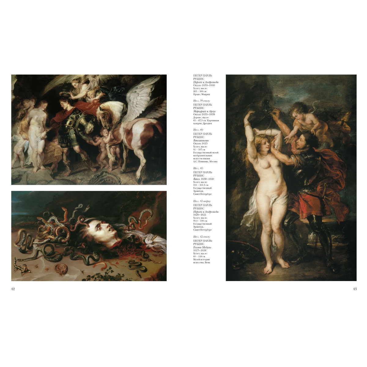 Авраам и Мельхиседек; Автопортрет; Автопортрет; Автопортрет с Изабеллой Брант; Адам и Ева в раю; Амур и Психея; Битва амазонок; Благовещение; Большой Страшный суд; Вакх; Вакханалия; Венера перед зеркалом; Вирсавия; Возвращение Дианы с охоты; Возвращение крестьян с полей; Возчики камней; Воскресение Христа; Герцог Лерма на коне; Голова Медузы; Дидона и Эней; Жизнь французской королевы Марии Медичи (Ангулемский договор, Анжерский мир. Апофеоз Генриха IV, Бегство из Блуа, Бракосочетание Генриха IV и Марии Медичи, Взятие Жюльера, Возмужание Людовика XIII, Воспитание Марии Медичи, Встреча в Лионе, Генрих IV получает портрет Марии Медичи, Коронация Марии Медичи, Обмен между принцессами, Прибытие Марии Медичи в Марсель, Примирение Марии Медичи с сыном, Рождение Людовика XIII, Счастье регенства, Учреждение регенства Марии Медичи); Закат с пастухом и стадом; Избиение младенцев; Королева, как богоизбранный правитель Франции, ведет переговоры с богами о поддержке союза с Испанией; Крестьянский танец; Мадонна в гирлянде цветов; Медный змий; Меркурий и Аргус; Минерва защищает мир от Марса (Мир и война); Мученичество святого Ливинуса; Мученичество святого Себастьяна; Оплакивание Христа; Осенний пейзаж с видом на замок Стен ранним утром; Отцелюбие римлянки (Кимон и Перо); Охота на бегемота и крокодила; Персей и Андромеда; Персей и Андромеда; Поклонение Мадонне; Портрет Бриджиды Спинола-Дориа; Портрет Вероники Спинола-Дориа; Портрет графа Томаса Говарда, графа Арундельского; Портрет Деборы Кип с детьми; Портрет Джанкарло Дориа; Портрет Елены Фоурмен (в свадебном платье); Портрет Елены Фоурмен с дочерьми; Портрет камеристки инфанты Изабеллы; Портрет Марии Медичи; Портрет Яна Гаспара Гевартса; Последствия войны; Похищение Ганимеда; Похищение Гипподамии; Похищение дочерей Левкиппа; Похищение Прозерпины; Праздник Венеры; Пророк Даниил во рву львином; Пьяный Геркулес; Распятие (Удар копьем); Распятие Христа. Триптих; Рождество; Рубенс с Еленой Фоурмен в саду; Сад любви; Самсон и Далила; Сатиры и нимфы; Святое семейство; Святое семейство; Святое семейство; Святое семейство с ягненком; Святое семейство со святой Анной; Святой Георгий и дракон; Святой Иероним; Снятие с креста; Снятие с креста. Триптих; Соломенная шляпка (Сусанна Фоурмен); Сотворение Млечного Пути; Союз Земли и Воды; Статуя Цереры; Суд Париса; Суд Париса; Сусанна и старцы; Три Грации; Христос в терновом венке; Художник с женой и сыном; Четыре философа; Четыре части света; Шубка (Елена Фоурмен)