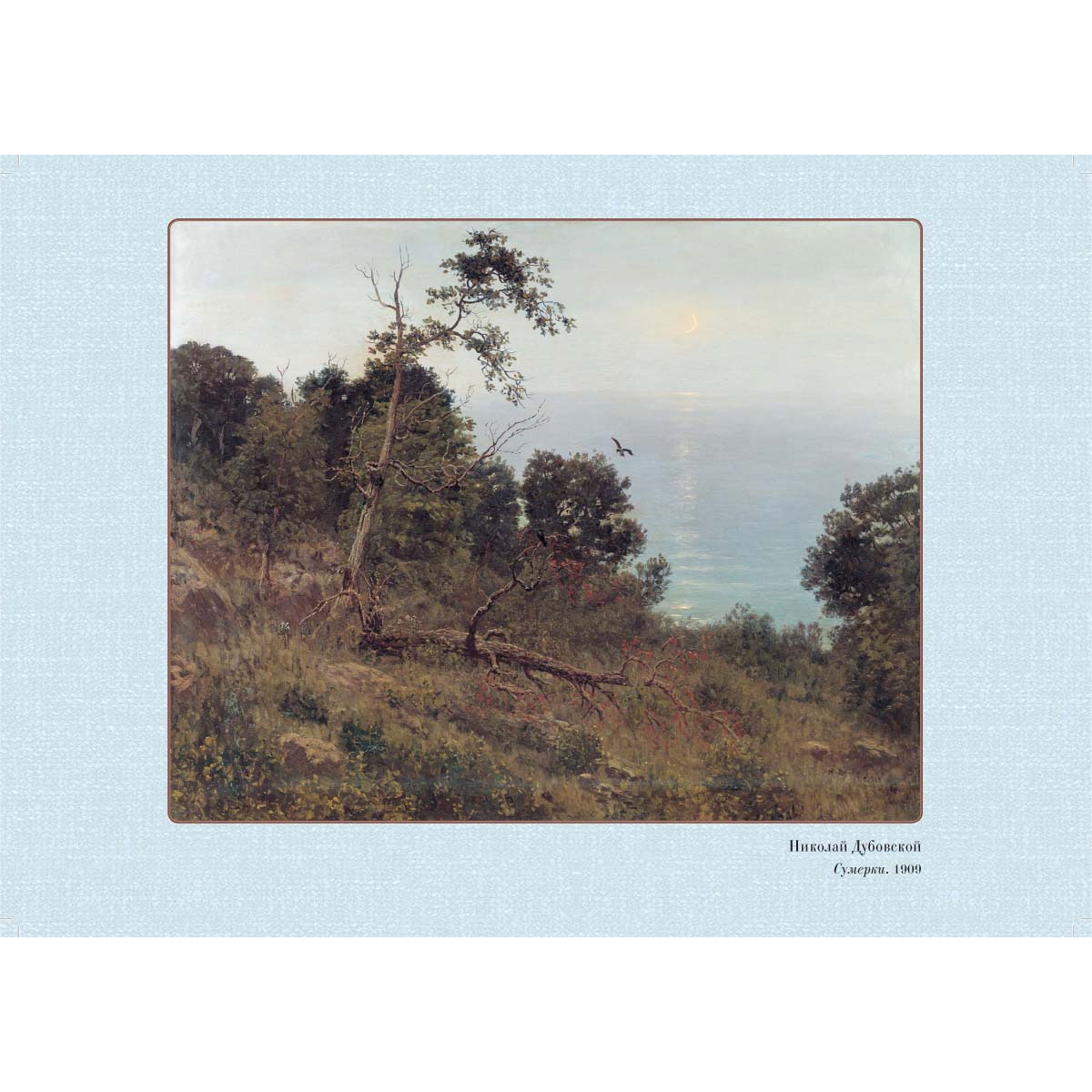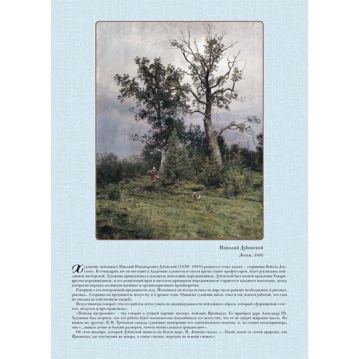 Один из самых плодотворных этапов в творческой жизни Николая Никаноровича Дубовского (1859–1918) был связан с его принадлежностью к движению передвижников. Он выставляет свои картины на выставках, и его пейзажи становятся одними из самых востребованных. Художник много путешествовал, привозил из зарубежных поездок эскизы, в которых воспроизводил запомнившиеся ему красивые места, зарисовывал произведения искусства, но его руки так и не доходили до того, чтобы сделать из них большие полотна. Создатель «пейзажа настроения», Дубовской писал просторы России – они согревали его сердце, будили творческое воображение. Поклонники его таланта отмечают особенности пейзажного образа, который он создавал «светом, воздухом и пространством».