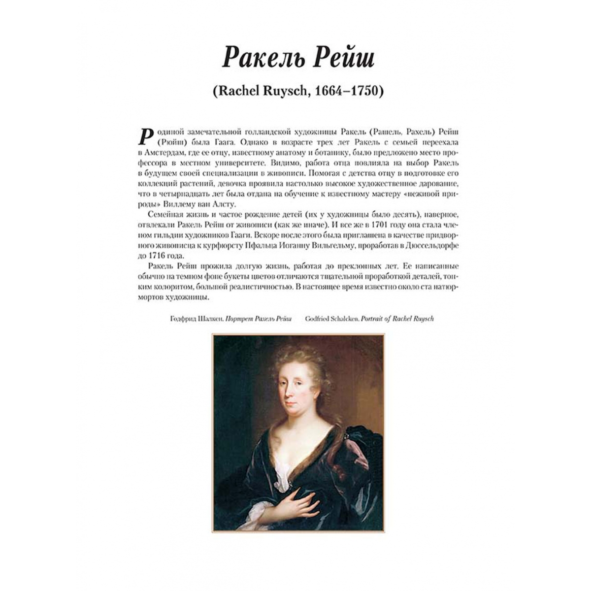 Родиной замечательной голландской художницы Ракель (Рашель, Рахель) Рейш (Рюйш) была Гаага. Однако в возрасте трех лет Ракель с семьей переехала в Амстердам, где ее отцу, известному анатому и ботанику, было предложено место профессора в местном университете. Видимо, работа отца повлияла на выбор Ракель в будущем своей специализации в живописи. Помогая с детства отцу в подготовке его коллекций растений, девочка проявила настолько высокое художественное дарование, что в четырнадцать лет была отдана на обучение к известному мастеру «неживой природы» Виллему ван Алсту.