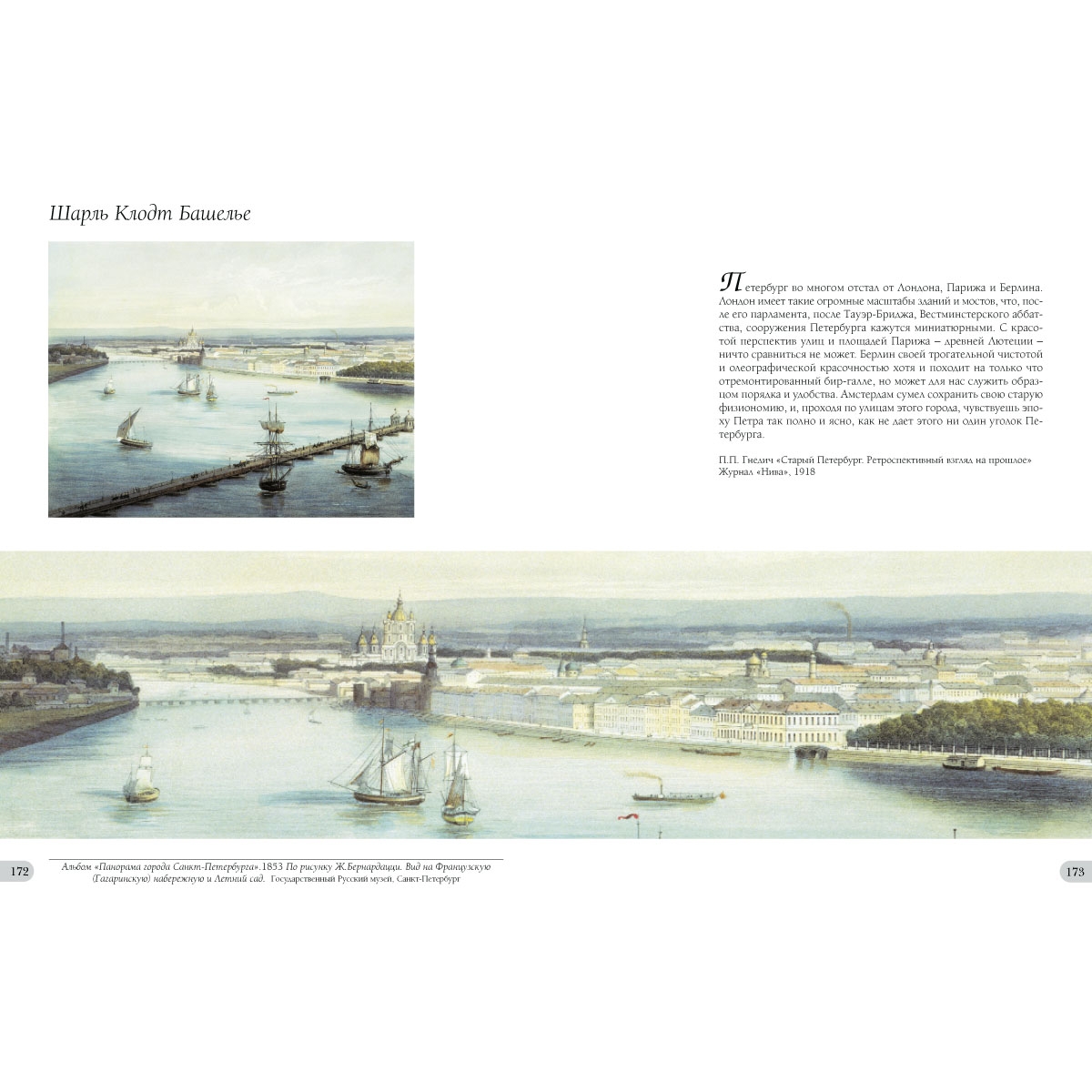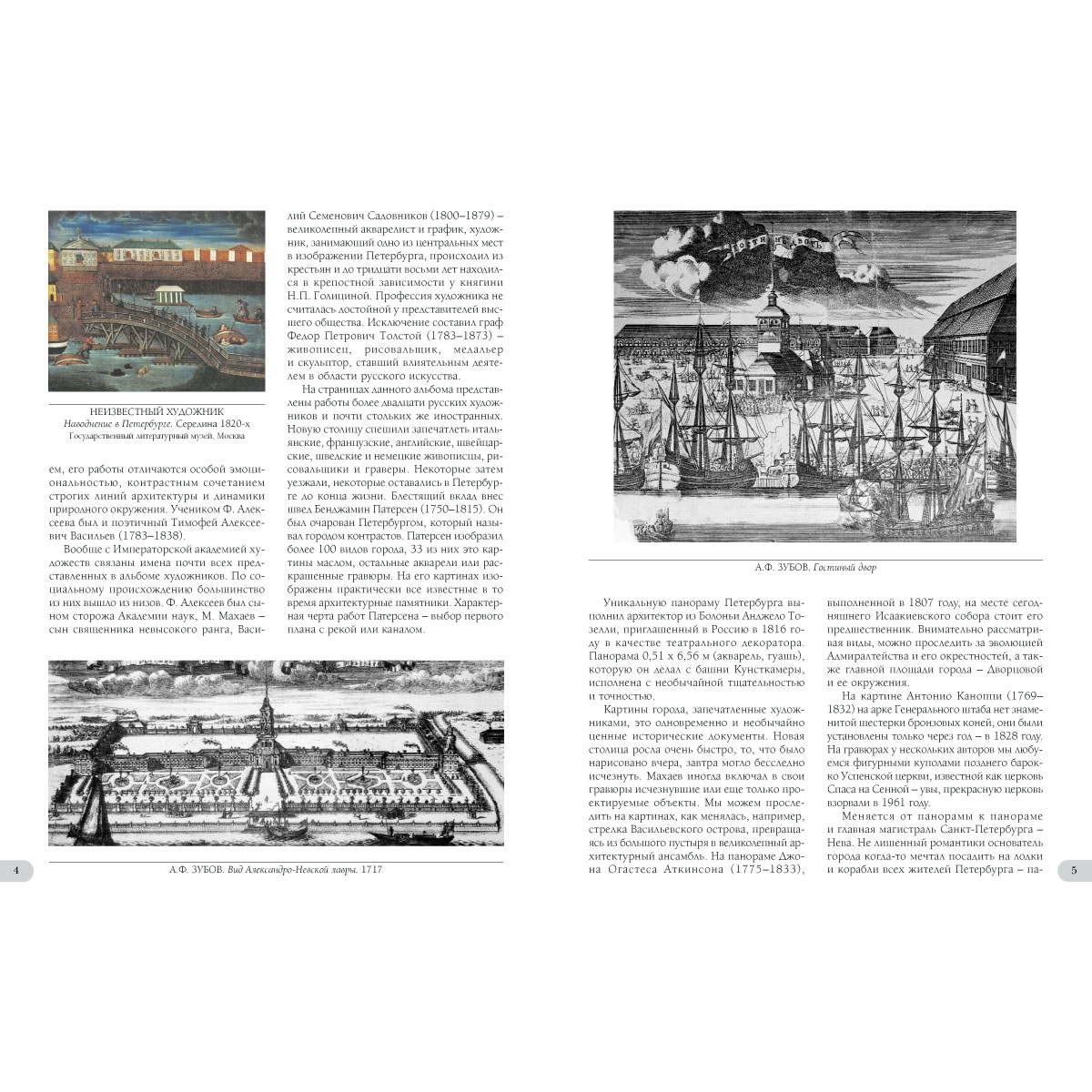 Виды Санкт-Петербурга сопровождаются в альбоме выдержками из произведений русских писателей и поэтов. Тексты углубляют зрительное повествование, позволяют больше узнать о том, как формировалась и росла новая столица России, и одновременно оживляют образ этого большого, величественного, неповторимого по красоте города и помогают собрать в единое целое глубоко личное и реальное.