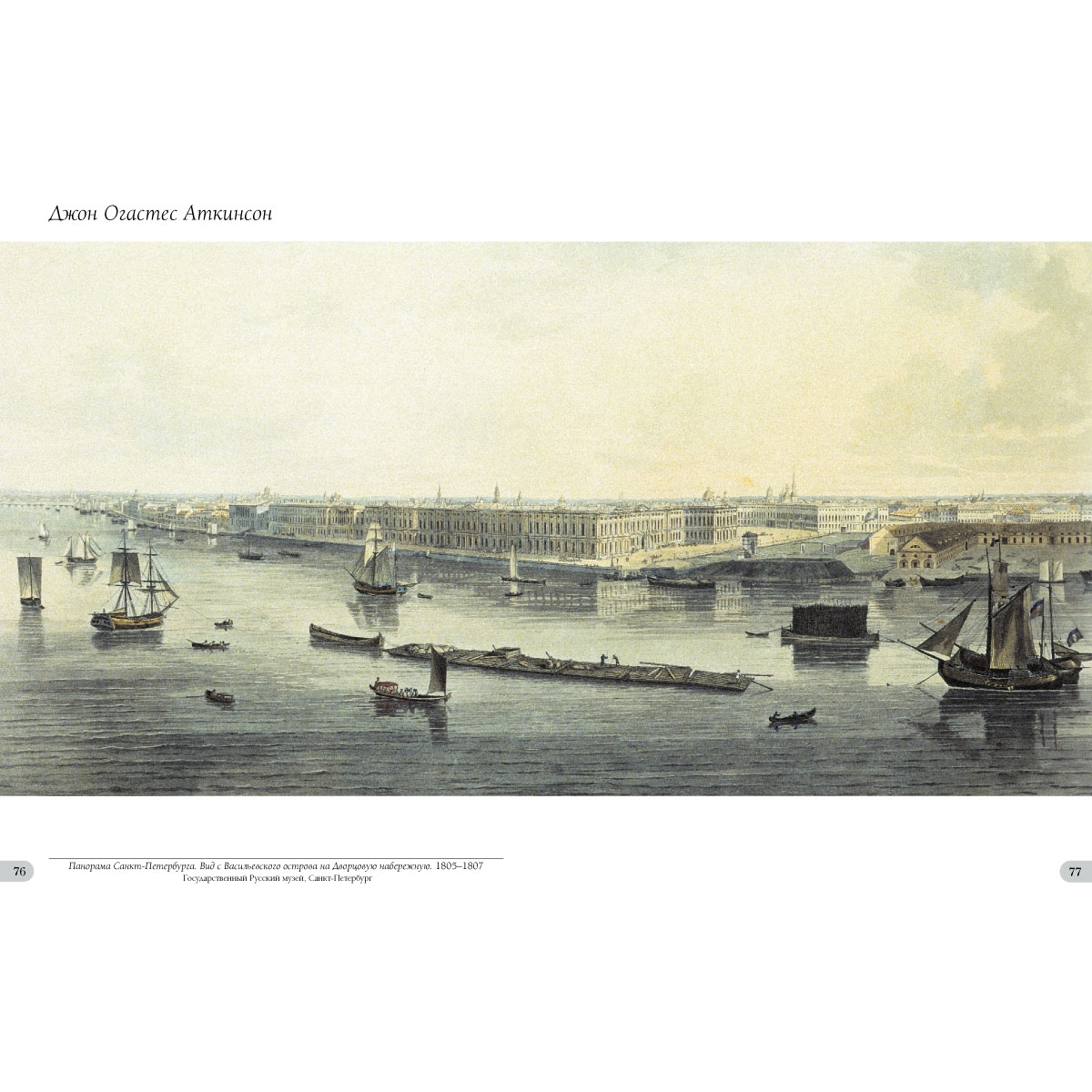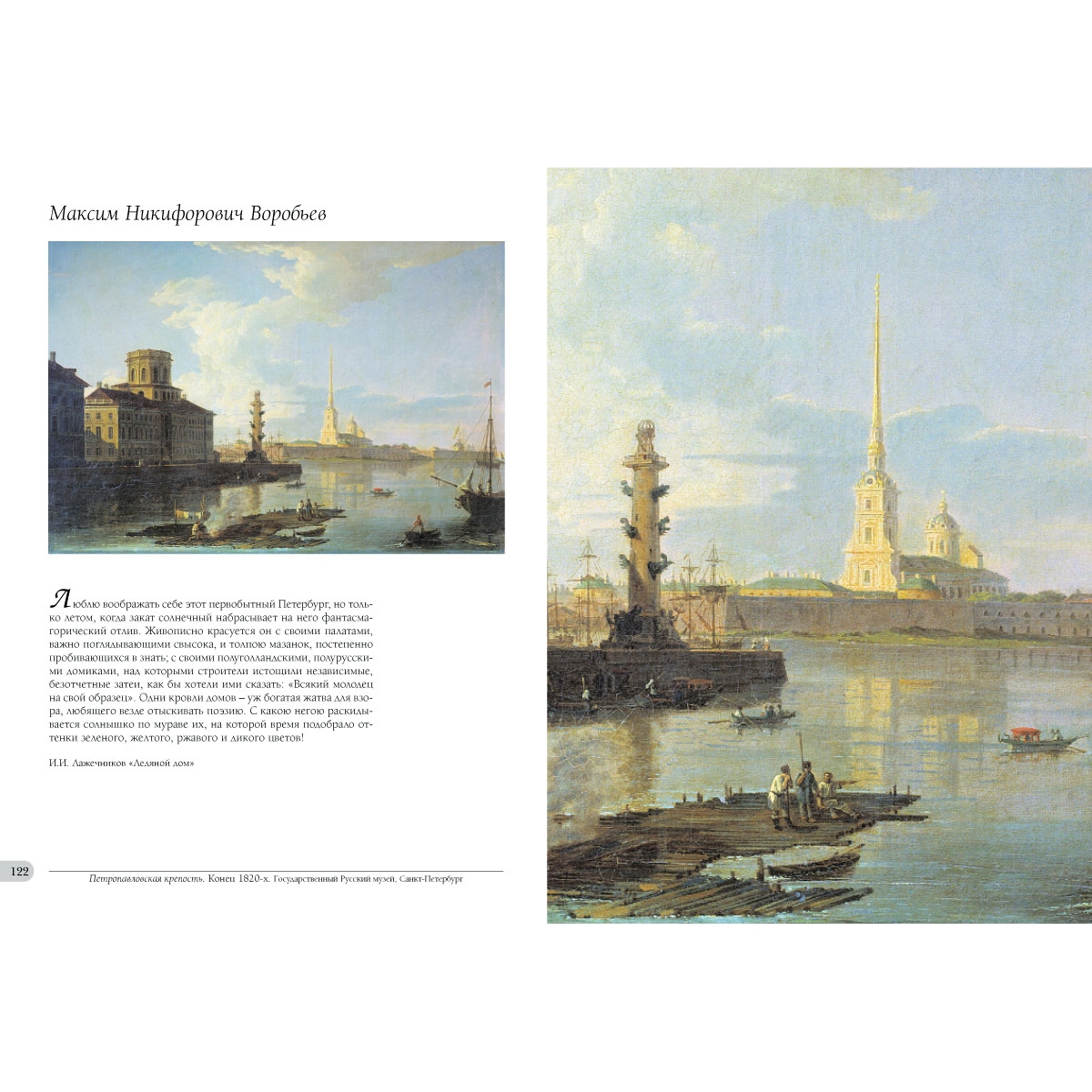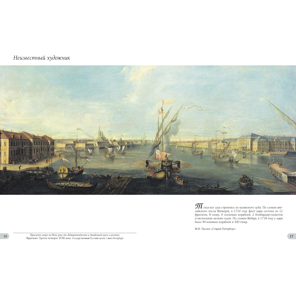 Великая Нева – любимый сюжет и украшение почти всех картин. Ее набережные, восходы, закаты, ее безмятежный покой и ее туманы и бури. Ее лодки, паруса, плоты и корабли, начиная от галер и многопалубных гигантов, сходивших с Адмиралтейской верфи, и до пароходиков ХIХ века с их высокими дымящимися трубами. Бесконечный сюжет для разглядывания и изучения. Некоторые художники, представленные в альбоме, были маринистами, например, Алексей Петрович Богомолов (1824–1896) – художник Главного морского штаба, Лев Феликсович Лагорио (1827–1905) и Федор Федорович Баганц (1834–1873), который даже совершил однажды кругосветное плавание.