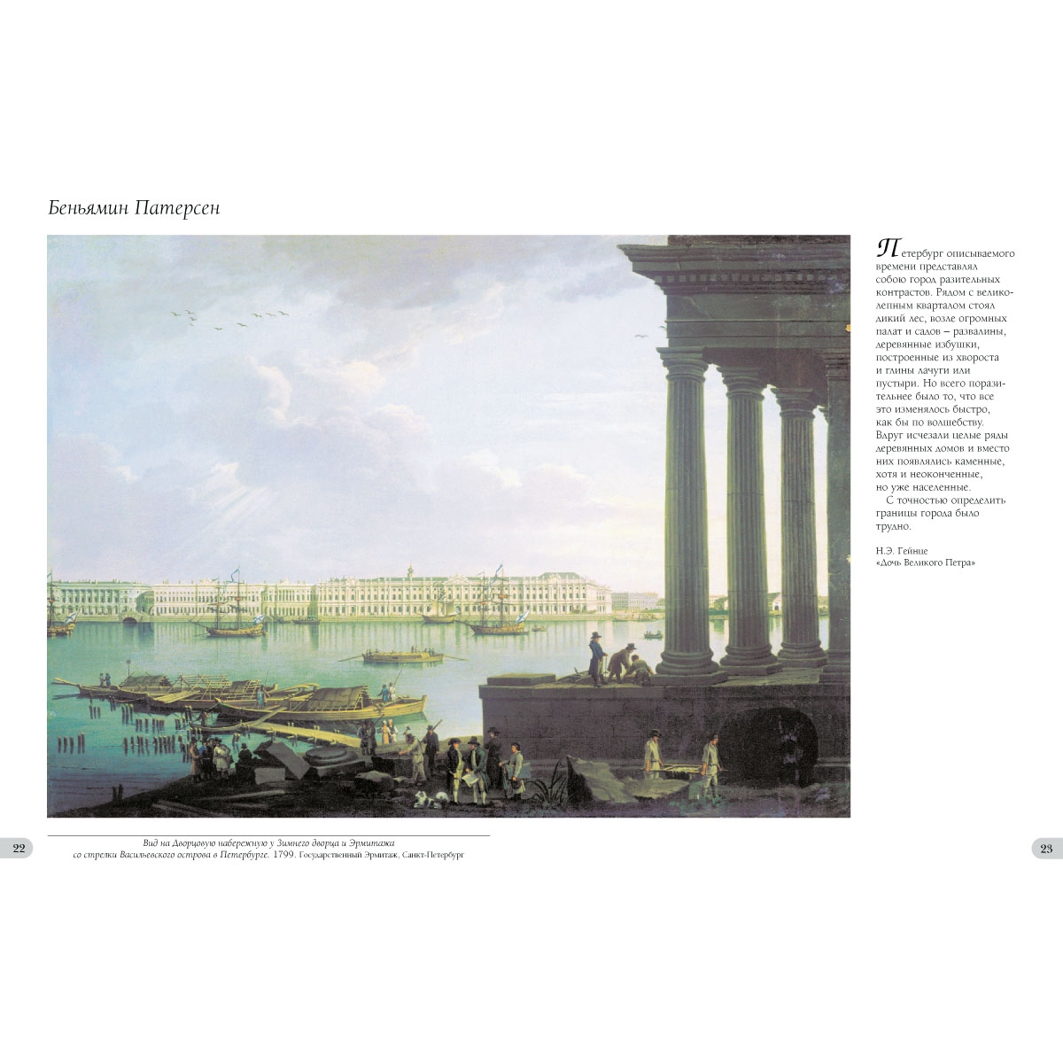 На страницах данного альбома представлены работы более двадцати русских художников и почти стольких же иностранных. Новую столицу спешили запечатлеть итальянские, французские, английские, швейцарские, шведские и немецкие живописцы, рисовальщики и граверы. Некоторые затем уезжали, некоторые оставались в Петербурге до конца жизни. Блестящий вклад внес швед Бенджамин Патерсен (1750–1815). Он был очарован Петербургом, который называл городом контрастов. Патерсен изобразил более 100 видов города, 33 из них – это картины маслом, остальные акварели или раскрашенные гравюры. На его картинах изображены практически все известные в то время архитектурные памятники. Характерная черта работ Патерсена – выбор первого плана с рекой или каналом.