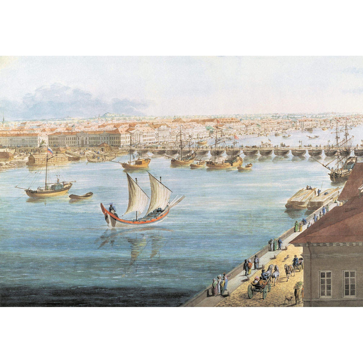 Меняется от панорамы к панораме и главная магистраль Санкт-Петербурга – Нева. Не лишенный романтики основатель города когда-то мечтал посадить на лодки и корабли всех жителей Петербурга – парусные, весельные лодки и корабли заскользили бы по его рекам и каналам. Петр даже запрещал строить мосты. Но жизнь взяла свое, и просторы Невы рассекли длинные плашкоутные (на баржах) мосты, которые разбирали на зиму. На картинах они изображены в разных вариантах и на разных местах реки, также можно заметить, как менялись их формы. Первым приказал возвести такой мост Александр Данилович Меншиков, дворец которого стоял на Васильевском острове. Он же приказал мост быстро разобрать, когда ему грозила конфискация имущества.