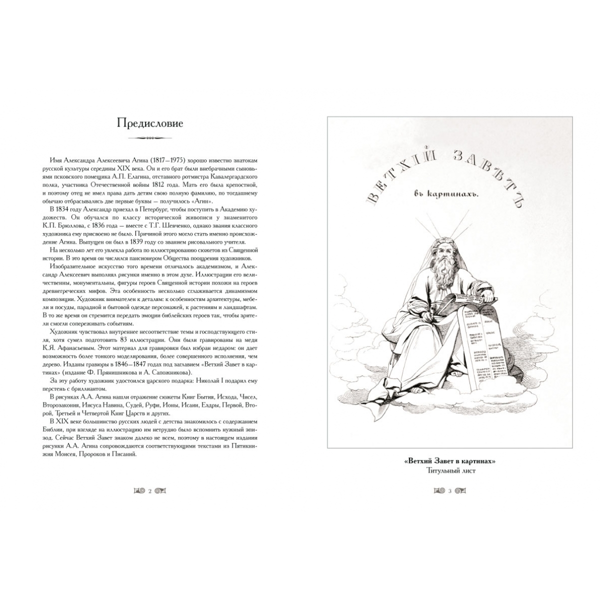А.А. Агин – основоположник русской жанровой иллюстрации. В середине XIX века он прославился циклом из ста рисунков к поэме Н.В. Гоголя «Мертвые души». До этого он создал 83 иллюстрации к Ветхому Завету, с которых были выполнены гравюры на меди. В настоящем издании эти рисунки даны с соответствующими библейскими текстами.