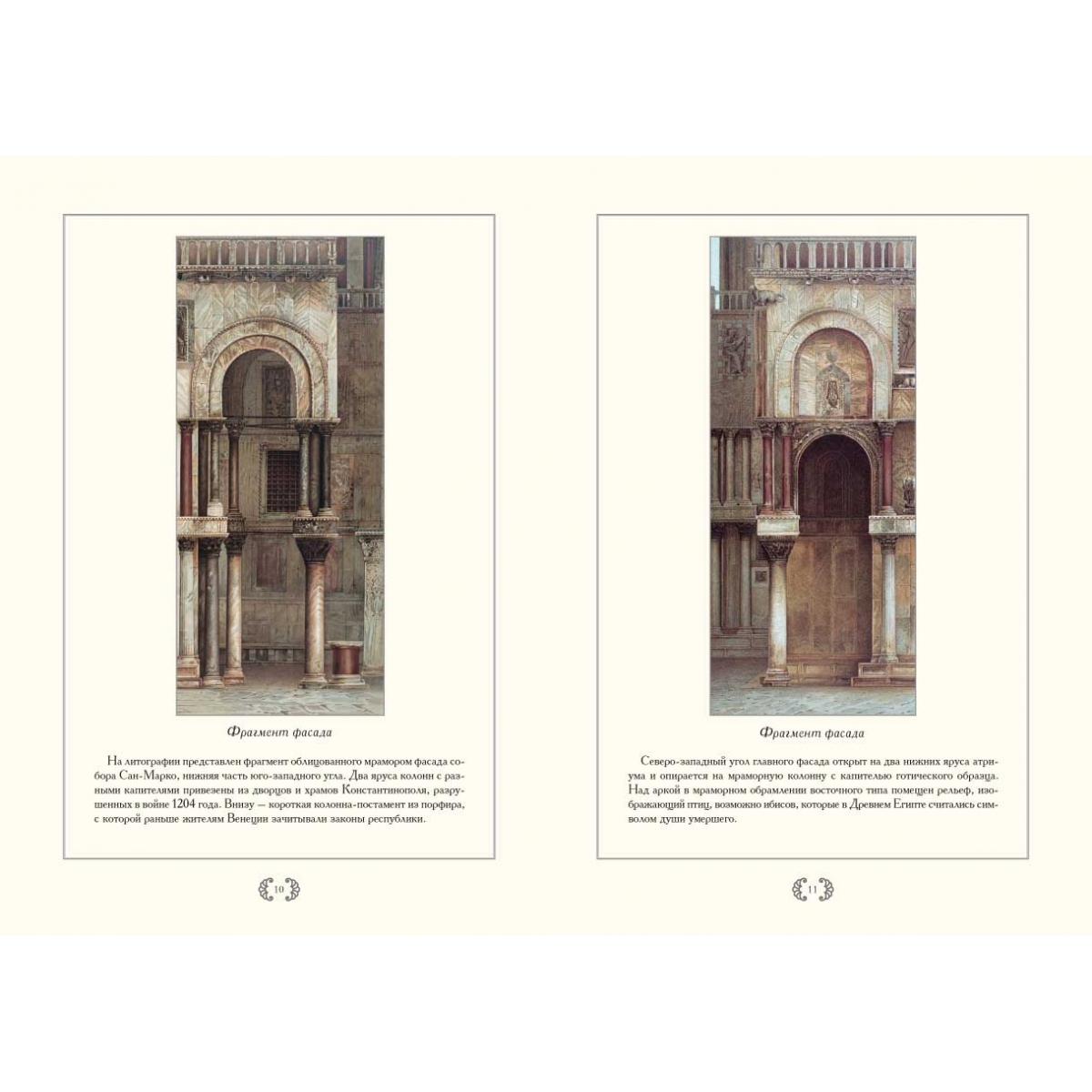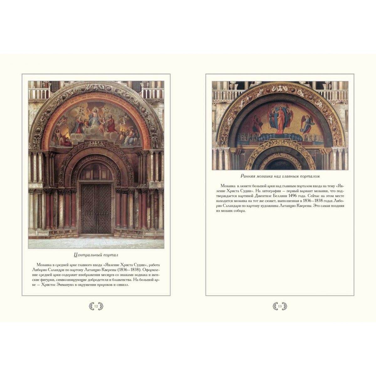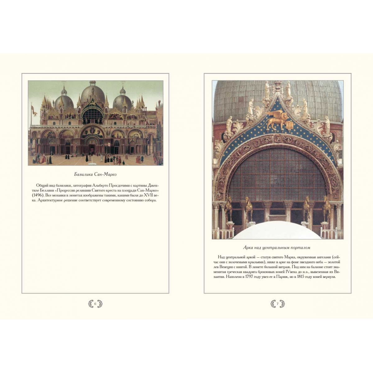 В книге представлены хромолитографии, изображающие общие виды, а также фрагменты и детали экстерьера, интерьера и мозаик кафедрального собора города Венеции – базилики Сан-Марко.
