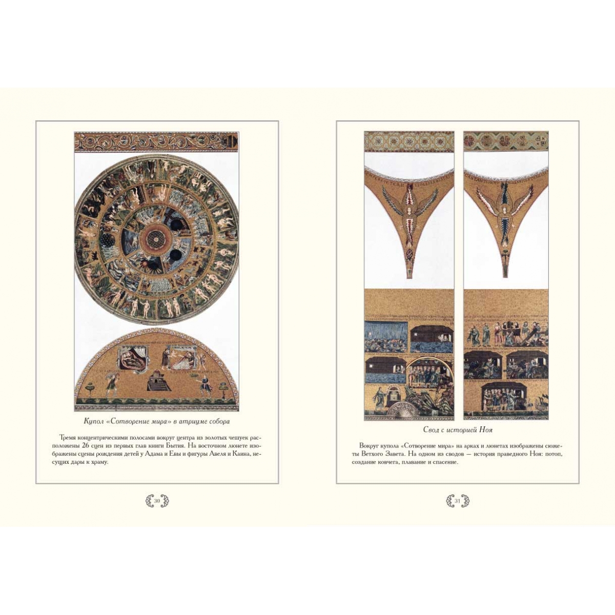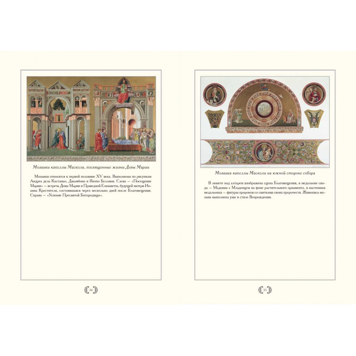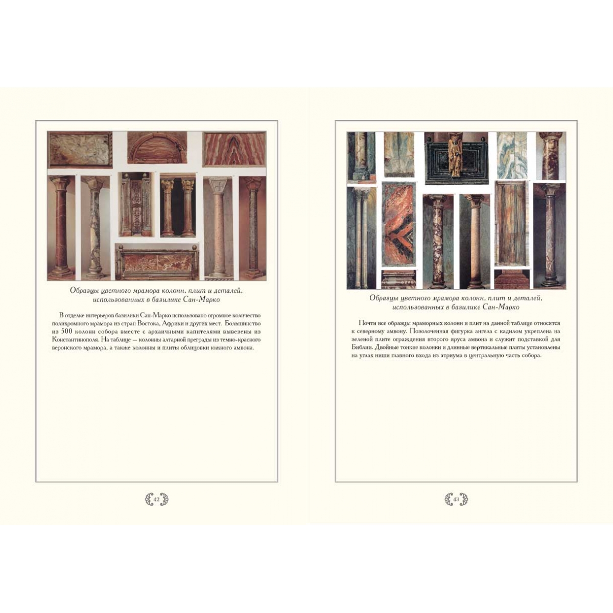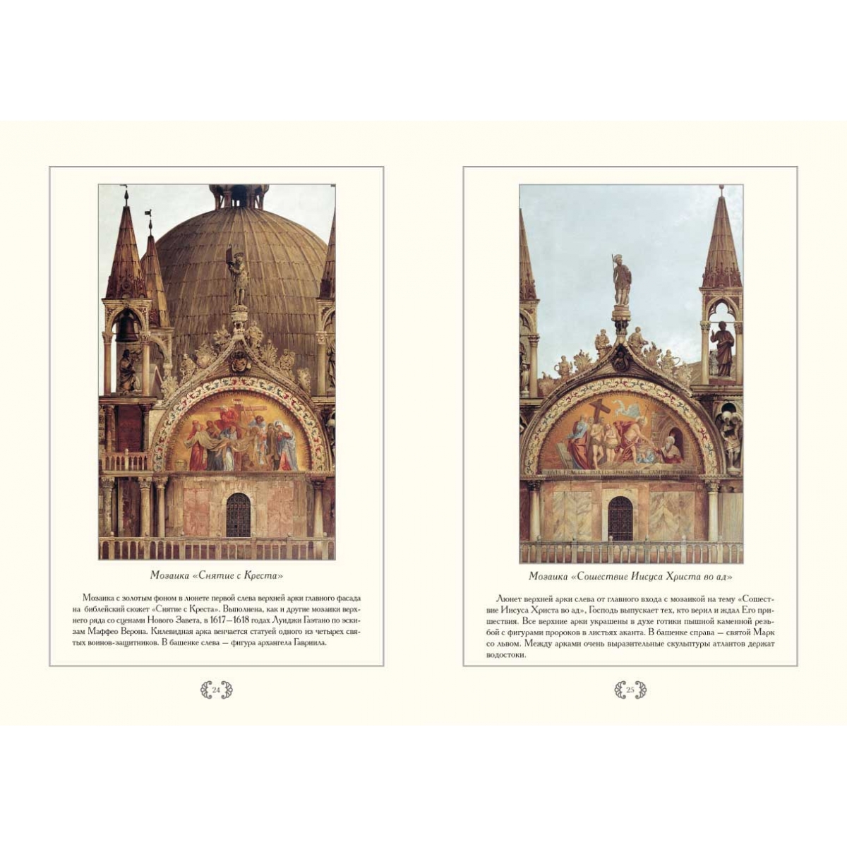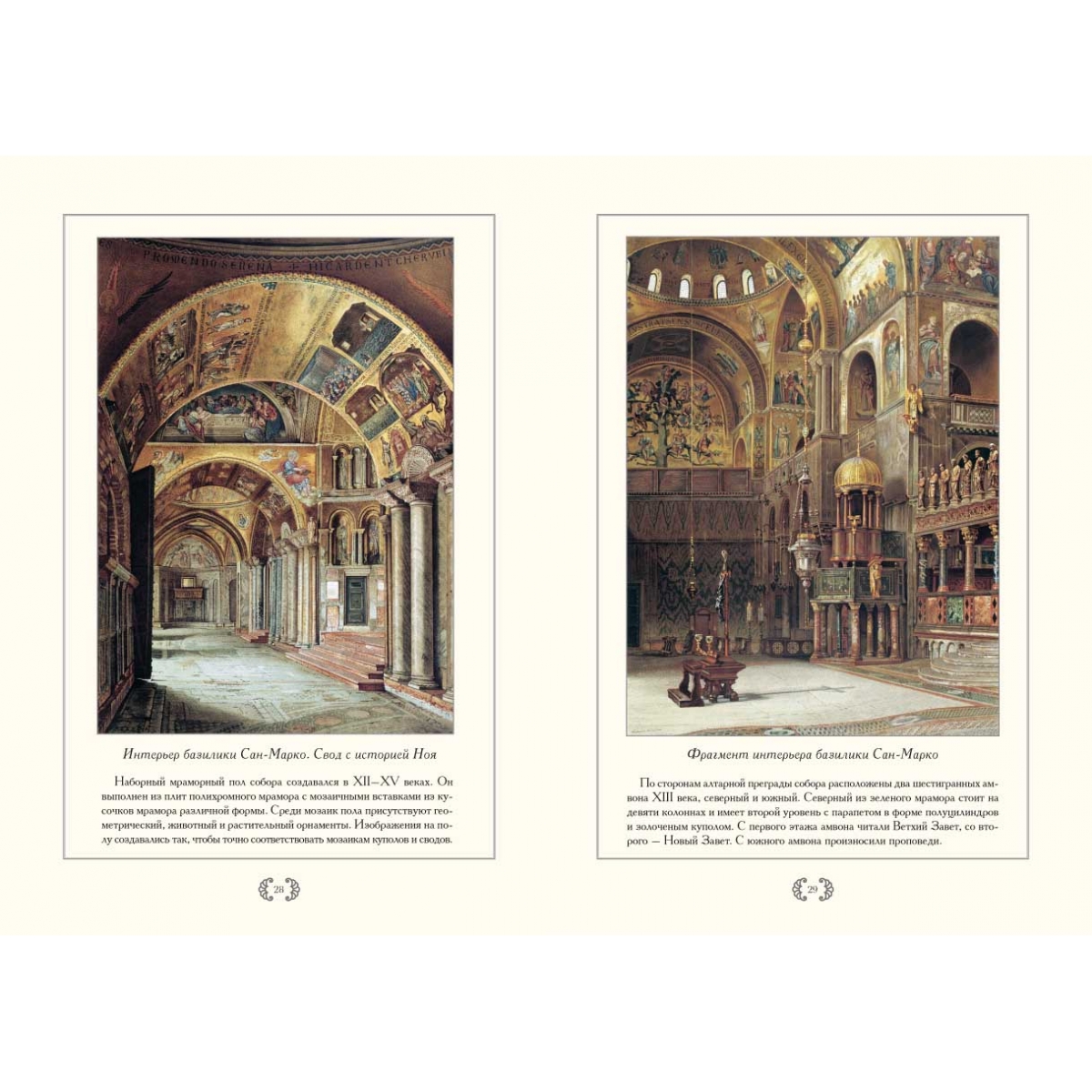 Альбом посвящен базилике Сан-Марко, главному собору Венеции. Основу альбома составляют литографии фрагментов и деталей собора, являющиеся частью монументального труда «Базилика Сан-Марко в Венеции» редактора и издателя иллюстрированных книг Фердинандо Онганиа (1842–1911). Онганиа начал этот труд, увидев, как во время реставрации южной части собора Сан-Марко (1865–1875 гг.) были сняты и частично потеряны мозаики интерьеров капеллы Дзен и Баптистерия. На протяжении 13 лет, с 1877 по 1893 год он осуществил грандиозное издание, наиболее полно запечатлевшее экстерьер и интерьеры собора. Работа состояла из 21 тома, включая 16 большеформатных папок с иллюстрациями и текстом и тома с художественно-историческими описаниями, финансовыми и архивными документами. К исследованию и изображению памятника Онганиа привлек известных историков, архитекторов и рисовальщиков, отразивших каждую деталь собора. Издание имело огромный успех, издатель в 1889 году был награжден медалью короля Умберто I. Самый красивый храм Венеции – базилика Сан-Марко (собор Святого Марка) строился, достраивался и украшался с ХI по XV вв. Родившийся на границе двух миров – Востока и Запада собор впитал черты архитектуры разных времен. Внутри его стены и купола сияют от золота мозаик. Детали богатой отделки интерьера выполнены в характере многих эпох: византийской, романской, готической, ренессанса и более поздних. Но разновременные и разностильные элементы вместе здесь создают удивительно цельный образ, не имеющий аналогов и повторений. Такой собор мог появиться только в Венеции.