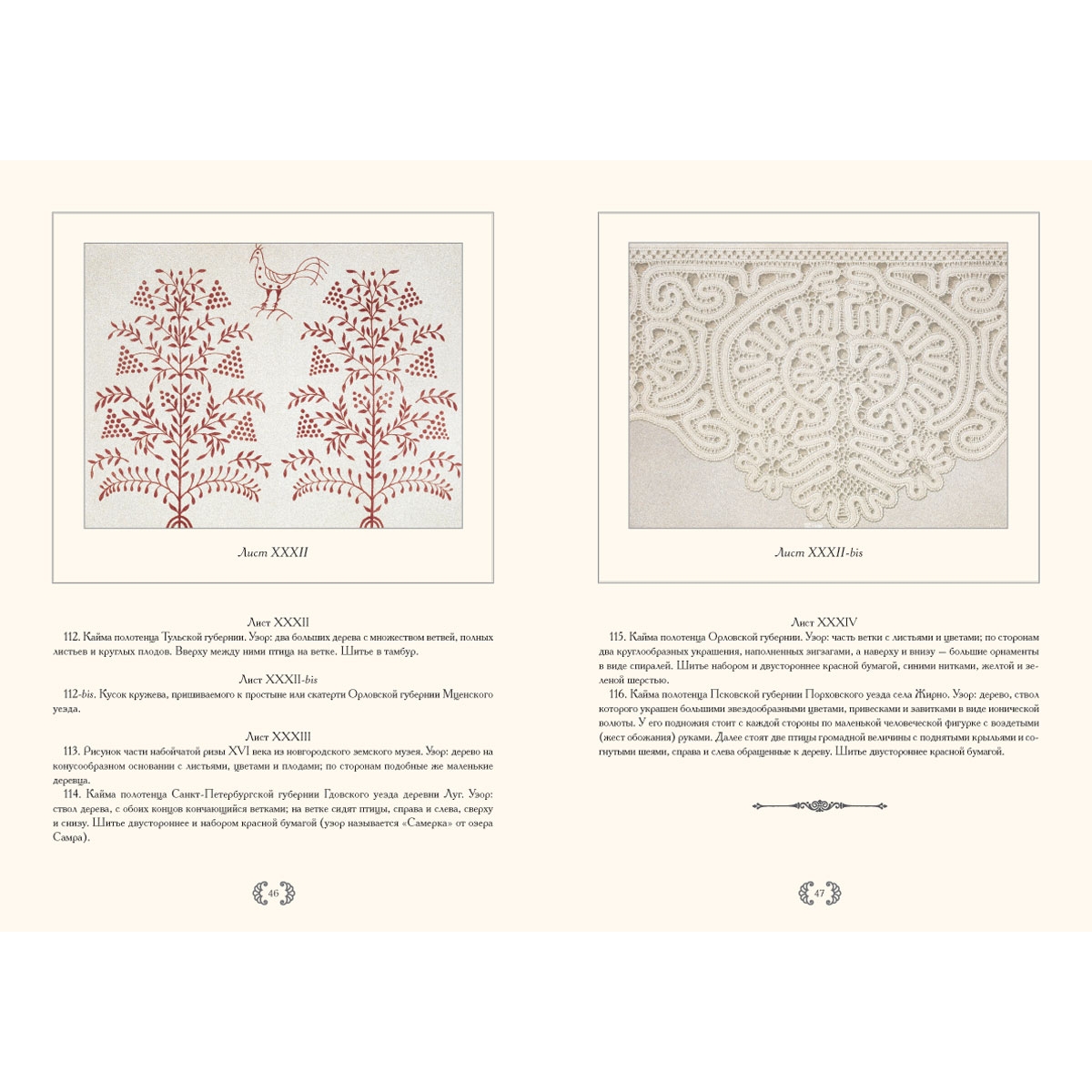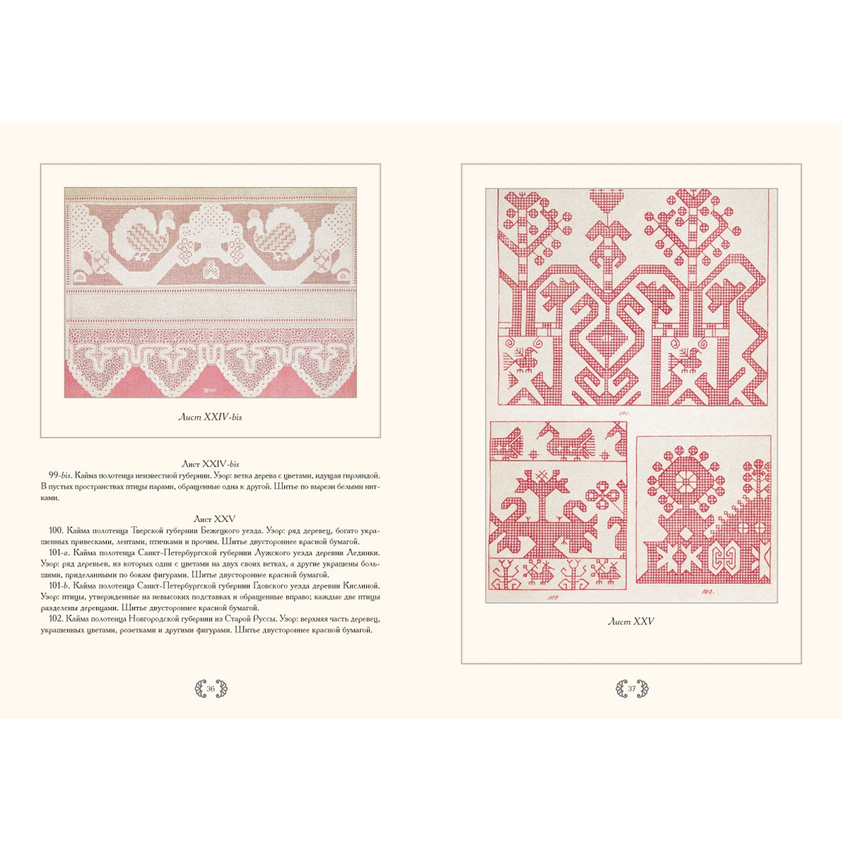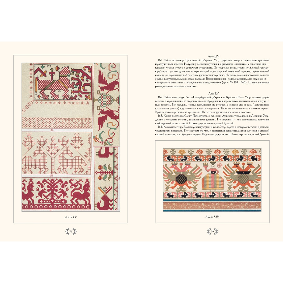 В альбоме представлены образцы русской народной вышивки из разных губерний России: «из северного края: губерний Новгородской, Псковской, Тверской, Олонецкой, Вологодской, Архангельской, Санкт-Петербургской; из восточного края: губерний Владимирской, Ярославской, Костромской, Нижегородской, Симбирской, Пензенской, Воронежской, Саратовской; из западного края: губерний Смоленской, Витебской, Гродненской; наконец из центральных наших губерний: Московской, Орловской, Тульской».