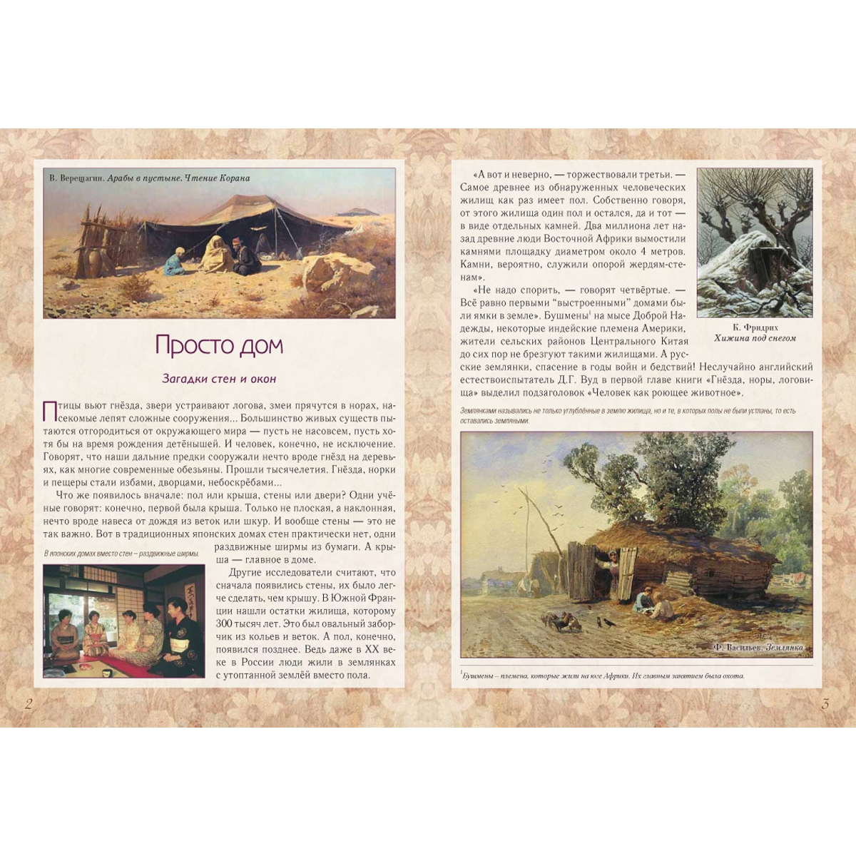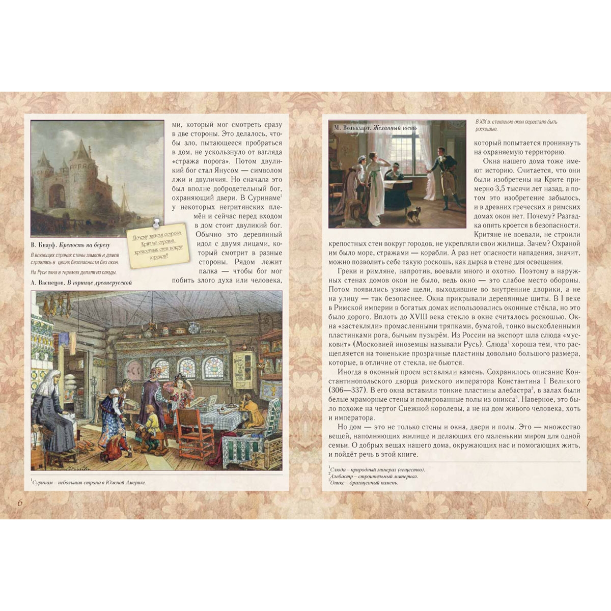 У каждого народа свои представления об удобстве и красоте родного дома. Например, японцы обходятся… без стен. Захотел уединиться – раздвинул бумажную ширму и можешь спать, читать, размышлять о жизни. На Руси когда-то жили в землянках – климат в нашей полосе холодный, так что не согреешься в доме с бумажными стенами. Кто-то строил дома из глины, кто-то из дерева. И все всегда старались сделать его теплым, крепким, красивым. Из книги можно узнать историю вещей, к которым люди привыкли и давно перестали ценить их удивительные свойства. Попробуем разгадать загадки обычных вещей.
