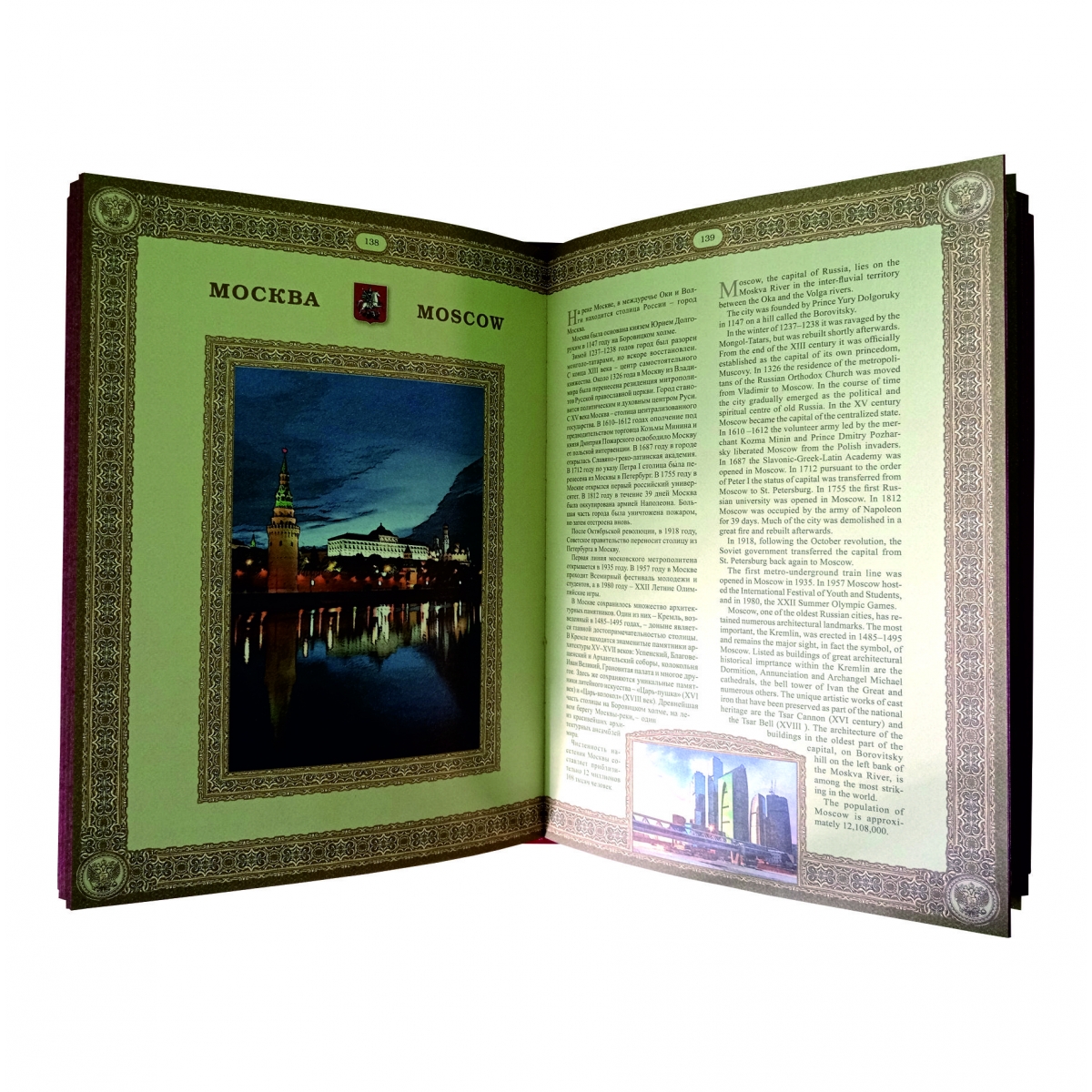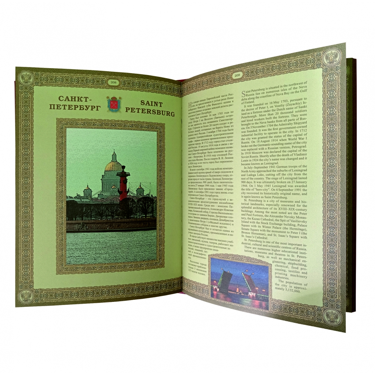 От Абакана до Ярославля – почти полторы сотни городов, каждый со своей историей взлетов и падений, поражений и побед, достопримечательностей и знаменитых личностей свидетельствуют о том, что ход Российской истории далеко не всегда определялся в столицах. Издание призвано «восстановить справедливость» и показать значение каждого города России. Параллельные тексты на русском и английском языках делают книгу прекрасным подарком иностранным партнерам. Переплет ручной работы. Натуральная переплетная кожа. Каптал из шелковых нитей. Ляссе шелковое. Обрез окрашенный. Украшение переплета: тиснение полиграфической фольгой, конгревное тиснение.