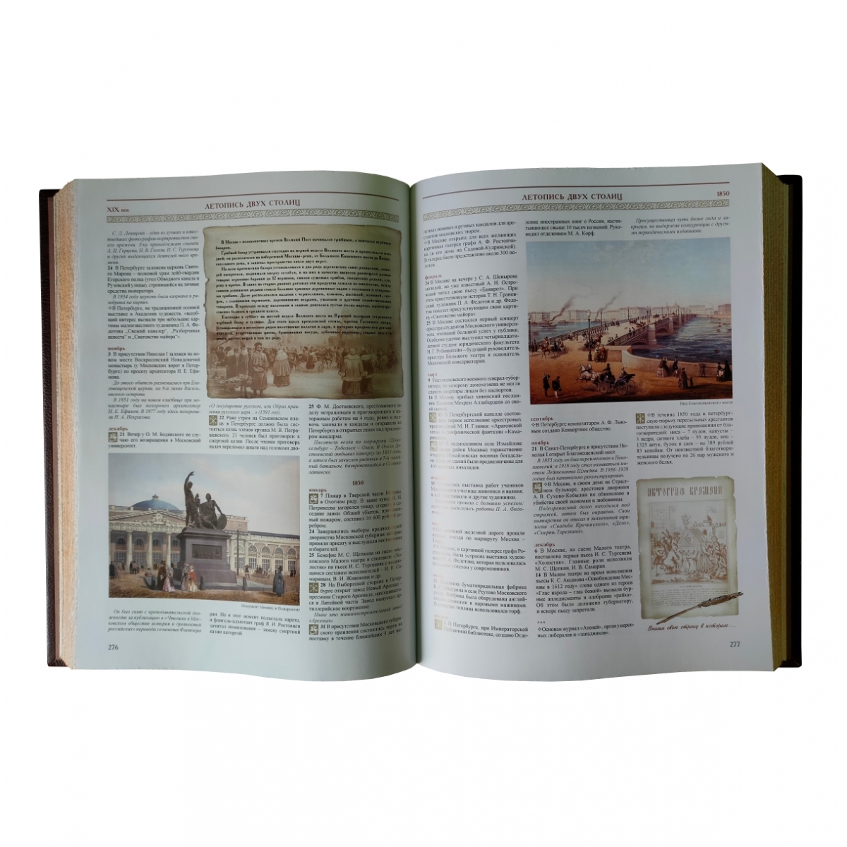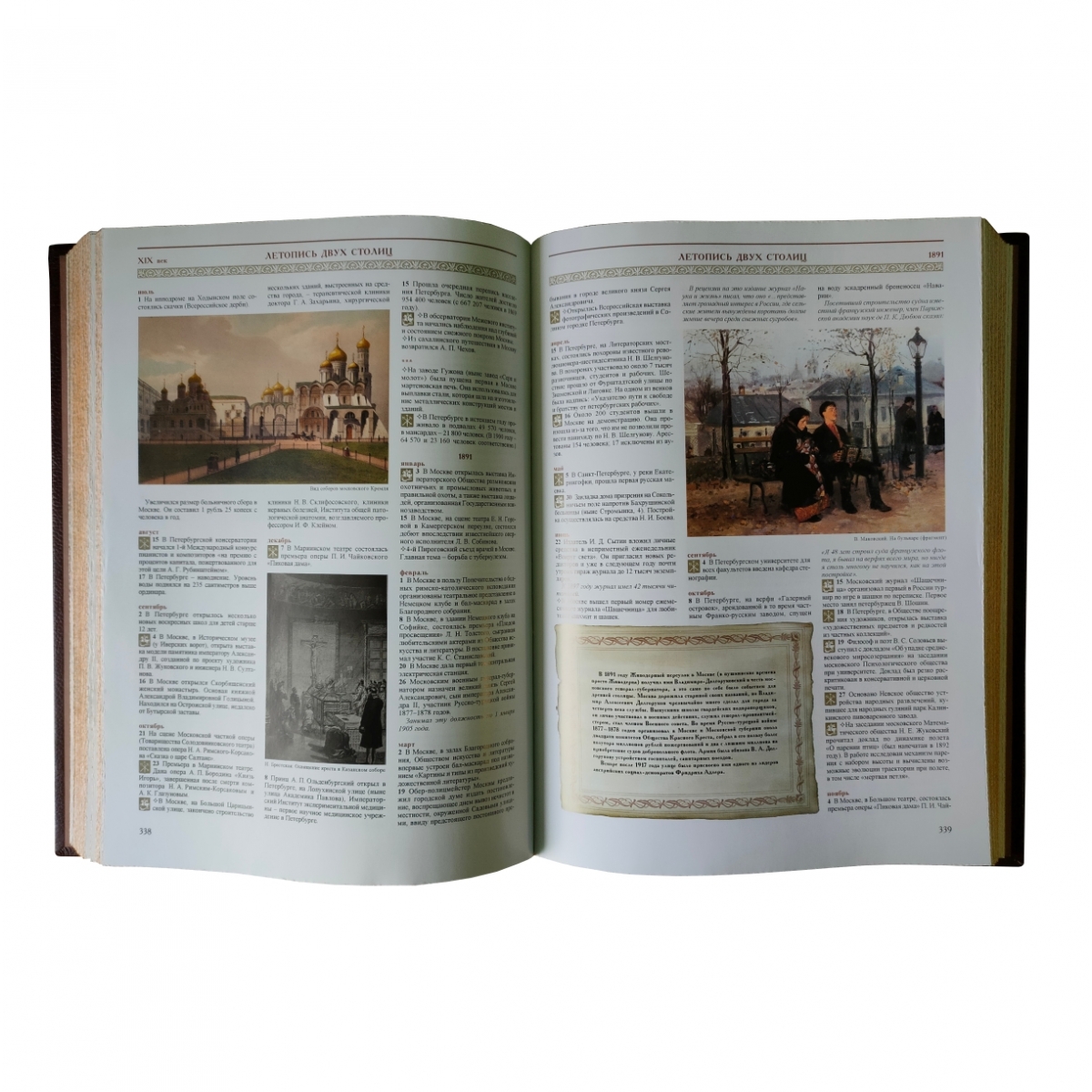 Уникальное подарочное издание: тысячи информативных, точно датированных сообщений в хронологическом порядке. Коллектив авторов успешно решил задачу по сбору самой полной, интересной и научно выверенной информации на основе огромного количества археологических памятников и документальных источников. Редакцией была проделана большая работа по подбору иллюстративного материала: книга содержит более 1 500 репродукций картин, старинных рисунков, гравюр и карт и многочисленные другие материалы. «Летопись двух столиц» первое подобное издание как у нас в стране, так и за рубежом. Переплет ручной работы. Натуральная переплетная кожа. Каптал из шелковых нитей. Ляссе шелковое. Обрез золотой. Украшение переплета: тиснение полиграфической фольгой, декоративные металлические вставки.