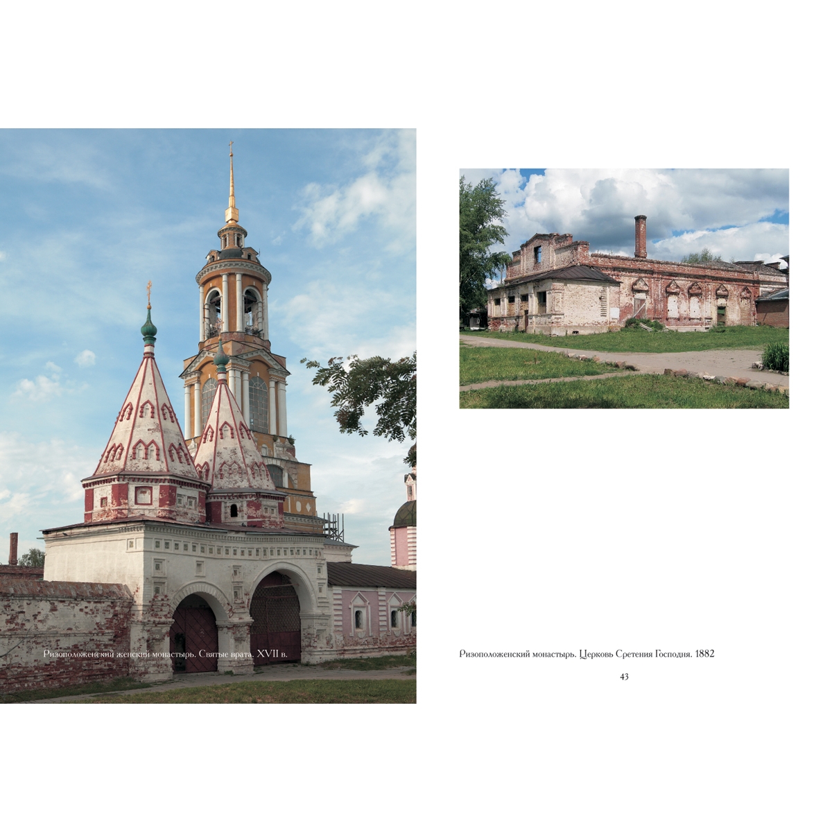 Далее к северу путника встречают нарядные, с двумя шатрами ворота Ризоположенского женского монастыря (1688). С ними связаны имена известных суздальских зодчих Мамина, Шмакова и Грязнова. Сам монастырь основан в 1207 году, его каменные постройки появились в ХVI веке. Главный трехглавый Ризположенский собор перекрыт по закомарам и скромно украшен поясом кирпичных нишек, зато пристроенная позже теми же зодчими паперть демонстрирует все богатство кирпичных и изразцовых узоров.