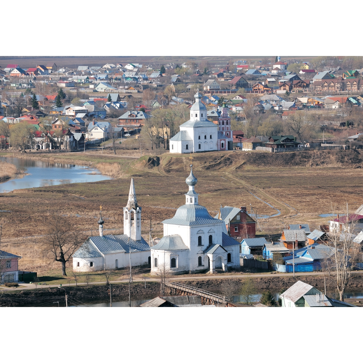 Еще немного севернее, ближе к Каменке, среди зелени видны невысокие стены Александровского монастыря. По преданию, он был основан Александром Невским в 1240 году, а его Вознесенская церковь (1695) построена на средства царицы Натальи Кирилловны, матери Петра I. Это двухэтажный четверик с пятью куполами на изящных барабанах, такой часто встречается в Суздале.