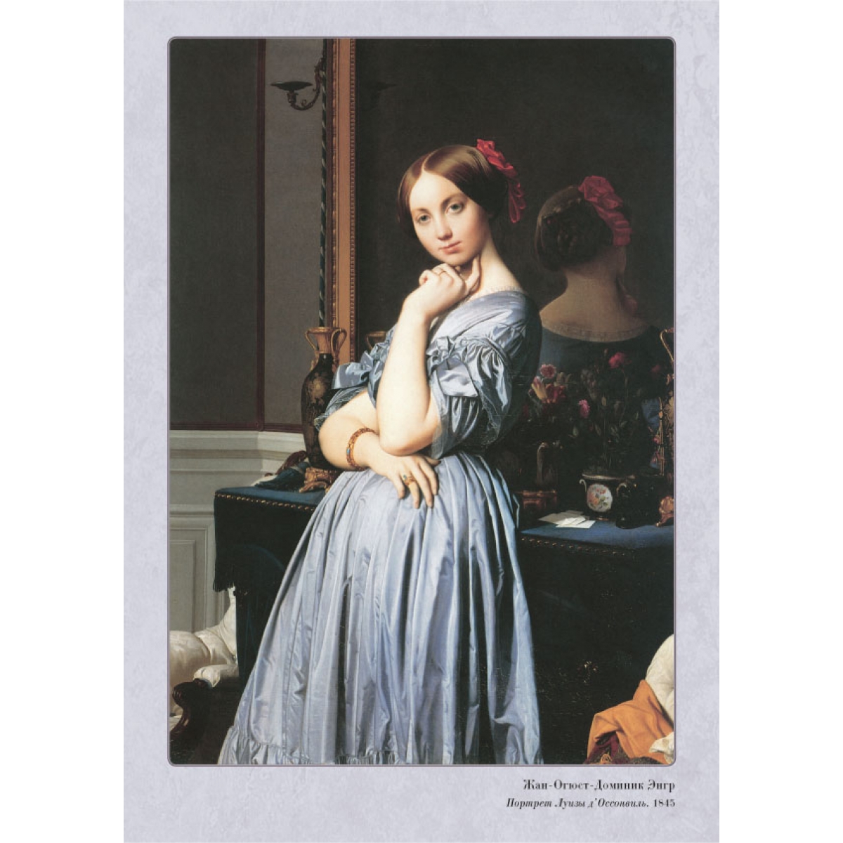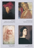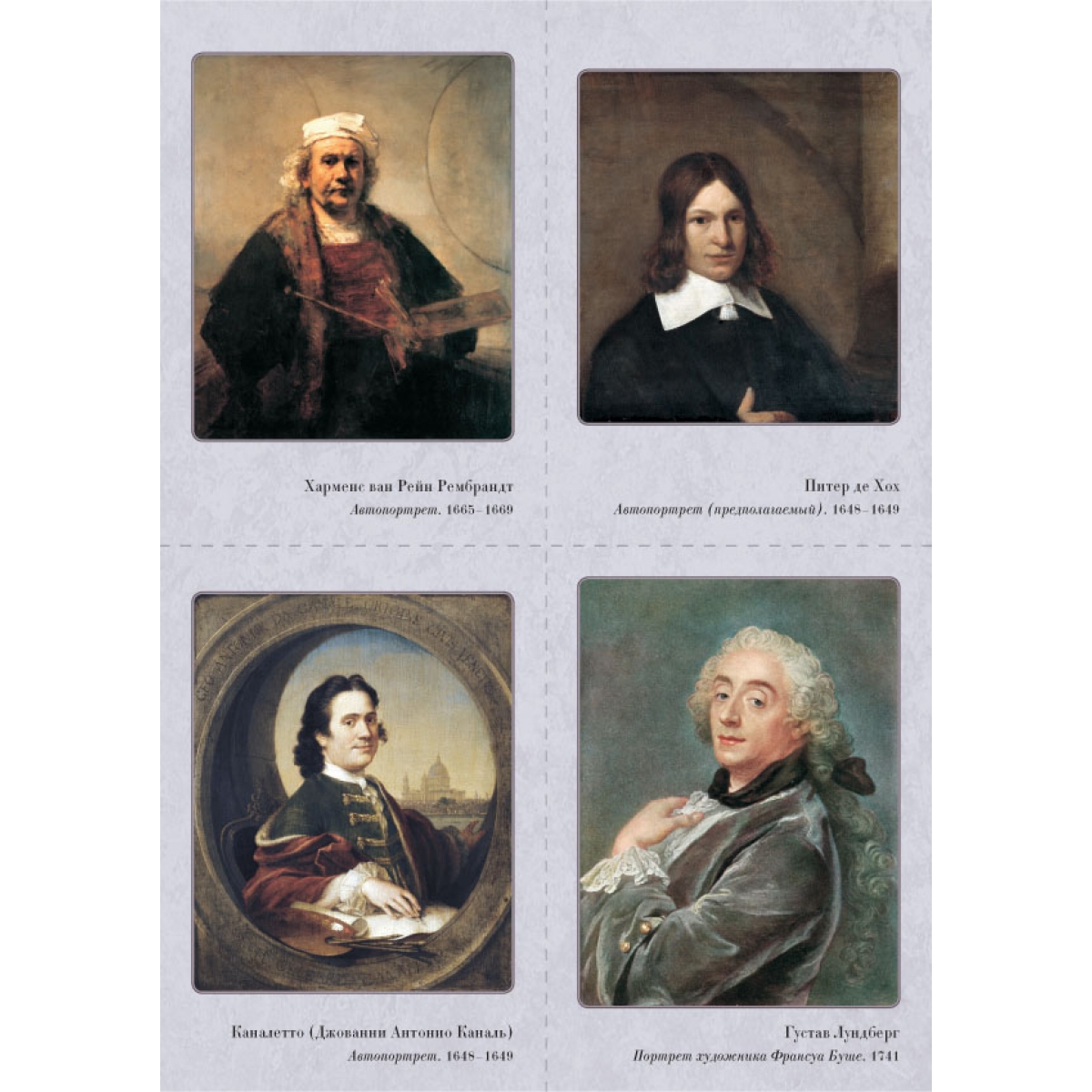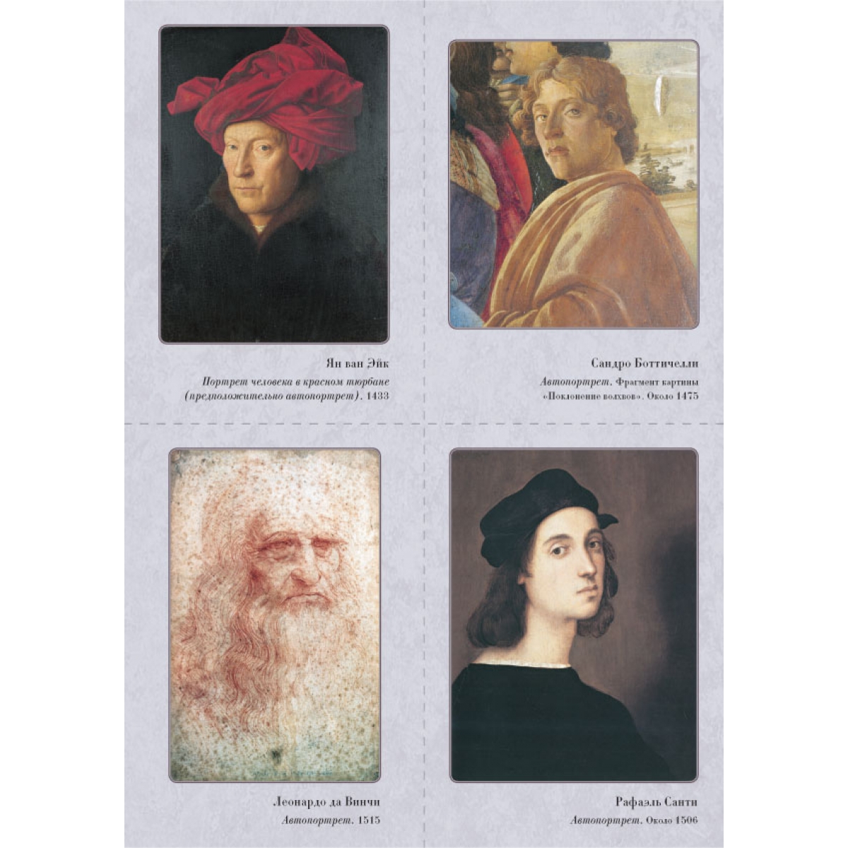 Ян ван Эйк. Портрет Джованни Арнольфини с женой. 1434 Сандро Боттичелли. Рождение Венеры. Около 1484 Леонардо да Винчи. Портрет Лизы дель Джокондо (Мона Лиза). 1503–1506 Рафаэль Санти. Сикстинская Мадонна. 1513–1514 Ханс Хольбейн Младший. Портрет французских послов в Англии Жана де Бентвилля и Жоржа де Сельва (Послы). 1533 Питер Брейгель Старший. Детские игры. 1559–1560 Питер Пауль Рубенс. Четыре философа (Автопортрет с братом Филиппом и друзьями). 1611–1612 Диего Родригес де Сильва Веласкес. Лас Менинас (Менины). 1656 Харменс ван Рейн Рембрандт. Ночной дозор. 1642 Питер де Хох. Внутренний дворик дома в Делфте. 1658 Каналетто (Джованни Антонио Каналь). Палаццо Дукале и пьяцца ди Сан-Марко. После 1740 Франсуа Буше. Портрет маркизы де Помпадур. 1756 Томас Гейнсборо. Мистер и миссис Уильям Халлетт (Утренняя прогулка). 1785 Жак-Луи Давид. Переход Бонапарта через перевал Сен-Бернар. 1801 Каспар Давид Фридрих. Этапы жизни. Около 1835 Жан-Огюст-Доминик Энгр. Портрет Луизы д’Оссонвиль. 1845 Андо Хиросигэ. Окрестности храма Тэндзин в Камейдо. 1856 Данте Габриэль Россетти. Сон наяву. 1880 Эдуар Мане. Железная дорога. 1873 Лоуренс Альма-Тадема. Триумф Тита. 1885 Клод Моне. Терраса на берегу моря в Сент-Адрессе. 1867 Пьер-Огюст Ренуар. Портрет мадам Шарпантье с детьми Жоржеттой и Полем. 1878 Джованни Больдини. Портрет танцовщицы Клео де Мерод. 1901 Джон Уильям Уотерхауз. Леди из Шалот. 1888 Список портретов художников: Ян Ван Эйк. Портрет человека в красном тюрбане (предположительно автопортрет). 1433 Леонардо да Винчи. Автопортрет. 1515 Сандро Боттичелли. Автопортрет. Фрагмент картины «Поклонение волхвов». Около 1475 Рафаэль Санти. Автопортрет. Около 1506 Ханс Хольбейн Младший. Автопортрет. Около 1542–1543 Питер Пауль Рубенс. Автопортрет. 1623–1625 Питер Брейгель Старший. Художник и знаток (автопортрет). Около 1565 Диего Родригес де Сильва Веласкес. Автопортрет. 1638–1640 Харменс ван Рейн Рембрандт. Автопортрет. 1665–1669 Каналетто (Джованни Антонио Каналь). Автопортрет. 1648–1649 Питер де Хох. Автопортрет (предполагаемый). 1648–1649 Густав Лундберг. Портрет художника Франсуа Буше. 1741 Томас Гейнсборо. Автопортрет. Около 1759 Каспар Давид Фридрих. Автопортрет. 1810 Жак-Луи Давид. Автопортрет. 1794 Жан-Огюст-Доминик Энгр. Автопортрет. 1804 Эдуард Мане. Автопортрет с палитрой. Около 1878 Утагава Кунисада. Мемориальный портрет Хиросигэ. 1858 Данте Габриэль Россетти. Автопортрет. 1847 Лоуренс Альма-Тадема. Автопортрет. 1896 Клод Моне. Автопортрет в берете. 1886 Джованни Больдини. Автопортрет в Монтореоли. 1892 Пьер-Огюст Ренуар. Автопортрет в возрасте тридцати пяти лет. 1876 Уильям Логсдейл. Портрет художника Джона Уильяма Уотерхауза. Эскиз. Около 1886–1887