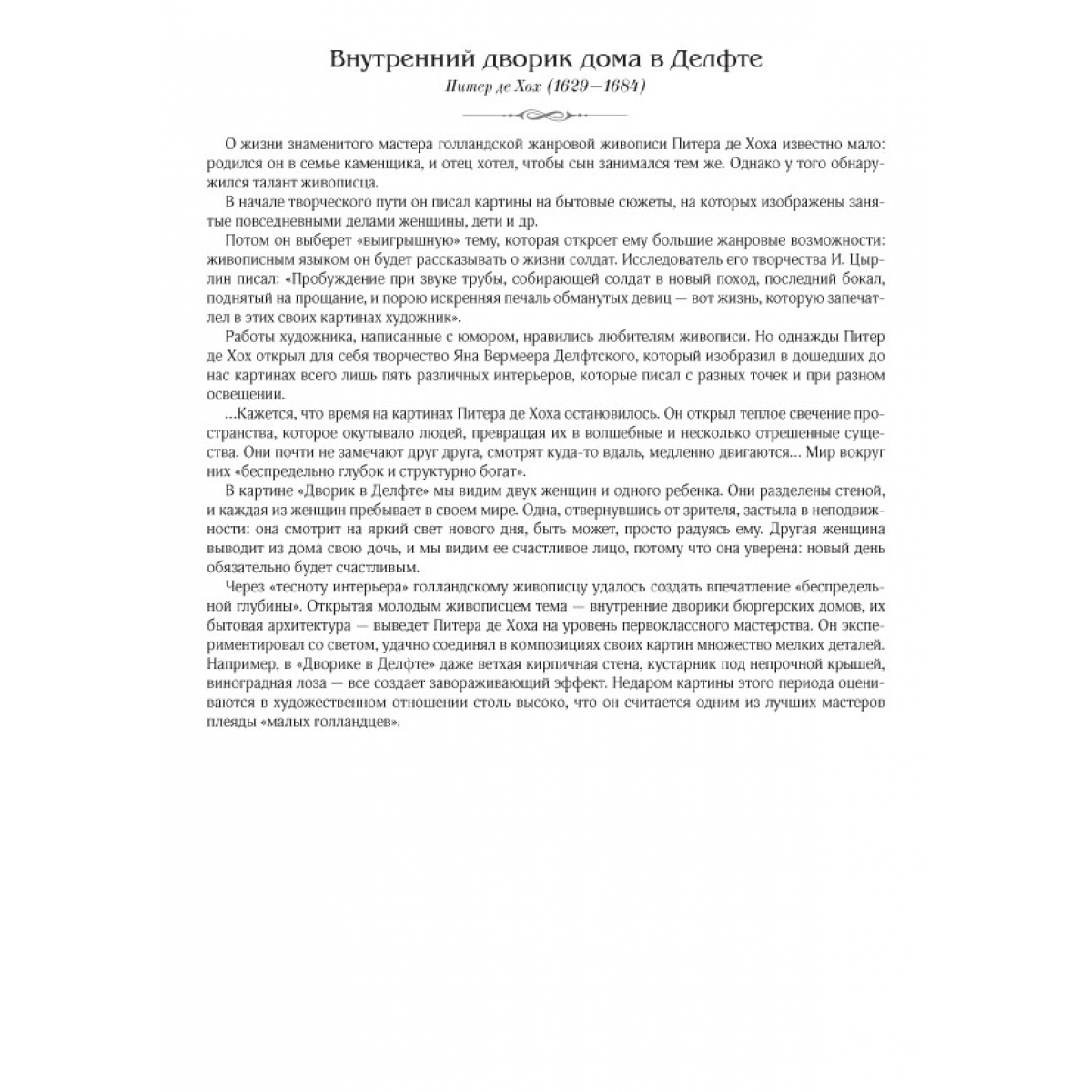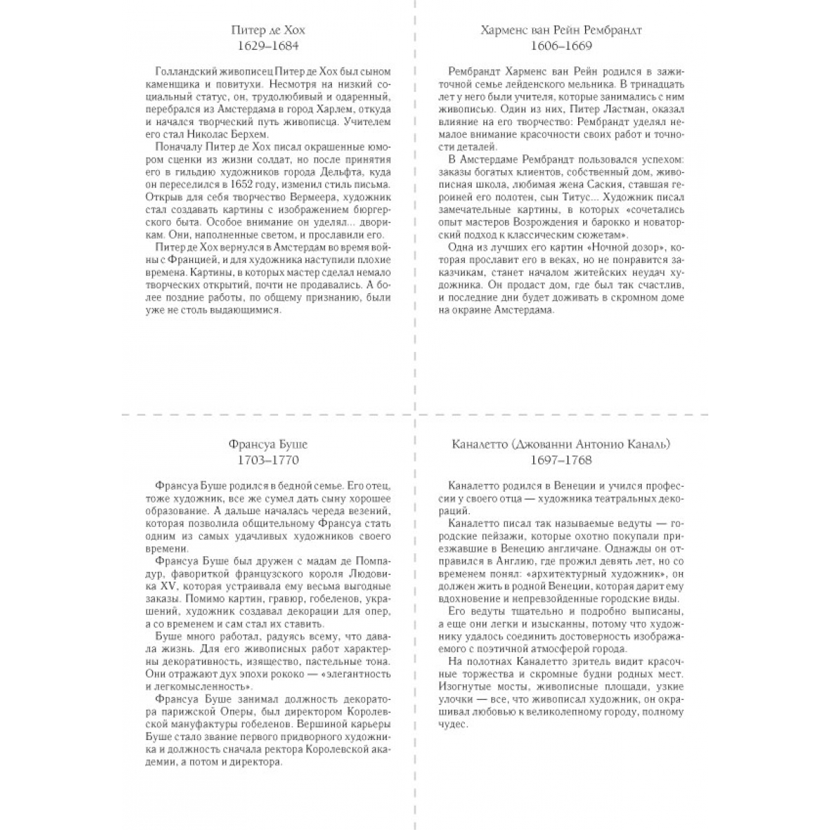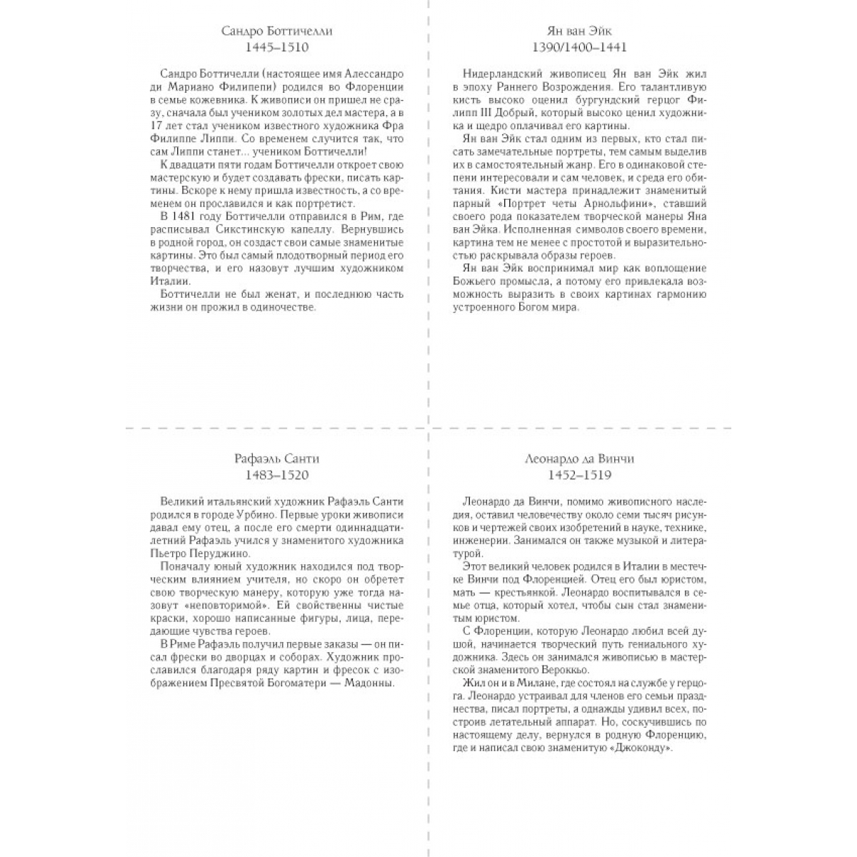 Ян ван Эйк. Портрет Джованни Арнольфини с женой. 1434 Сандро Боттичелли. Рождение Венеры. Около 1484 Леонардо да Винчи. Портрет Лизы дель Джокондо (Мона Лиза). 1503–1506 Рафаэль Санти. Сикстинская Мадонна. 1513–1514 Ханс Хольбейн Младший. Портрет французских послов в Англии Жана де Бентвилля и Жоржа де Сельва (Послы). 1533 Питер Брейгель Старший. Детские игры. 1559–1560 Питер Пауль Рубенс. Четыре философа (Автопортрет с братом Филиппом и друзьями). 1611–1612 Диего Родригес де Сильва Веласкес. Лас Менинас (Менины). 1656 Харменс ван Рейн Рембрандт. Ночной дозор. 1642 Питер де Хох. Внутренний дворик дома в Делфте. 1658 Каналетто (Джованни Антонио Каналь). Палаццо Дукале и пьяцца ди Сан-Марко. После 1740 Франсуа Буше. Портрет маркизы де Помпадур. 1756 Томас Гейнсборо. Мистер и миссис Уильям Халлетт (Утренняя прогулка). 1785 Жак-Луи Давид. Переход Бонапарта через перевал Сен-Бернар. 1801 Каспар Давид Фридрих. Этапы жизни. Около 1835 Жан-Огюст-Доминик Энгр. Портрет Луизы д’Оссонвиль. 1845 Андо Хиросигэ. Окрестности храма Тэндзин в Камейдо. 1856 Данте Габриэль Россетти. Сон наяву. 1880 Эдуар Мане. Железная дорога. 1873 Лоуренс Альма-Тадема. Триумф Тита. 1885 Клод Моне. Терраса на берегу моря в Сент-Адрессе. 1867 Пьер-Огюст Ренуар. Портрет мадам Шарпантье с детьми Жоржеттой и Полем. 1878 Джованни Больдини. Портрет танцовщицы Клео де Мерод. 1901 Джон Уильям Уотерхауз. Леди из Шалот. 1888 Список портретов художников: Ян Ван Эйк. Портрет человека в красном тюрбане (предположительно автопортрет). 1433 Леонардо да Винчи. Автопортрет. 1515 Сандро Боттичелли. Автопортрет. Фрагмент картины «Поклонение волхвов». Около 1475 Рафаэль Санти. Автопортрет. Около 1506 Ханс Хольбейн Младший. Автопортрет. Около 1542–1543 Питер Пауль Рубенс. Автопортрет. 1623–1625 Питер Брейгель Старший. Художник и знаток (автопортрет). Около 1565 Диего Родригес де Сильва Веласкес. Автопортрет. 1638–1640 Харменс ван Рейн Рембрандт. Автопортрет. 1665–1669 Каналетто (Джованни Антонио Каналь). Автопортрет. 1648–1649 Питер де Хох. Автопортрет (предполагаемый). 1648–1649 Густав Лундберг. Портрет художника Франсуа Буше. 1741 Томас Гейнсборо. Автопортрет. Около 1759 Каспар Давид Фридрих. Автопортрет. 1810 Жак-Луи Давид. Автопортрет. 1794 Жан-Огюст-Доминик Энгр. Автопортрет. 1804 Эдуард Мане. Автопортрет с палитрой. Около 1878 Утагава Кунисада. Мемориальный портрет Хиросигэ. 1858 Данте Габриэль Россетти. Автопортрет. 1847 Лоуренс Альма-Тадема. Автопортрет. 1896 Клод Моне. Автопортрет в берете. 1886 Джованни Больдини. Автопортрет в Монтореоли. 1892 Пьер-Огюст Ренуар. Автопортрет в возрасте тридцати пяти лет. 1876 Уильям Логсдейл. Портрет художника Джона Уильяма Уотерхауза. Эскиз. Около 1886–1887