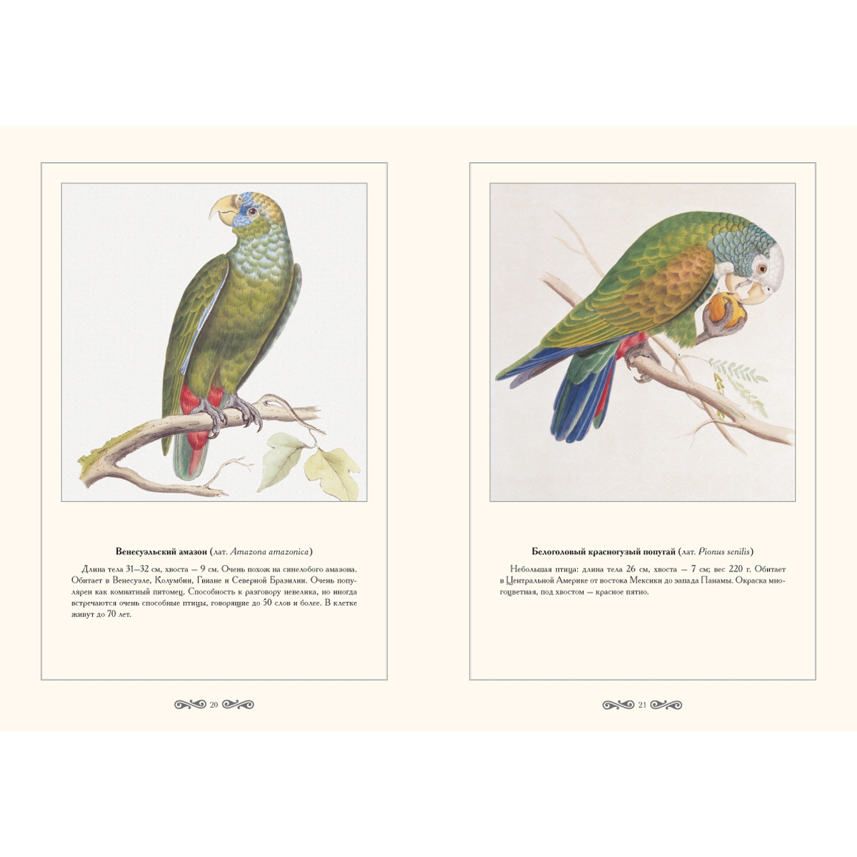 Данный альбом знакомит читателя с собранием из 110 цветных литографий ХIХ века, изображающих попугаев из разных континентов. Литографии служили иллюстрациями научных книг или издавались в виде красочных альбомов в разных странах Европы: в Англии, Франции и др