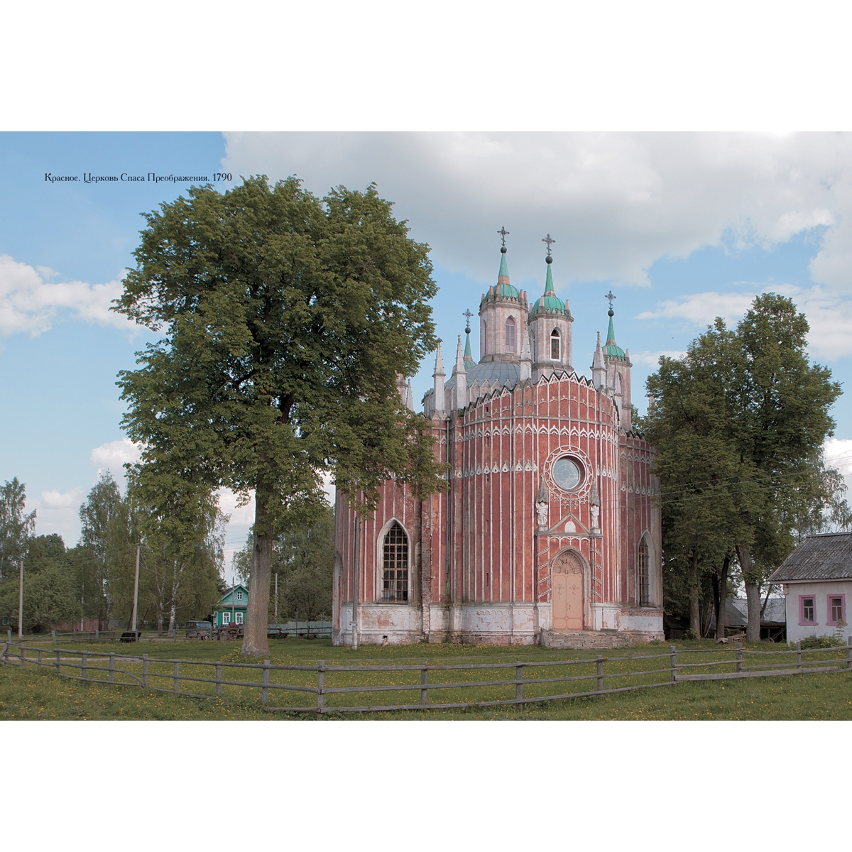 Совсем недалеко от Старицы находится село Красное. Его краснобелая Преображенская церковь (1790) – копия петербургской Чесменской церкви архитектора Ю.М. Фельтена. Четырехлепестковое в плане здание обильно украшено готическими элементами. Нарядная церковь хорошо сохранилась снаружи, внутри состояние хуже, но она действует.
