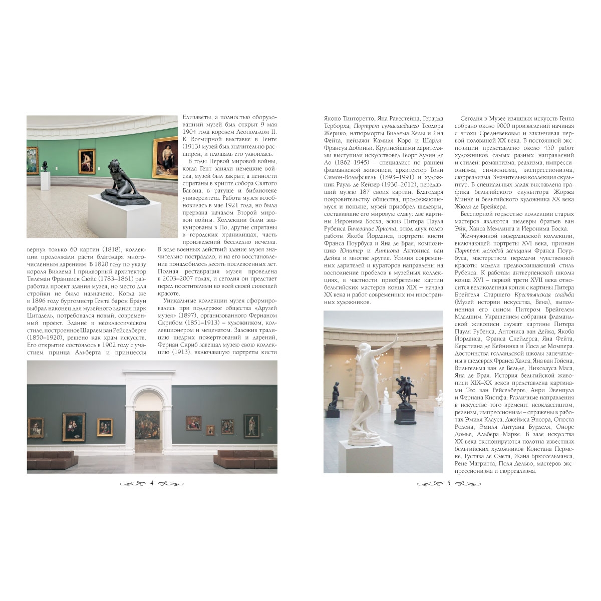 Альбом знакомит читателя с историей и художественными коллекциями Гентского музея изящных искусств (1798) – крупнейшего по богатству и разнообразию коллекций художественного музея Бельгии. Его история начинается с зарождения гентской школы живописи, основанной Хубертом и Яном ван Эйками, прославленными создателями Гентского алтаря, и связанной с именами Йоса ван Вассенхове и Хуго ван дер Гуса. Сегодня в Музее изящных искусств Гента собрано около 9000 произведений начиная с эпохи Средневековья и заканчивая первой половиной ХХ века. Бесспорной гордостью коллекции старых мастеров являются шедевры братьев ван Эйк, Ханса Мемлинга и Иеронима Босха. Жемчужиной нидерландской коллекции, включающей портреты XVІ века, признан «Портрет молодой женщины». Франса Поурбуса. Украшением собрания фламандской живописи служат картины Питера Пауля Рубенса, Антониса ван Дейка, Якоба Йорданса, Франса Снейдерса, Яна Фейта, Керстиана де Кейнинка и Йоса де Момпера. Достоинства голландской школы запечатлены в шедеврах Франса Халса, Яна ван Гойена, Вильгельма ван де Вельде, Николауса Маса, Яна де Брая. История бельгийского искусства XIX–XX веков представлена картинами Тео ван Рейселберге, Анри Эвенпула и Фернана Кнопфа. Различные направления в искусстве того времени: неоклассицизм, реализм, импрессионизм – отражены в работах Эмиля Клауса, Джеймса Энсора, Огюста Родена, Эмиля Антуана Бурделя, Оноре Домье, Альбера Марке. В зале искусства XX века экспонируются полотна известных бельгийских художников Констана Пермеке, Густава де Смета, Жана Брюссельманса, Рене Магритта, Поля Дельво, мастеров экспрессионизма и сюрреализма.