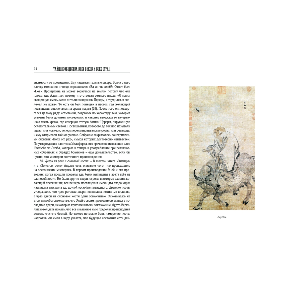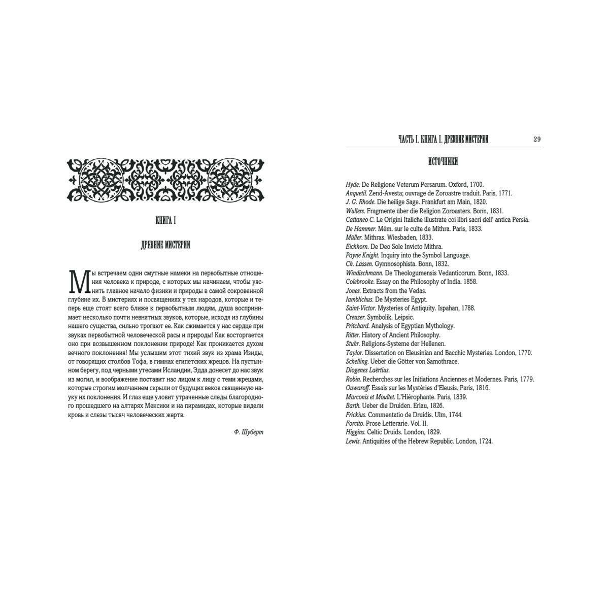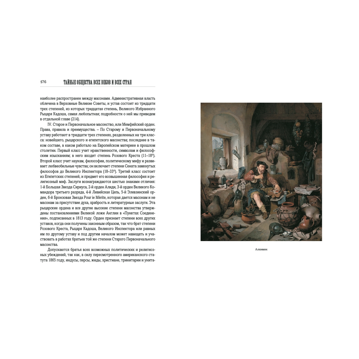 Предисловие 5 Введение 9 1. Смысл и свойство тайных обществ. 9 2. Классификация тайных обществ. 10 3. Религиозные общества. 10 4. Политические общества. 10 5. Цель политических обществ. 12 6. Религиозные тайные общества. 13 7. Самый совершенный человеческий тип. 13 8. Причины высокого умственного развития. 14 9. Первобытная культура. 15 10. Истинное учение о природе и существе. 16 11. Основные правила истинного познания древних. 17 12. Ключ к мистическому учению. 19 13. Суть мистического учения. 19 14. Как утратилось истинное знание. 19 15. Первоначальный дух мистерий и результат их упадка. 20 16. Мистерии с астрономической точки зрения. 22 17. Продолжение предыдущего. 23 18. Однообразие догматов. 23 19. Минование надобности в тайных обществах. 25 Книга I. ДРЕВНИЕ МИСТЕРИИ 28 I. Маги 31 20. Происхождение слова маг. 31 21. Древность магов. 31 22. Зороастр. 32 23. Учение Зороастра. 32 24. Поклонение огню. 35 25. Происхождение слова Deus, Бог. 35 26. Способ посвящения. 36 27. Миф о Рустаме. 38 II. Поклонение Митре 39 28. Мистерии Митры. 39 29. Происхождение культа Митры. 39 30. Догматы и пр. 40 31. Обряды посвящения. 40 32. Религии, происшедшие от магизма. 42 III. Брамины и гимнософисты 43 33. Простонародная вера в Индии. 43 34. Тайные учения. 43 35. Брама и Будда. 44 36. Аскетизм. 45 37. Гимнософисты. 46 38. Места, где совершались мистерии. 47 39. Посвящение. 47 39, а. Брам и Брама. 48 40. Неизреченное AUM. 48 41. Лингам. 49 42. Лотос. 49 IV. Египетские мистерии 51 43. Древность египетской цивилизации. 51 44. Храмы древнего Египта. 52 45. Египетские жрецы и цари. 53 46. Внешнее и внутреннее учение. 53 47. Египетская мифология. 54 48. Феникс. 55 49. Крест. 55 50. Места посвящения. 56 51. Порядок посвящения. 57 52. Мистерии Сераписа. 59 53. Мистерии Озириса. 59 54. Изида. 59 V. Превращения мифа об Изиде 61 55. Распространение египетских мистерий. 61 56. Дионисии, или вакхические мистерии. 61 57. Сабазийские мистерии. 62 58. Кабирийские мистерии. 62 59. Элевзинские мистерии. 63 60. Двери из рога и слоновой кости. 64 61. Отмена элевзинских таинств. 65 62. Тесмофории. 65 63. Цель греческих мистерий более нравственная, чем религиозная. 66 VI. Китайские и японские мистерии 67 64. Китайская метафизика. 67 65. Введение в китайские мистерии. 67 66. Параллель между буддизмом и католицизмом. 68 67. Лау-Тзе. 69 68. Новейшие китайские общества. 69 69. Японские мистерии. 70 70. Японское учение. 70 71. Лама. 71 VII. Мексиканские и перувианские мистерии 72 72. Коренные жители Америки. 72 73. Мексиканские божества. 72 74. Жестокость мексиканской религии. 73 75. Посвящение в мистерии. 74 76. Большие мистерии. 75 77. Человеческое жертвоприношение. 75 78. Облечение в окровавленные кожи. 76 79. Перувианские мистерии. 76 VIII. Друиды 78 80. Друиды, маги Запада. 78 81. Храмы. 78 82. Места посвящения. 79 83. Обряды. 79 84. Доктрины. 81 85. Политическая и судебная власть. 81 86. Жрицы. 82 87. Уничтожение. 83 IX. Скандинавские мистерии 84 88. Дротты. 84 89. Обряды. 85 90. Доказательства астрономического значения. 85 Книга II. ЭМАНАЦИОНИСТЫ 88 I. Каббалистика 89 91. Ее происхождение. 89 92. Ее развитие. 89 93. Время возникновения каббалистики. 90 94. Книга Иезирах. 90 95. Разные роды каббалистики. 91 96. Видения Иезекииля. 91 97. Сотворение мира из Ничего. 92 98. Распространение каббалистических идей. 93 II. Гностики 94 99. Характер гностицизма. 94 100. Доктрины. 94 101. Развитие гностицизма. 95 102. Дух гностицизма. 96 Книга III. РЕЛИГИЯ ЛЮБВИ 97 I. Сыны вдовы 99 103. Происхождение религии любви. 99 104. Манес. 100 105. Манихеизм. 100 106. Жизнь Манеса. 101 107. Развитие манихеизма. 101 108. Учение. 102 109. Распространение 