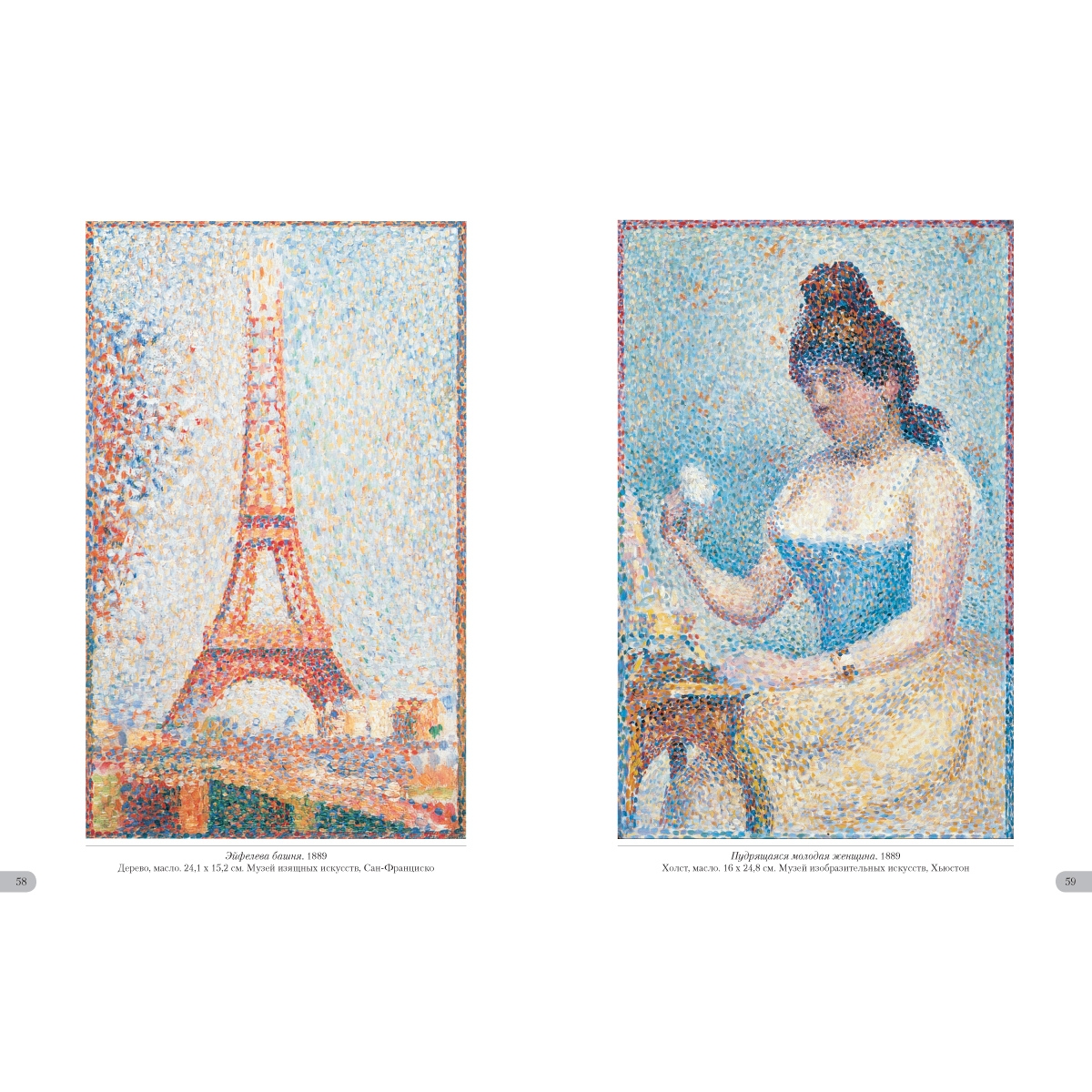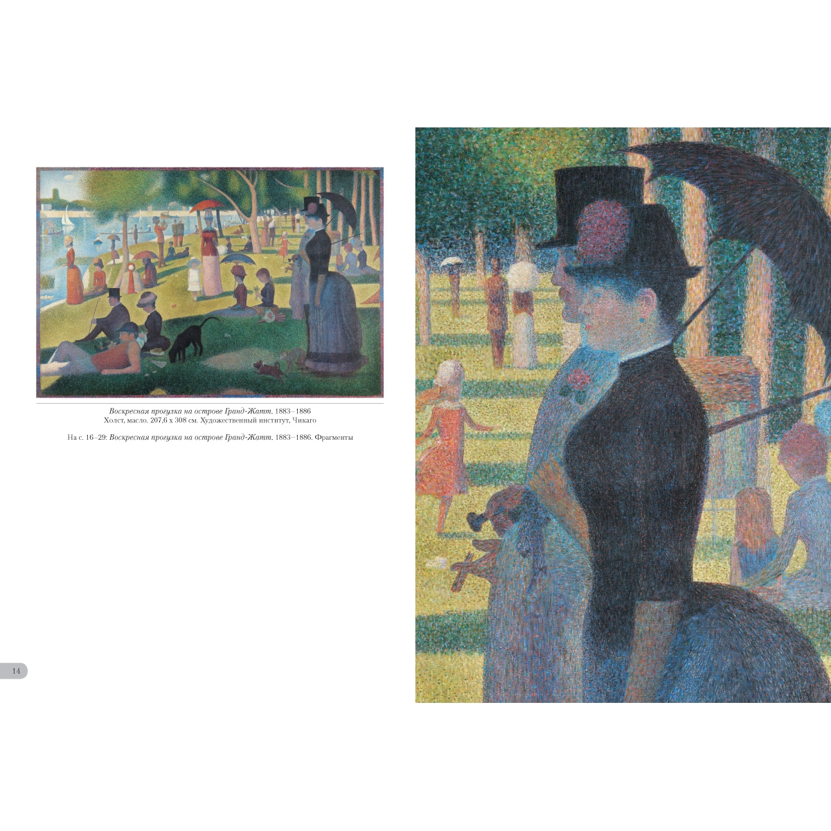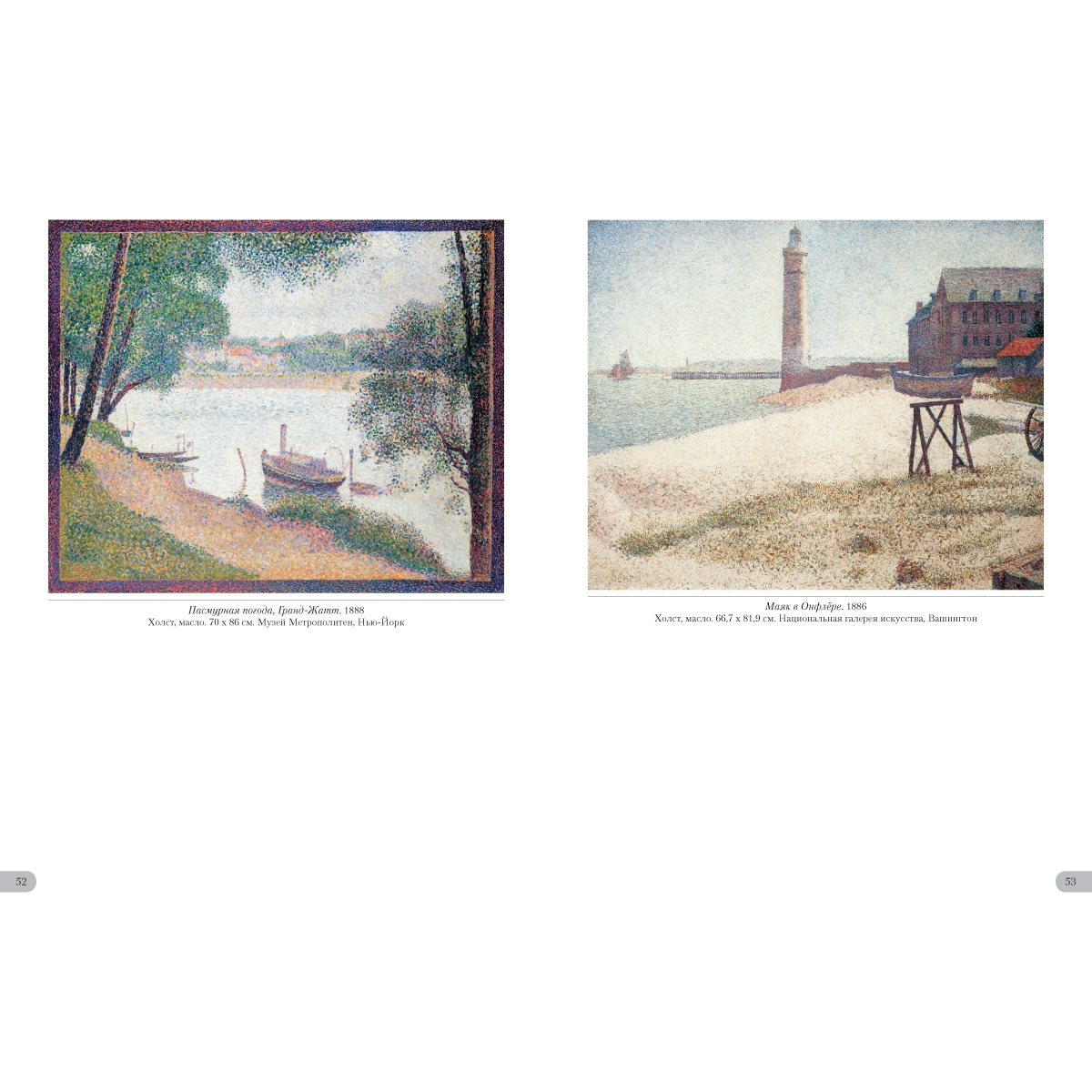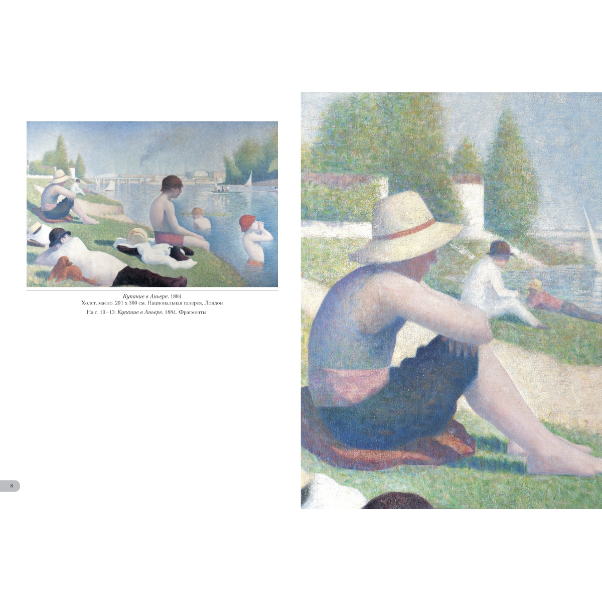 Жорж Сёра создавал картины с помощью научного и, как он считал, единственно возможного метода. Основоположник пуантилизма клал на полотно мазки чистых красок близко друг к другу, отчего возникал особенный цветовой эффект – глубокий и разнообразный. Он изгонял из своих работ всякое движение, долго трудился над композицией. И все для того, чтобы «зафиксировать вечность», а не «запечатлеть мгновение», как это делали импрессионисты. Новая система, придуманная Сёра, его и прославила. УКАЗАТЕЛЬ ПРОИЗВЕДЕНИЙ «Мария» в Онфлёре. 1886 50 Вилль д'Эврэй. Белые дома. 1882—1883 5 Воскресная прогулка на острове Гранд¬-Жатт. 1883–1886 14 Воскресная прогулка на острове Гранд¬-Жатт. Этюд. 1884–1885 30–31 Гавань в Онфлёре. 1886 51 Гранд-¬Жатт. Этюд. 1885 32–33 Дома в Ле Ренси. Около 1882 4 Жнец. 1881–1882 6 Канал в Гравелине. 1890 57 Канал в Гравелине. Вид в сторону моря. 1890 56 Канкан. 1889–1890 66 Купание в Аньере. 1884 8 ЛаМанш в Гранкампе. 1885 46–47 Лес в Понтобере. Около 1881–1882 7 Маяк в Онфлёре. 1886 53 Мыс дю Ок в Гранкане. 1885 48 Натурщицы. 1887–1888 68 Обнаженная натурщица. 1887 70 Парад-¬алле. 1887–1888 64–65 Пасмурная погода, Гранд¬-Жатт. 1888 52 Пейзаж в Гранд¬-Жатт. 1884 38–39 Пейзаж с фигурами. Этюд. 1884–1885 36–37 Пляж Ба Бутен в Онфлёре. 1886 49 Портан-¬Бессен. 1886 55 Портан-¬Бессен. Воскресенье. 1888 54 Пудрящаяся молодая женщина. 1888–1890 60 Пудрящаяся молодая женщина. 1889 59 Река Сена в Гранд-¬Жатт. 1888 43 Сена в Гранд¬-Жатт. 1887 44–45 Сена в Курбевуа. 1885 40 Сена. Берег реки. 1883 34–35 Утренняя прогулка. Этюд. 1885 42 Цветы в вазе. 1878–1879 3 Цирк. 1891 62 Эйфелева башня. 1889 58