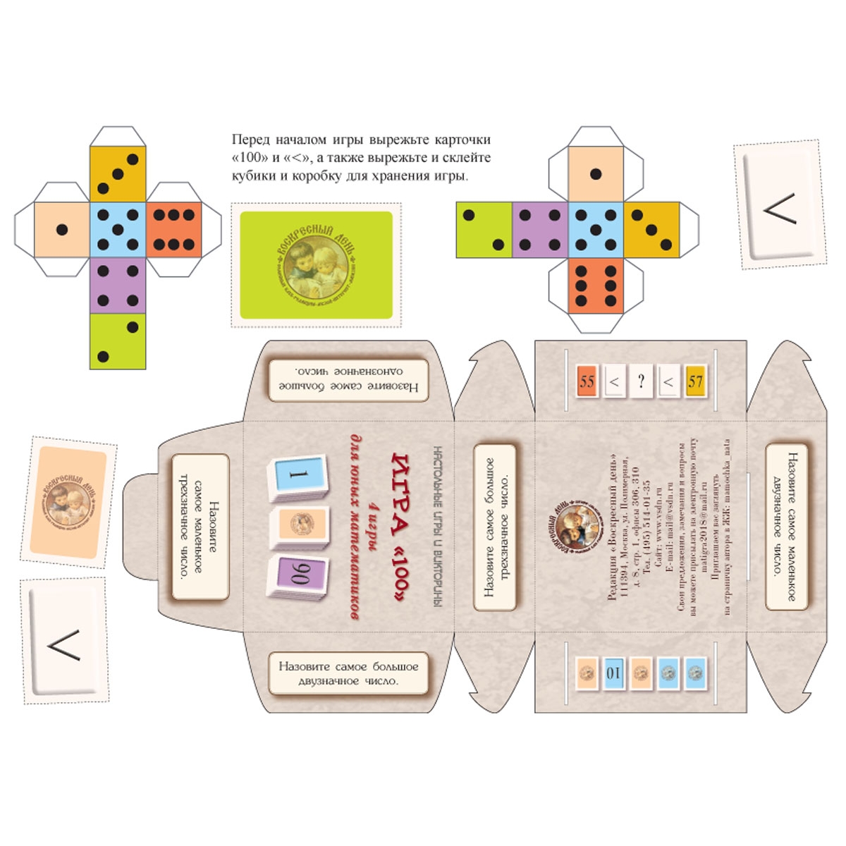 В набор входят: — 101 разноцветная карточка с цифровым рядом от «0» до «100»; — 2 развертки игровых кубиков с разноцветными сторонами; — развертка коробки для хранения карточек и кубиков; — правила игры. |