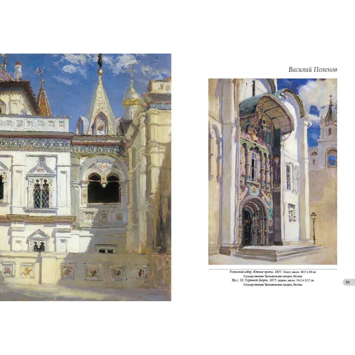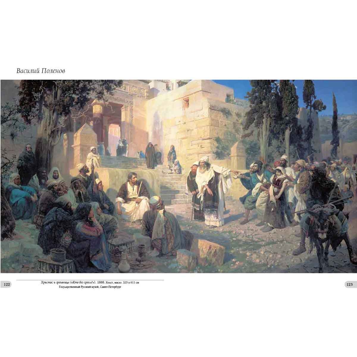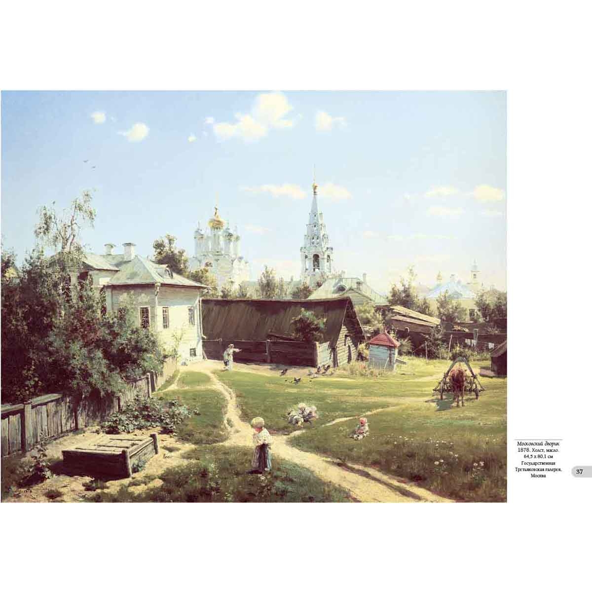Но не в этой ли скромности заключено обаяние, исходящее от картины? В ней тоже, но и в тишине и покое, в поэзии простого и в красоте обыденного, заполняющих полотно, в теплоте и оптимизме, которое излучает оно. Обаяние объясняется и созвучием наших чувств с теми, которые испытывал большой мастер во время создания полотна. Наконец, привлекательность «Московского дворика», других произведений В.Д. Поленова – в необыкновенной притягательности личности самого автора, человека больших знаний, высокой нравственности, настоящего патриота России. Творчество В. Поленова многообразно: от известной серии живописных полотен с видами древней московской архитектуры и эскизов театральных декораций до этюдов, привезенных из путешествий по странам Ближнего Востока и библейским местам, в результате этой работы получилось выдающееся полотно «Христос и грешница» и сложился большой цикл полотен «Из жизни Христа», также знамениты лирические пейзажи русской природы, которые художник наблюдал, когда жил на Русском Севере и в своем имении Бёхове в Тульской губернии. Указатель произведений Античный пейзаж. 1906 140 Арест гугенотки Жакобины де Монтебель, графини д’Этремон. 1875 17 Баальбек. 1882 68–69 Баальбек. Развалины храма Юпитера и Солнца. 1882 66–67 Бабочки. Этюд 42 Бабушкин сад. 1878 44–45 Берег в Нормандии. 1874 16 Березки и папоротники 41 Березовая аллея в Абрамцеве. 1880 40 Благовещенский собор. Придел собора Пресвятой Богородицы в главе. 1877 30 Блудный сын. 1874 14 Больная. 1886 64–65 Больная. Эскиз. 1800-е 61 Был в пустыне. Серия «Из жизни Христа». 1909 116 В парке. Местечко Вёль в Нормандии. 1874 10 Венеция. Каналы. 1896 138 Возвестила радость плачущим. Серия «Из жизни Христа». 1899 127 Воря. 1882 39 Воскрешение дочери Иаира. 1871 6–7 Восточный базар. Эскиз 22 Генисаретское озеро 96–97 Голгофа («Стояли вдали»). 1909 128–129 Голова араба. Этюд к картине «Среди учителей». 1895 87 Голова И.И. Левитана в повороте головы Христа. Этюд для картины «Мечты». 1894 102 Голова натурщицы Бланш Ормье. Этюд к картине «Стрекоза». 1875 9 Голова старика. Этюд к картине «Христос и грешница». 1883 104 Голова фарисея. Этюд для картины «Христос и грешница». 1884 100 Гондола и парус. 1890-е 139 Горелый лес. 1881 48–49 Горелый лес. 1881. Фрагмент 51 Деревня Вологодской губернии 54–55 Деревня Тургенево. 1885 58 Дорога в Дельфы. 1911 101 «За кого Меня почитают люди». Серия «Из жизни Христа». 1890–1900-е 121 Замок Танкреда в Тивериаде 98 Заросший пруд. 1879 52–53 Зима. Имоченцы. 1880 56–57 Золотая осень. 1903 150–151 Иерусалим с западной стороны. Яффские ворота и цитадель. 1882 92 Исполнялся премудрости. Серия «Из жизни Христа». 1890–1891 111 Источник Девы Марии в Назарете. 1882 94–95 Итальянский пейзаж. 1874 13 «Киоск» на острове Филе (Филаке). Этюд. 1881 74 Кладбище среди кипарисов. Декорации к частной опере Глюка «Орфей и Эвридика». 1897 144 Комната командующего Рущукским отрядом великого князя Александра Александровича в Брестовце. 1878 27 Константинополь (Стамбул). Эски-Сарайский сад. 1882 99 Крым. Судак. Бухта и гора Сокол. 1912 154–155 Ливень. 1874 20 Лодка. 1880 62 Лопухи. 1870-е 43 Мастерская 2 Мельница на истоке речки Вёль. 1874 11 Мечеть Омара. Харам-эш-Шериф. 1882 88–89 Мечты (На горе). 1894 120 Московский дворик. 1878 36–37 Московский дворик. 1902 38 Мужская фигура 134 На Тивериадском (Генисаретском) озере. 1888 118–119 Н.В. Якунчикова на этюдах. 1882 60 Нил у Фиванского хребта. 1881 78–79 Нубийская девочка из племени Барабра на острове Элефантин. 1881 84 Одалиска. 1875 23 О
