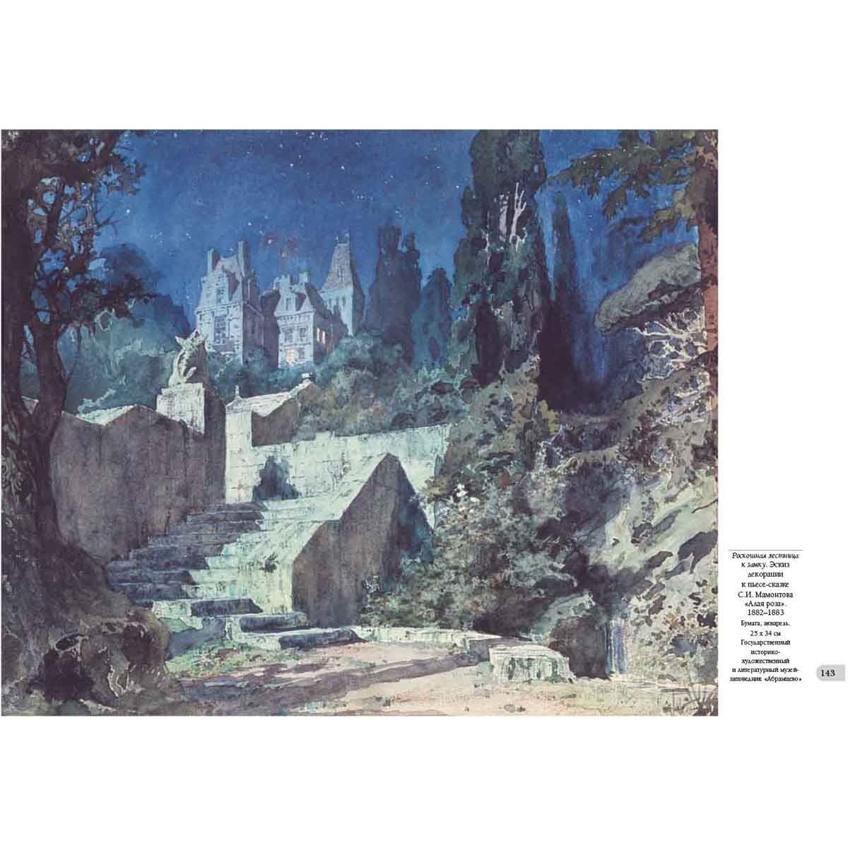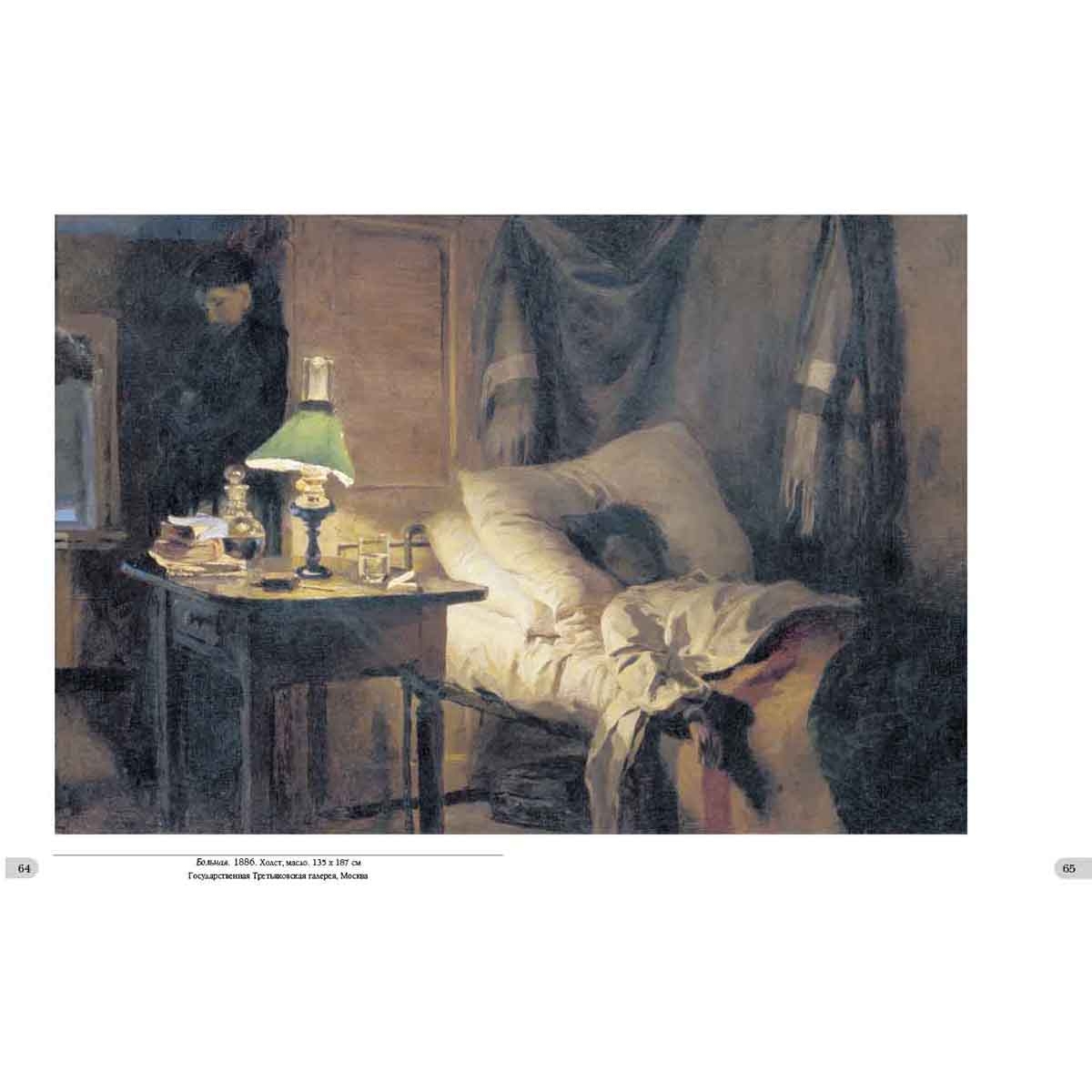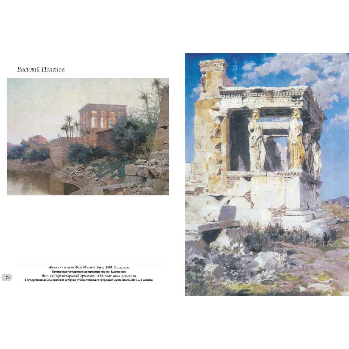 Но не в этой ли скромности заключено обаяние, исходящее от картины? В ней тоже, но и в тишине и покое, в поэзии простого и в красоте обыденного, заполняющих полотно, в теплоте и оптимизме, которое излучает оно. Обаяние объясняется и созвучием наших чувств с теми, которые испытывал большой мастер во время создания полотна. Наконец, привлекательность «Московского дворика», других произведений В.Д. Поленова – в необыкновенной притягательности личности самого автора, человека больших знаний, высокой нравственности, настоящего патриота России. Творчество В. Поленова многообразно: от известной серии живописных полотен с видами древней московской архитектуры и эскизов театральных декораций до этюдов, привезенных из путешествий по странам Ближнего Востока и библейским местам, в результате этой работы получилось выдающееся полотно «Христос и грешница» и сложился большой цикл полотен «Из жизни Христа», также знамениты лирические пейзажи русской природы, которые художник наблюдал, когда жил на Русском Севере и в своем имении Бёхове в Тульской губернии. Указатель произведений Античный пейзаж. 1906 140 Арест гугенотки Жакобины де Монтебель, графини д’Этремон. 1875 17 Баальбек. 1882 68–69 Баальбек. Развалины храма Юпитера и Солнца. 1882 66–67 Бабочки. Этюд 42 Бабушкин сад. 1878 44–45 Берег в Нормандии. 1874 16 Березки и папоротники 41 Березовая аллея в Абрамцеве. 1880 40 Благовещенский собор. Придел собора Пресвятой Богородицы в главе. 1877 30 Блудный сын. 1874 14 Больная. 1886 64–65 Больная. Эскиз. 1800-е 61 Был в пустыне. Серия «Из жизни Христа». 1909 116 В парке. Местечко Вёль в Нормандии. 1874 10 Венеция. Каналы. 1896 138 Возвестила радость плачущим. Серия «Из жизни Христа». 1899 127 Воря. 1882 39 Воскрешение дочери Иаира. 1871 6–7 Восточный базар. Эскиз 22 Генисаретское озеро 96–97 Голгофа («Стояли вдали»). 1909 128–129 Голова араба. Этюд к картине «Среди учителей». 1895 87 Голова И.И. Левитана в повороте головы Христа. Этюд для картины «Мечты». 1894 102 Голова натурщицы Бланш Ормье. Этюд к картине «Стрекоза». 1875 9 Голова старика. Этюд к картине «Христос и грешница». 1883 104 Голова фарисея. Этюд для картины «Христос и грешница». 1884 100 Гондола и парус. 1890-е 139 Горелый лес. 1881 48–49 Горелый лес. 1881. Фрагмент 51 Деревня Вологодской губернии 54–55 Деревня Тургенево. 1885 58 Дорога в Дельфы. 1911 101 «За кого Меня почитают люди». Серия «Из жизни Христа». 1890–1900-е 121 Замок Танкреда в Тивериаде 98 Заросший пруд. 1879 52–53 Зима. Имоченцы. 1880 56–57 Золотая осень. 1903 150–151 Иерусалим с западной стороны. Яффские ворота и цитадель. 1882 92 Исполнялся премудрости. Серия «Из жизни Христа». 1890–1891 111 Источник Девы Марии в Назарете. 1882 94–95 Итальянский пейзаж. 1874 13 «Киоск» на острове Филе (Филаке). Этюд. 1881 74 Кладбище среди кипарисов. Декорации к частной опере Глюка «Орфей и Эвридика». 1897 144 Комната командующего Рущукским отрядом великого князя Александра Александровича в Брестовце. 1878 27 Константинополь (Стамбул). Эски-Сарайский сад. 1882 99 Крым. Судак. Бухта и гора Сокол. 1912 154–155 Ливень. 1874 20 Лодка. 1880 62 Лопухи. 1870-е 43 Мастерская 2 Мельница на истоке речки Вёль. 1874 11 Мечеть Омара. Харам-эш-Шериф. 1882 88–89 Мечты (На горе). 1894 120 Московский дворик. 1878 36–37 Московский дворик. 1902 38 Мужская фигура 134 На Тивериадском (Генисаретском) озере. 1888 118–119 Н.В. Якунчикова на этюдах. 1882 60 Нил у Фиванского хребта. 1881 78–79 Нубийская девочка из племени Барабра на острове Элефантин. 1881 84 Одалиска. 1875 23 О