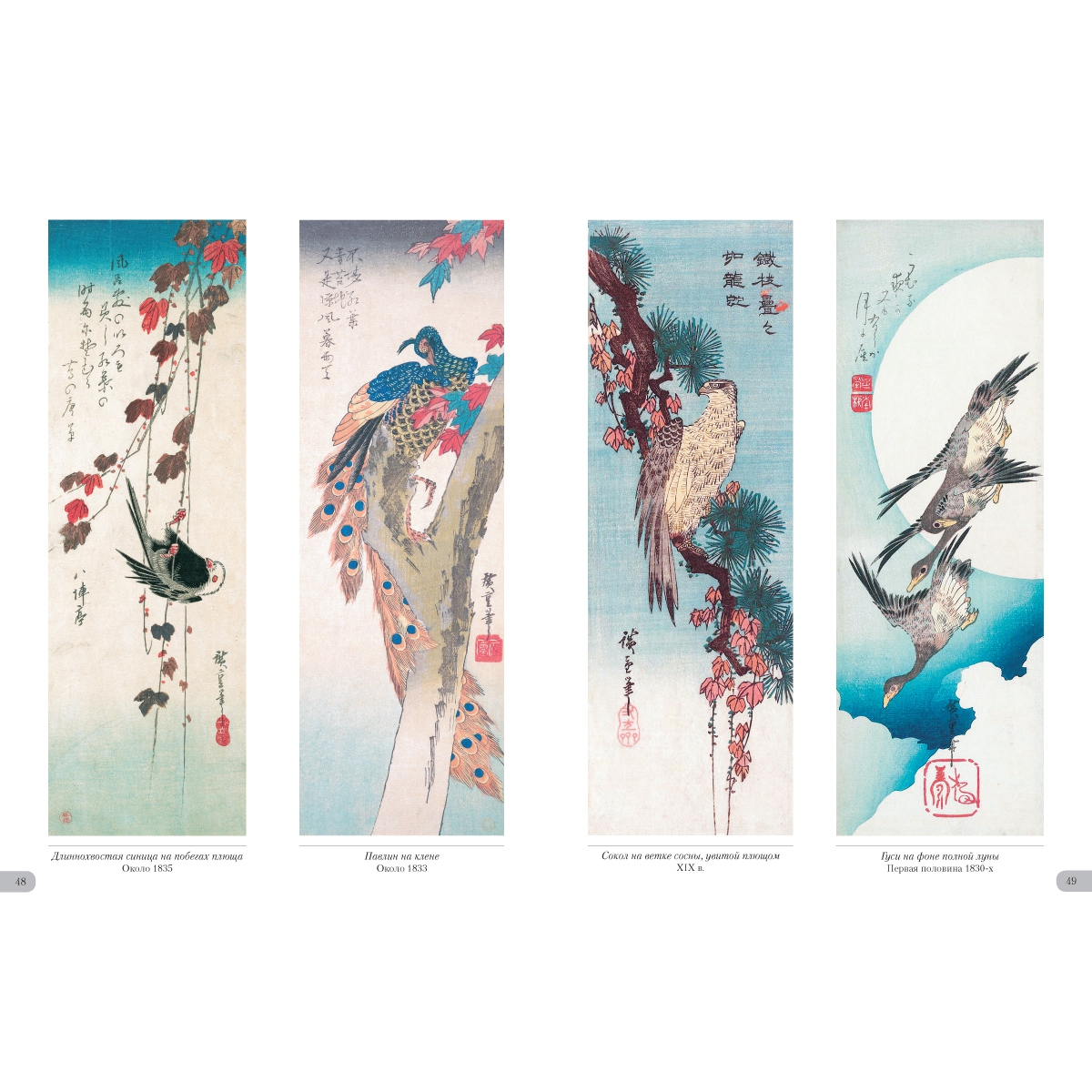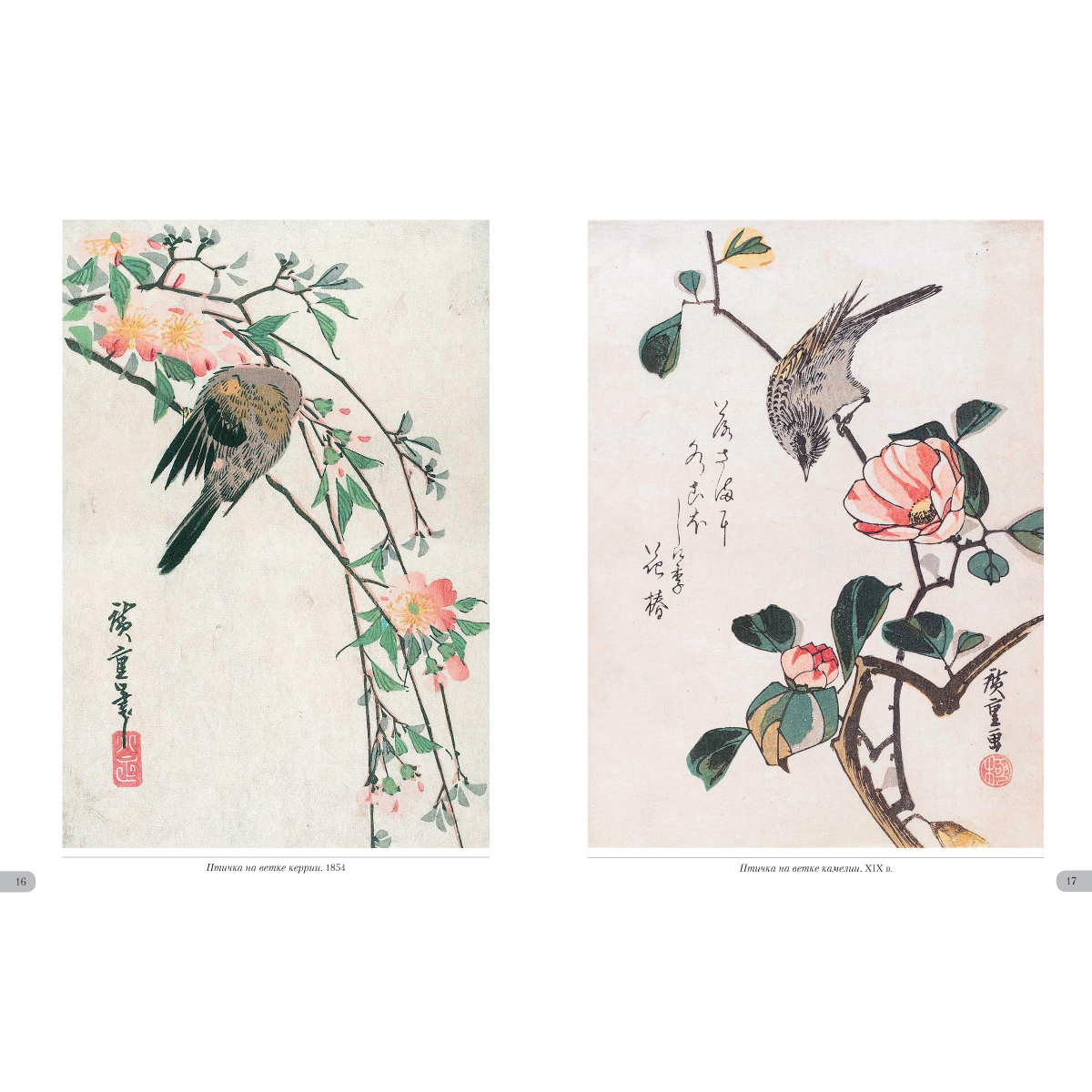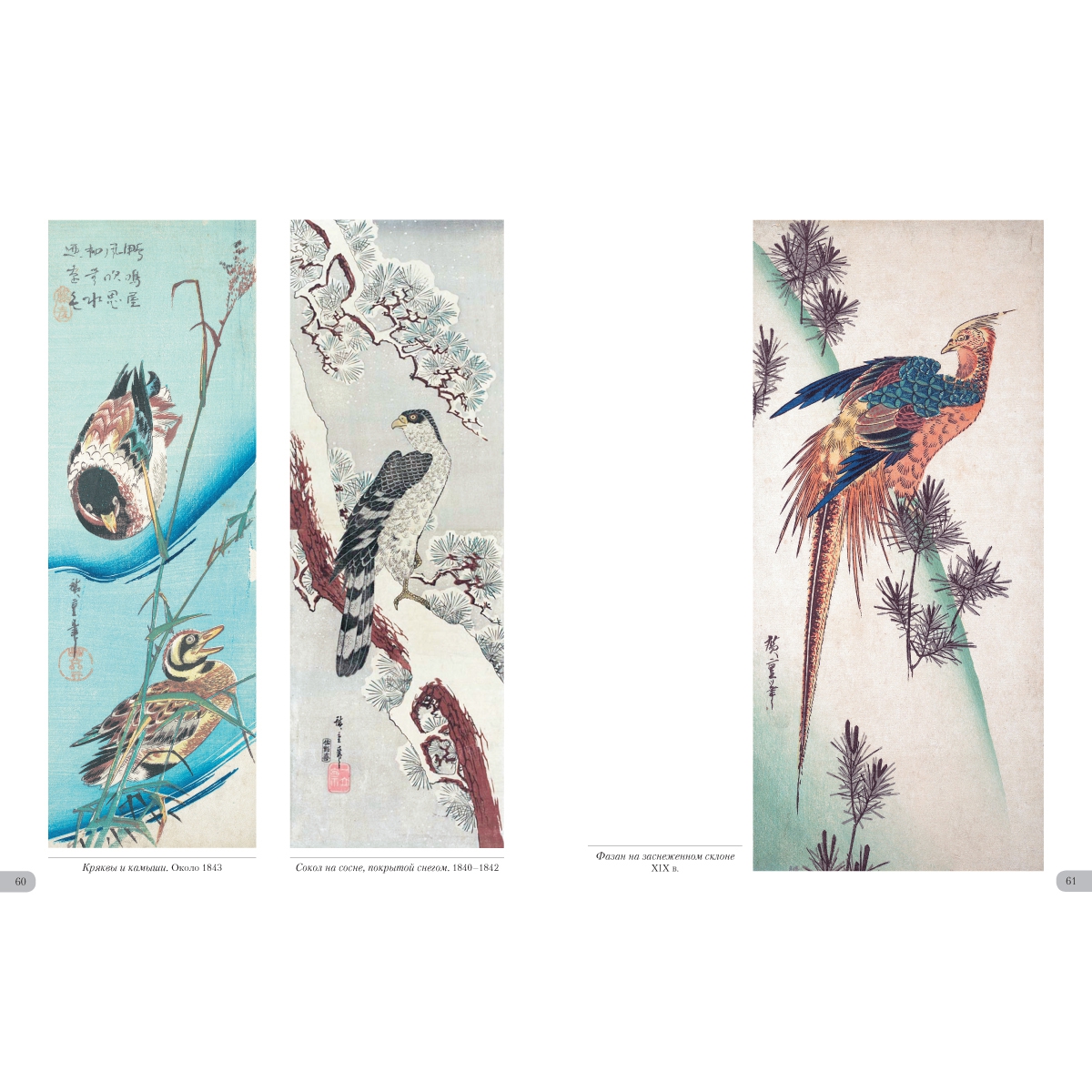 УКАЗАТЕЛЬ ПРОИЗВЕДЕНИЙ Бабочка и хризантема. XIX в. 36 Бекас и частуха. XIX в. 26 Белая цапля и ирисы. XIX в. 33 Белые мыши и волшебный молоток 2 Воробей на побеге бамбука. Вторая половина 1830х 41 Воробьи и заснеженный бамбук. XIX в. 57 Воробьи и камелия под снегом. XIX в. 4 Гвоздика. Около 1836 31 Гуси на фоне полной луны. Первая половина 1830x 49 Длиннохвостая синица на побегах плюща. Около 1835 48 Журавль и астры. XIX в. 22 Журавль, пролетающий над волнами. XIX в. 52 Журавль. Около 1831–1833 47 Золотой фазан и заснеженные сосны. XIX в. 58 Иволга и цветы гибискуса. XIX в. 34 Канарейка, ласточки и цветущая глициния. 1847–1852 25 Керрия и лягушки. Около 1832 32 Колокольчики и ласточка. Около 1833 21 Кряквы и камыши. Около 1843 60 Ласточки, зимородок и цветы пиона. Около 1838 20 Майна на ветке цветущей аронии. XIX в. 7 Мандаринка под снегом. 1847–1852 51 Мандаринки и заснеженный бамбук. 1840–1844 53 Мандаринки под снегом. 1854 50 Мандаринки. XIX в. 44 Обезьянка и ветка клена. XIX в. 39 Павлин на клене. Около 1833 48 Перепелки и цветы мака. Около 1835 30 Петух, зонтик и ипомеи. Около 1830 28 Попугай на ветке цветущей сливы. XIX в. 6 Птица и цветы махровой вишни. XIX в. 19 Птичка и хризантемы. XIX в. 40 Птичка и хризантемы. Первая половина 1830х 35 Птичка и цветущий ирис. XIX в. 30 Птичка и цветы махровой вишни. XIX в. 5 Птичка на ветке глицинии. Около 1835 23 Птичка на ветке камелии. XIX в. 17 Птичка на ветке керрии. 1854 16 Птичка на ветке цветущей сливы. XIX в. 14 Птичка на цветке желтого гибискуса. XIX в. 3 Птички и хризантемы. Около 1840–1842 35 Птички на ветвях плакучей вишни. 1847–1852 8 Птички на ветке цветущей камелии. XIX в. 13 Рисовка на цветке клематиса. Около 1835–1839 29 Рыбки, утка и леспедеца. Вторая половина 1830х 27 Синяя птица и желтый гибискус. XIX в. 34 Синяя птица на ветке шиповника. XIX в. 15 Сова на ветке клена. XIX в. 37 Сова на ветке сосны. XIX в. 59 Сова на ветке цветущей камелии. XIX в. 9 Сова на сосне. Середина 1830х 56 Сокол на ветке сосны, увитой плющом. XIX в. 49 Сокол на ветке сосны. 1852 42 Сокол на сосне, покрытой снегом. 1840–1842 60 Сокол на сосне. Середина 1830х 46 Сокол, воробей и нарциссы. Середина 1830х 10 Сорока и цветы азалии. XIX в. 11 Трясогузка и цветущая частуха. XIX в. 31 Улитки на стеблях бамбука под дождем. XIX в. 45 Фазан на заснеженной сосне. XIX в. 54 Фазан на заснеженной сосне. XIX в. 55 Фазан на заснеженном склоне. XIX в. 61 Фазан на заснеженном склоне. Около 1840 62 Хризантемы и белоглазка. XIX в. 38 Хризантемы. 1843–1847 43 Цапли среди ирисов. Около 1837 24 Цветущая вишня. XIX в. 18 Цветущая слива. 1842–1843 12