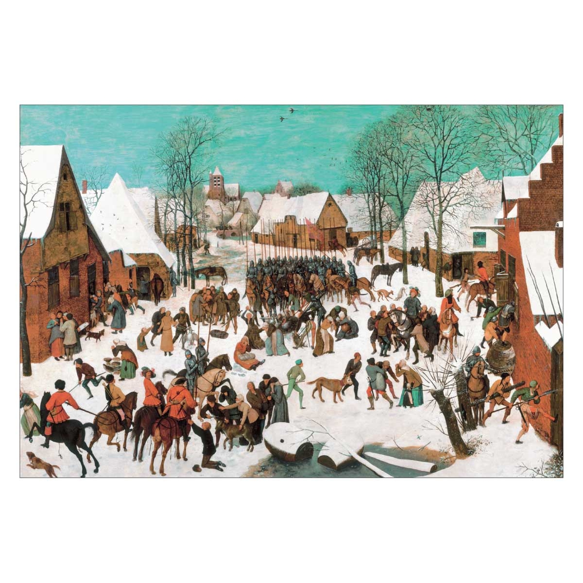 Список открыток, вошедших в набор: 1. Охотники на снегу (Январь). 1565 2. Избиение младенцев. 1566 3. Битва Масленицы и Поста. 1559 4. Несение креста. 1564 5. Слепые. 1568 6. Детские игры. 1560 7. Обращение Павла. 1567 8. Жатва (Август). 1565 9. Крестьянский танец. 1568 10. Вавилонская башня. 1563 11. Триумф Смерти. Около 1562 12. Поклонение волхвов. 1564 На обложке: Безумная Грета. Около 1562. Фрагмент