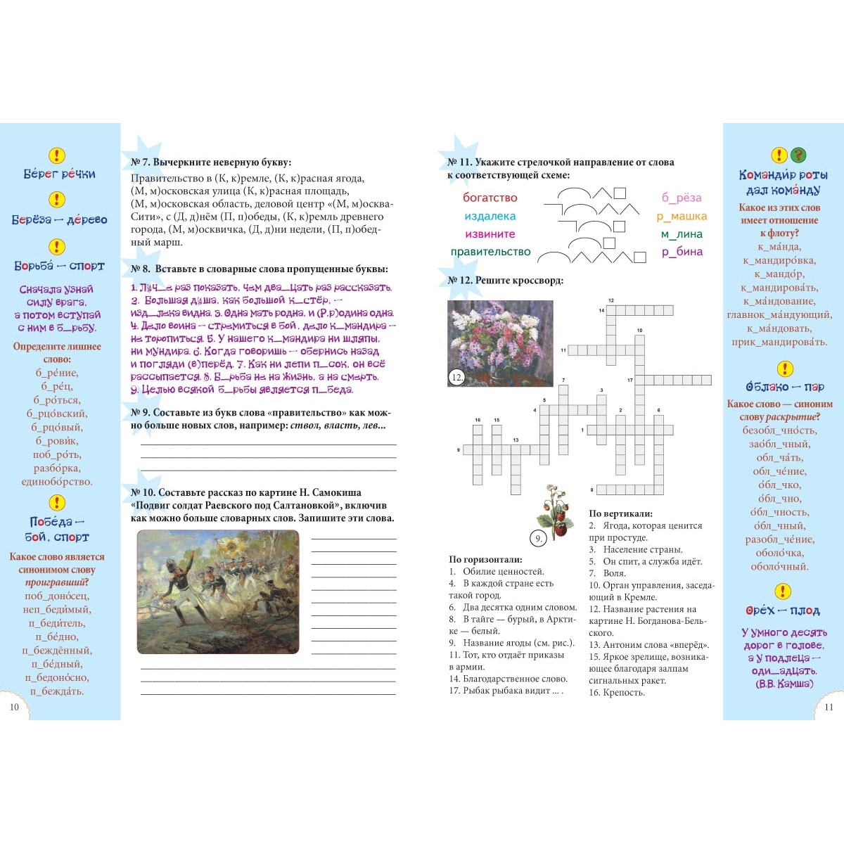 Пособие разнообразит словарную работу на уроках и дома. Материал, приведенный в нем, превратит непростую работу в интересное занятие, расширит представления детей о русском языке. Они узнают, что такое этимология, родственные и устаревшие слова, синонимы… И, конечно, хорошо запомнят сами слова.