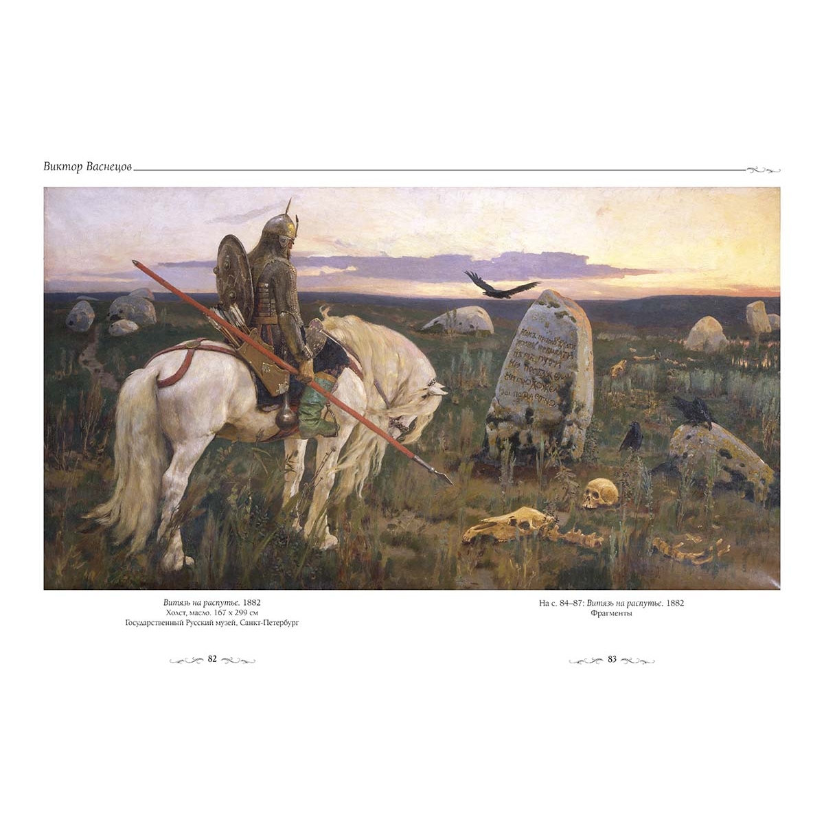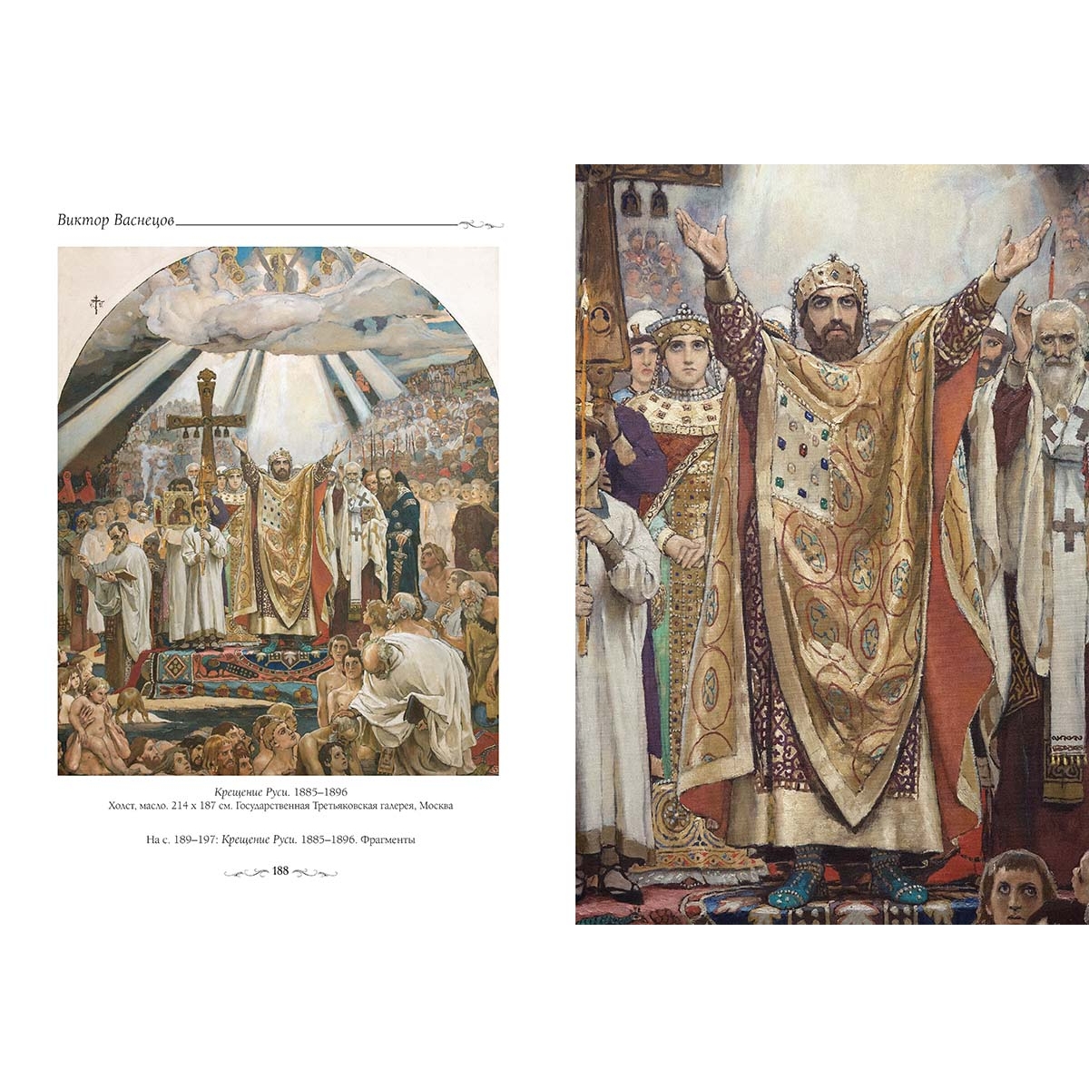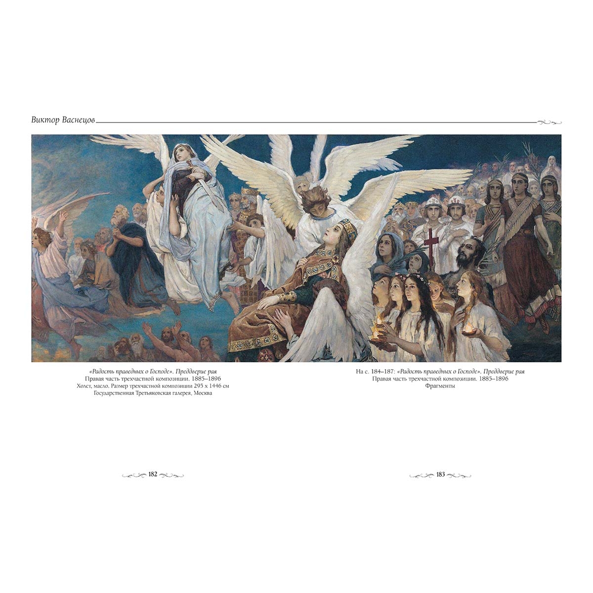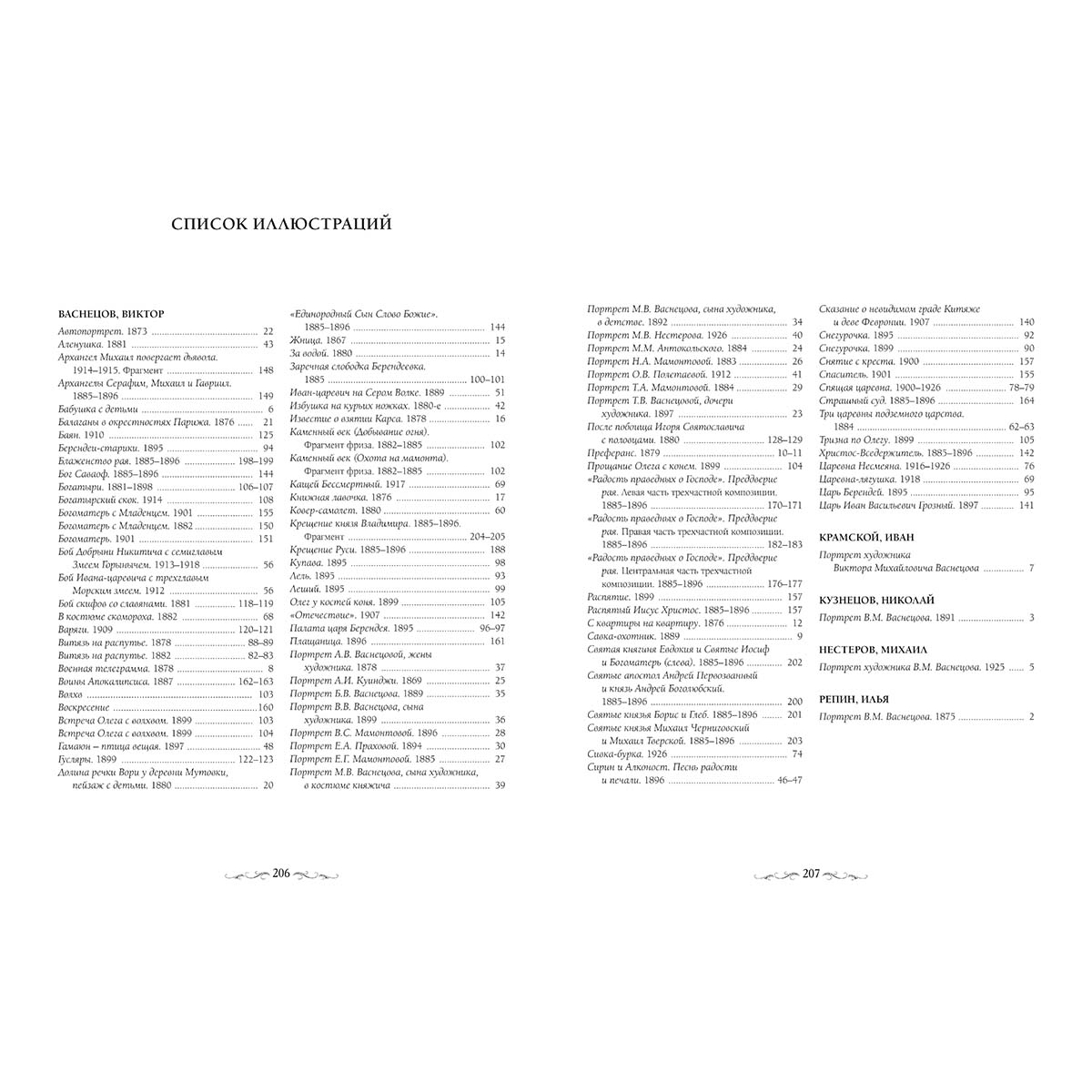 СПИСОК ИЛЛЮСТРАЦИЙ: Васнецов, Виктор Автопортрет. 1873 22 Аленушка. 1881 43 Архангел Михаил повергает дьявола. 1914–1915. Фрагмент 148 Архангелы Серафим, Михаил и Гавриил. 1885–1896 149 Бабушка с детьми 6 Балаганы в окрестностях Парижа. 1876 21 Баян. 1910 125 Берендеи-старики. 1895 94 Блаженство рая. 1885–1896 198–199 Бог Саваоф. 1885–1896 144 Богатыри. 1881–1898 106–107 Богатырский скок. 1914 108 Богоматерь с Младенцем. 1901 155 Богоматерь с Младенцем. 1882 150 Богоматерь. 1901 151 Бой Добрыни Никитича с семиглавым Змеем Горынычем. 1913–1918 56 Бой Ивана-царевича с трехглавым Морским змеем. 1912 56 Бой скифов со славянами. 1881 118–119 В костюме скомороха. 1882 68 Варяги. 1909 120–121 Витязь на распутье. 1878 88–89 Витязь на распутье. 1882 82–83 Военная телеграмма. 1878 8 Воины Апокалипсиса. 1887 162–163 Волхв 103 Воскресение 160 Встреча Олега с волхвом. 1899 103 Встреча Олега с волхвом. 1899 104 Гамаюн – птица вещая. 1897 48 Гусляры. 1899 122–123 Долина речки Вори у деревни Мутовки, пейзаж с детьми. 1880 20 «Единородный Сын Слово Божие». 1885–1896 144 Жница. 1867 15 За водой. 1880 14 Заречная слободка Берендеевка. 1885 100–101 Иван-царевич на Сером Волке. 1889 51 Избушка на курьих ножках. 1880-е 42 Известие о взятии Карса. 1878 16 Каменный век (Добывание огня). Фрагмент фриза. 1882–1885 102 Каменный век (Охота на мамонта). Фрагмент фриза. 1882–1885 102 Кащей Бессмертный. 1917 69 Книжная лавочка. 1876 17 Ковер-самолет. 1880 60 Крещение князя Владимира. 1885–1896. Фрагмент 204–205 Крещение Руси. 1885–1896 188 Купава. 1895 98 Лель. 1895 93 Леший. 1895 99 Олег у костей коня. 1899 105 «Отечествие». 1907 142 Палата царя Берендея. 1895 96–97 Плащаница. 1896 161 Портрет А.В. Васнецовой, жены художника. 1878 37 Портрет А.И. Куинджи. 1869 25 Портрет Б.В. Васнецова. 1889 35 Портрет В.В. Васнецова, сына художника. 1899 36 Портрет В.С. Мамонтовой. 1896 28 Портрет Е.А. Праховой. 1894 30 Портрет Е.Г. Мамонтовой. 1885 27 Портрет М.В. Васнецова, сына художника, в костюме княжича 39 Портрет М.В. Васнецова, сына художника, в детстве. 1892 34 Портрет М.В. Нестерова. 1926 40 Портрет М.М. Антокольского. 1884 24 Портрет Н.А. Мамонтовой. 1883 26 Портрет О.В. Полетаевой. 1912 41 Портрет Т.А. Мамонтовой. 1884 29 Портрет Т.В. Васнецовой, дочери художника. 1897 23 После побоища Игоря Святославича с половцами. 1880 128–129 Преферанс. 1879 10–11 Прощание Олега с конем. 1899 104 «Радость праведных о Господе». Преддверие рая. Левая часть трехчастной композиции. 1885–1896 170–171 «Радость праведных о Господе». Преддверие рая. Правая часть трехчастной композиции. 1885–1896 182–183 «Радость праведных о Господе». Преддверие рая. Центральная часть трехчастной композиции. 1885–1896 176–177 Распятие. 1899 157 Распятый Иисус Христос. 1885–1896 157 С квартиры на квартиру. 1876 12 Савка-охотник. 1889 9 Святая княгиня Евдокия и Святые Иосиф и Богоматерь (слева). 1885–1896 202 Святые апостол Андрей Первозванный и князь Андрей Боголюбский. 1885–1896 200 Святые князья Борис и Глеб. 1885–1896 201 Святые князья Михаил Черниговский и Михаил Тверской. 1885–1896 203 Сивка-бурка. 1926 74 Сирин и Алконост. Песнь радости и печали. 1896 46–47 Сказание о невидимом граде Китяже и деве Февронии. 1907 140 Снегурочка. 1895 92 Снегурочка. 1899 90 Снятие с креста. 1900 157 Спаситель. 1901 155 Спящая царевна. 1900–1926 78–79 Страшный суд. 1885–1896 164 Три царевны подземного царства. 1884 62–63 Тризна по Олегу. 1899 105 Христос-Вседержитель. 1885–1896 142 Царевна Несмеяна. 1916–1926 76 Царевна-лягушка. 1918 69 Царь Берендей. 1895 95 Царь Иван Васильевич Грозный. 1897 141 КРАМСКОЙ, ИВАН Портрет художника Виктора Михайловича Васнецова 7 КУЗНЕЦОВ, НИКОЛАЙ Портрет В.М. Васнецова. 1891 3 НЕСТЕРОВ, МИХАИЛ По