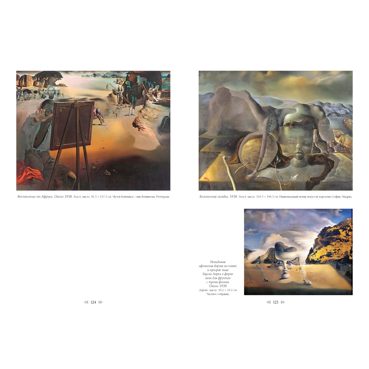 В. Живопись УКАЗАТЕЛЬ ПРОИЗВЕДЕНИЙ «Анжелюс» Галы. 1935 108 «Анжелюс». Около 1932 81 50 абстрактных картин, которые с двух метров превращаются в трех Ленинов, переодетых китайцами, а с шести метров образуют голову царственного тигра. 1962 194 Автоматическое начало портрета Галы. Около 1933 95 Автомобильные обломки рождают слепую лошадь, грызущую телефон. 1938 126 Автопортрет в мастерской. Около 1918 11 Автопортрет с газетой «Юманите». 1923 27 Автопортрет с рафаэлевой шеей. Около 1921 17 Автопортрет, расщепленный на три. 1926–1927 50 Автопортрет. 1921 16 Автопортрет. 1921 16 Автопортрет. Около 1920 16 Автопортрет. Около 1920 16 Аллегория закатного воздуха. 1940 134 Антропоморфный комод. 1936 116 Антропоморфный хлеб. 1932 87 Апофеоз Гомера (Дневной сон Галы). Около 1945 152 Аппарат и рука. 1927 51 Арлекин. 1926 46 Археологическое воспоминание «Анжелюса» Милле. Около 1934 97 Архитектурный «Анжелюс» Милле. 1933 88 Атомная Леда. 1947–1949 160 Атомная меланхолия. 1945 151 Баран (Призрачная корова). 1928 54 Бесконечная загадка. 1938 125 Битва в облаках. Около 1979 202 Битва в облаках. Около 1979 203 Битва при Тетуане (Дань уважения Мариано Фортуни). 1962 195 Бог залива Росос. Около 1944 145 Болеро Равеля. 1946 155 Больной мальчик. Автопортрет в Кадакесе. Около 1921 21 Вакханалия. Проект занавеса к балету. 1939 126 Великий мастурбатор. 1929 65 Великий параноик. 1936 110 Венера и купидоны. 1925 42 Венера и моряк. 1925 44 Вечерний паук сулит надежду. 1940 135 Взрывающаяся голова Рафаэля. 1951 167 Вид Порт-Льигат с ангелом-хранителем и рыбаками. 1950 161 Вилла Пепита. Около 1922 23 Вильгельм Телль. 1930 66 Вознесение святой Цецилии. Около 1955 180 Воскрешение плоти. Около 1940 134 Впечатление от Африки. Около 1938 124 Всадник перед башней. Около 1932 80 Вселенский собор. Около 1960 192 Гала и «Анжелюс» Милле, предшествующие неизбежному приходу конических анаморфоз. Около 1933 90 Гала созерцает гиперкубического Христа. Около 1954 178 Галарина. 1945 149 Галатея в процессе создания. Около 1954 172 Галацидалацидезоксирибонуклеоацид. 1963 196 Галлюцинация. Шесть образов Ленина на рояле. 1931 76 Галлюциногенный тореадор. 1970 197 Геологическая справедливость. 1936 114 Геополитический ребенок, наблюдающий рождение Нового человека. 1943 142–143 Гиперкубический Христос. Около 1954 165 Голова, бомбардируемая зернами пшеницы. Около 1954 172 Головокружение, или Башня удовольствия. 1930 70 Градива находит антропоморфные руины. Около 1930–1931 73 Градива. 1931 79 Дали, повернувшись спиною, пишет портрет Галы, повернувшейся спиною, с шестью запечатленными добродетельными оболочками глаз, условно отраженными шестью зеркалами. 1972–1973 200 Две фигуры. 1926 50 Девушка из Фигераса. 1926 44 Дематериализация вблизи носа Нерона. 1947 158 Детская карта мира. 1939 130 Джорнет. Около 1923 24 Дневная иллюзия. Приближается тень от рояля. 1931 78 Дом для эротоманов. Около 1932 82–83 Евхаристический натюрморт. 1952 169 Женская фигура в профиль. 1925 36 Женская фигура за столом. 1925 36 Женщина в окне в Фигерасе. 1925 41 Женщина с головой из роз. 1935 107 Женщина-рыба. 1930 70 Живой натюрморт. Около 1956 184 Жираф в огне. Около 1937 117 Загадка Гитлера. 1939 128–129 Загадка желания. Моя мама. 1929 59 Загадочные элементы в ландшафте. 1934 99 Имперский монумент женщине-ребенку. 1929 58 Инаугурационная гусиная кожа. 1928 56 Искушение святого Антония. 1946 154–155 Испания. 1938 122 Классическая копия «Кружевницы». Около 1955 180 Колосс Родосский. 1954 175 Конная фантазия. Портрет леди Данн. 1954 179 Кровать и два прикроватных столика, свирепо атакующих виолончель. Около 1983 4 Кровоточащи