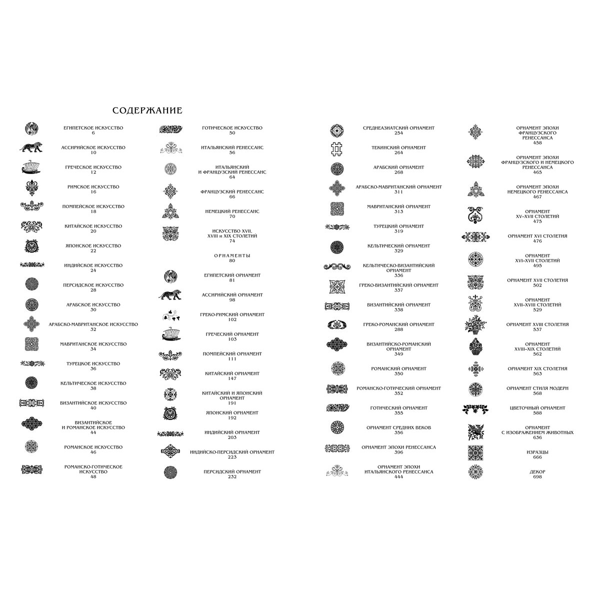 Параллельно с возрастающим процветанием художественной промышленности растет всеобщий интерес к художественно-промышленным производствам как нового, так и старого времени. Отсюда вытекает необходимая потребность ознакомления с главнейшими стилями различных искусств, и особенно с играющей важную роль в этом случае орнаментикой. Орнаментика – особая широкая область искусства, весьма интересная и серьезная по своему историческому значению и по своему близкому, разнообразному соотношению с другими, высшими изящными искусствами. Н.Ф. ЛОРЕНЦ В книге представлены орнаменты: египетский, ассирийский, греческий, римский, помпейский, китайский, японский, индийский, персидский, арабский, арабско-мавританский, мавританский, турецкий, кельтский, греко-византийский, византийский, греческий, романский, готический, итальянского, французского и немецкого Ренессанса, Средних веков, XVII–XIX столетий, стиля модерн, цветочный, с изображением животных, а также изразцы и декор.