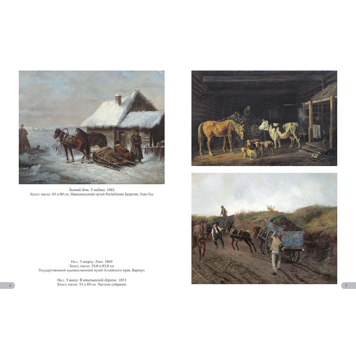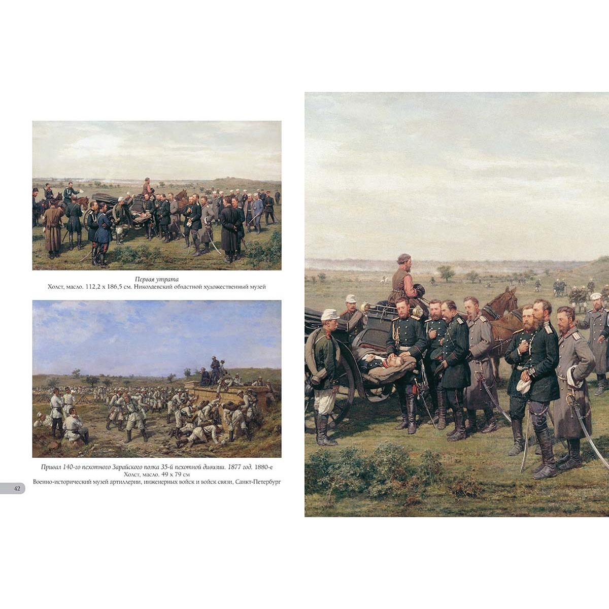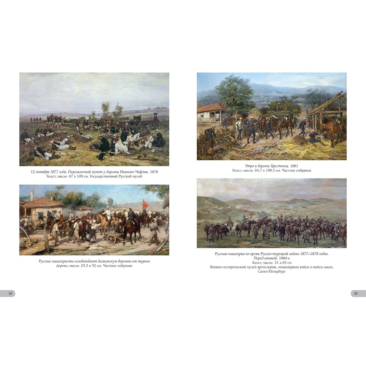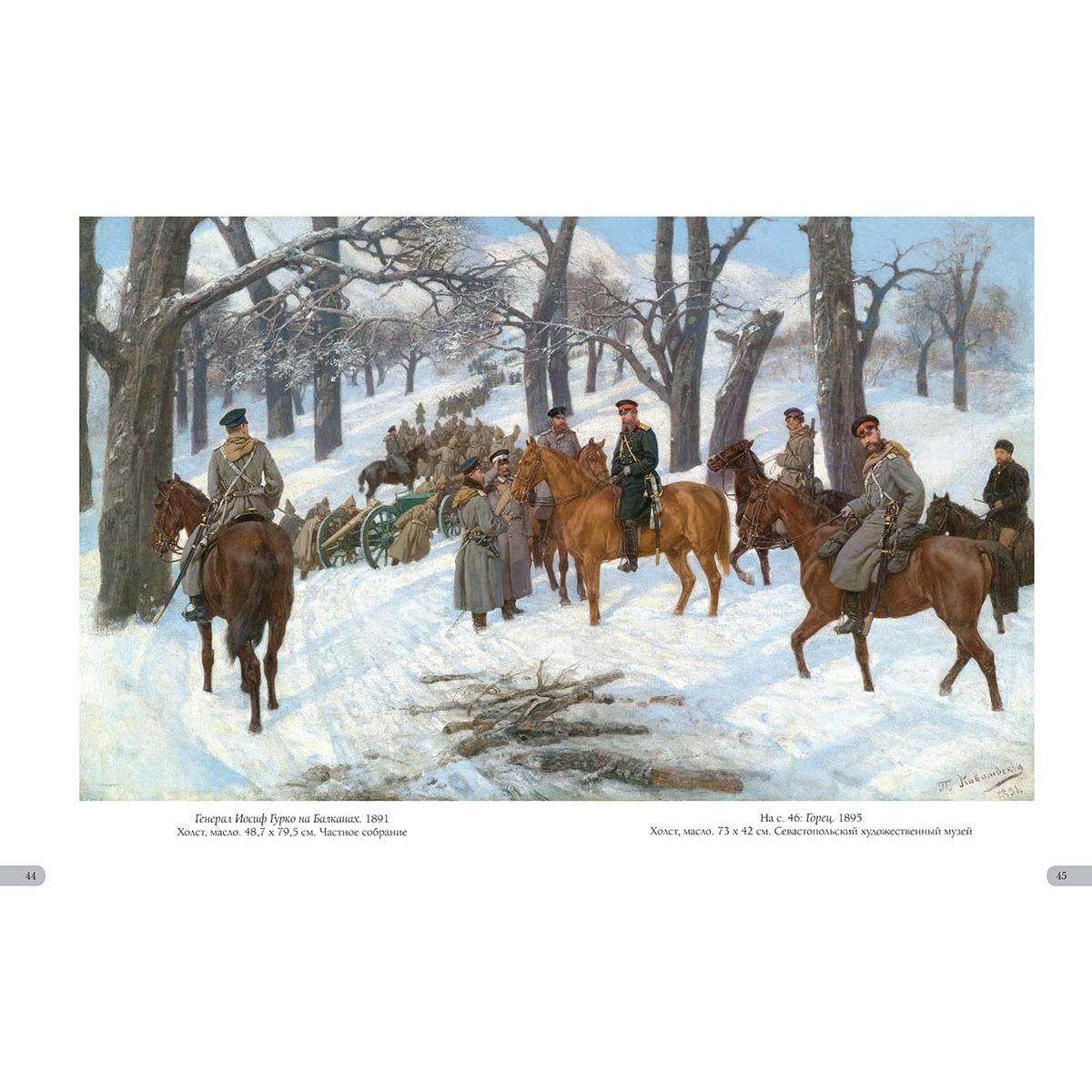- Список художников и их полотен или именной указатель (если есть) УКАЗАТЕЛЬ ПРОИЗВЕДЕНИЙ 12 октября 1877 года. Перевязочный пункт у деревни Иваново-Чифлик. 1878 38 Атака русской кавалерии на турецкий обоз. 1877 год. 1880-е 33 Белая ночь. 1891 18 Бечевая тяга на реке Ижоре. 1868 14 Бой у Иваново-Чифлик 2 октября 1877 года. 1887 34–35 В итальянской деревне. 1874 5 Всадники в горах. 1870-е 27 Встреча. 1876 18 Генерал Иосиф Гурко на Балканах. 1891 44–45 Генерал Струков. 1898 24 Головы лошадей 9 Горец. 1895 46 Закупка лошадей для кавалерии 20–21 Зимний день. У кабака. 1882 4 Зимняя дорога. В деревне 2 Кавказ. 1872 25 Канонир (Пулеметчик). 1883 2 Конская ярмарка. Конец XIX века 22–23 Лошади на деревенском дворе. 1878 10–11 На границе. 1880–1890 28 Объезд епархии. 1885 16–17 Охотники, застигнутые грозой. 1880-е 6–7 Пейзаж с горцами. 1872 24 Пейзаж с телегой (Крутой спуск). 1870 19 Первая утрата 42 Перед грозой. 1887 14 Переправа через Дунай. 1880 36–37 Переправа. 1889 26 Переход через перевал. 1873 28 Пехотная застава на Балканах во время Русско-турецкой войны 1877–1878 годов. 1884 33 Портрет молодого человека 3 Привал 140-го пехотного Зарайского полка 35-й пехотной дивизии. 1877 год. 1880-е 42 Привал кавалеристов. 1874 30–31 Русская кавалерия во время Русско-турецкой войны 1877–1878 годов. Перед атакой. 1880-е 39 Русские кавалеристы освобождают балканскую деревню от турков 38 Спуск к перевозу. 1890 12–13 Сцена из Русско-турецкой войны 1877–1878 годов. 1884 32 Табун лошадей. 1873 8 Тройка в грязи. 1889 8 Утро в деревне Брестовец. 1881 39 Хлев. 1869 5 Штаб 12-го корпуса в Болгарии (Пленные турки). 1878 40–41 Эпизод из Болгарской войны 1876–1877 годов. 1882 32