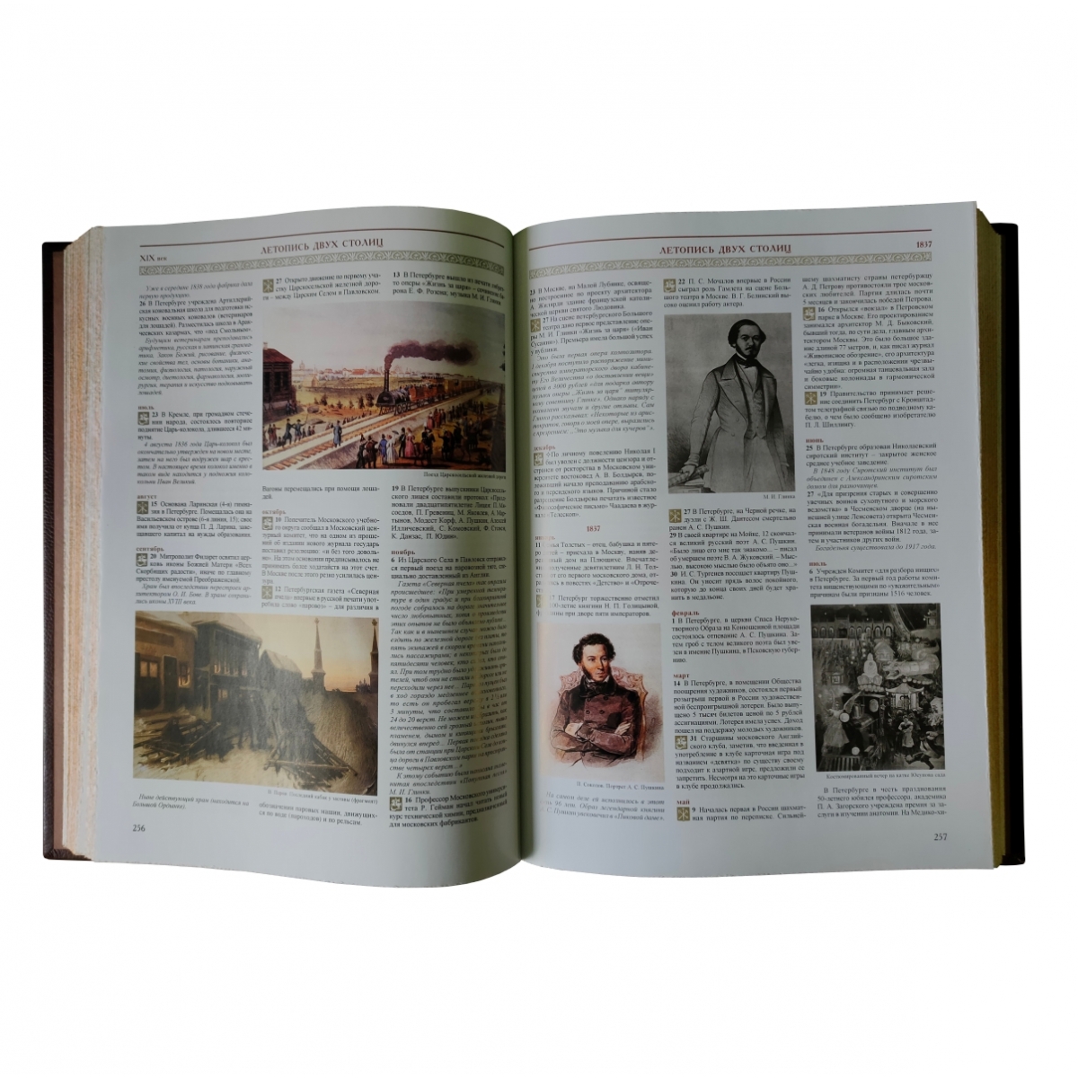 Составной переплет ручной работы. Натуральная переплетная кожа. Каптал из шелковых нитей. Ляссе шелковое. Обрез торшонированный золотой фольгой. Украшение переплета: тиснение полиграфической фольгой. Уникальное подарочное издание: тысячи информативных, точно датированных сообщений в хронологическом порядке. Коллектив авторов успешно решил задачу по сбору самой полной, интересной и научно выверенной информации на основе огромного количества археологических памятников и документальных источников. Редакцией была проделана большая работа по подбору иллюстративного материала: книга содержит более 1 500 репродукций картин, старинных рисунков, гравюр и карт и многочисленные другие материалы. «Летопись двух столиц» первое подобное издание как у нас в стране, так и за рубежом.