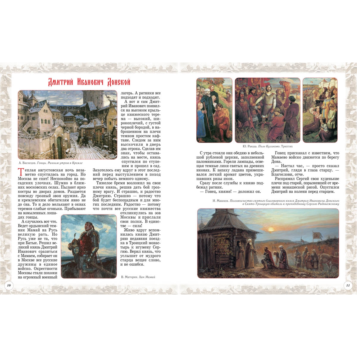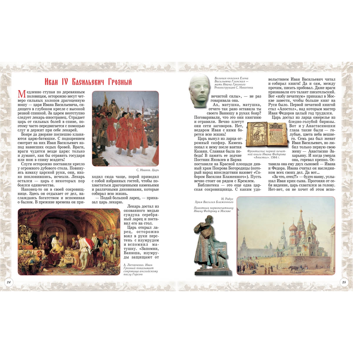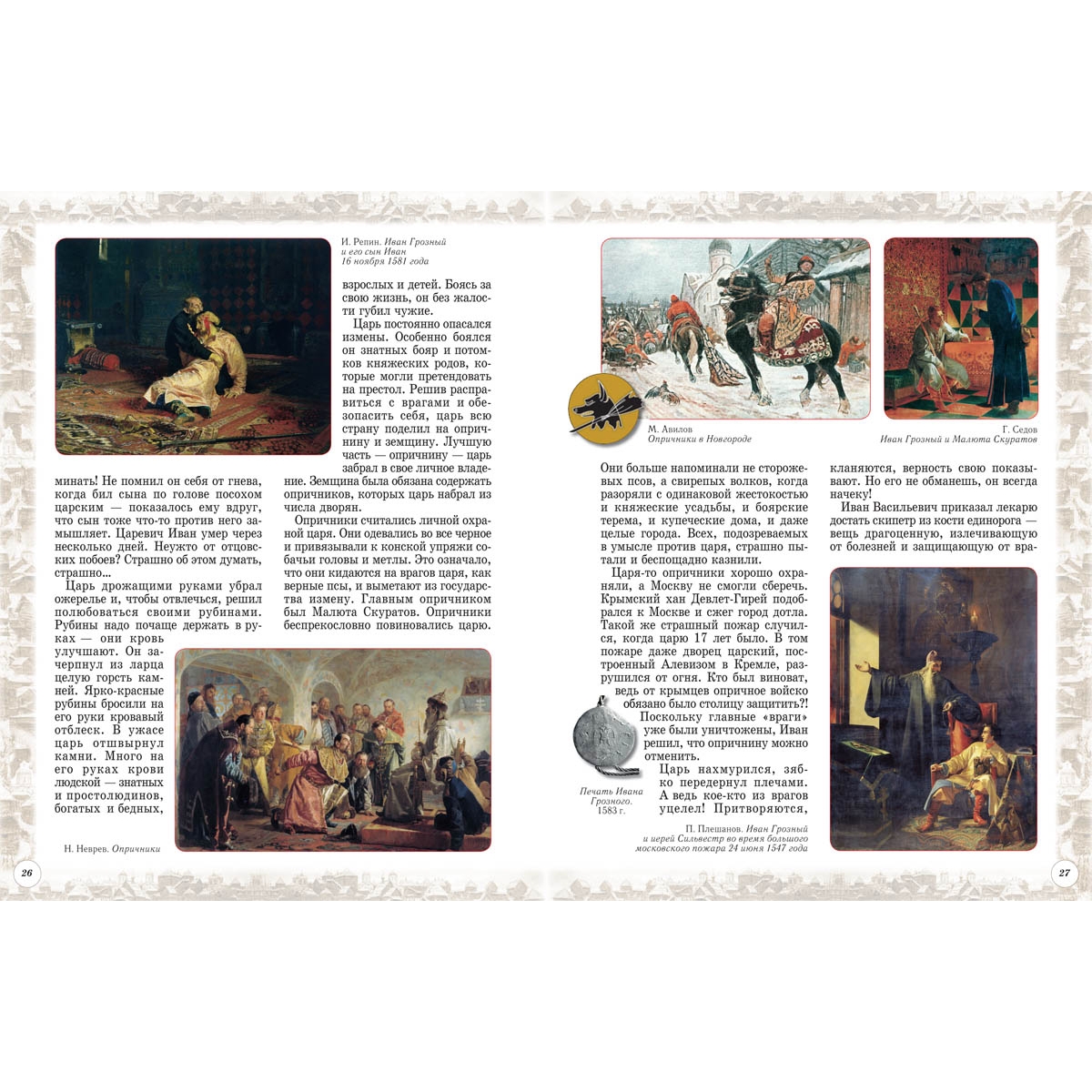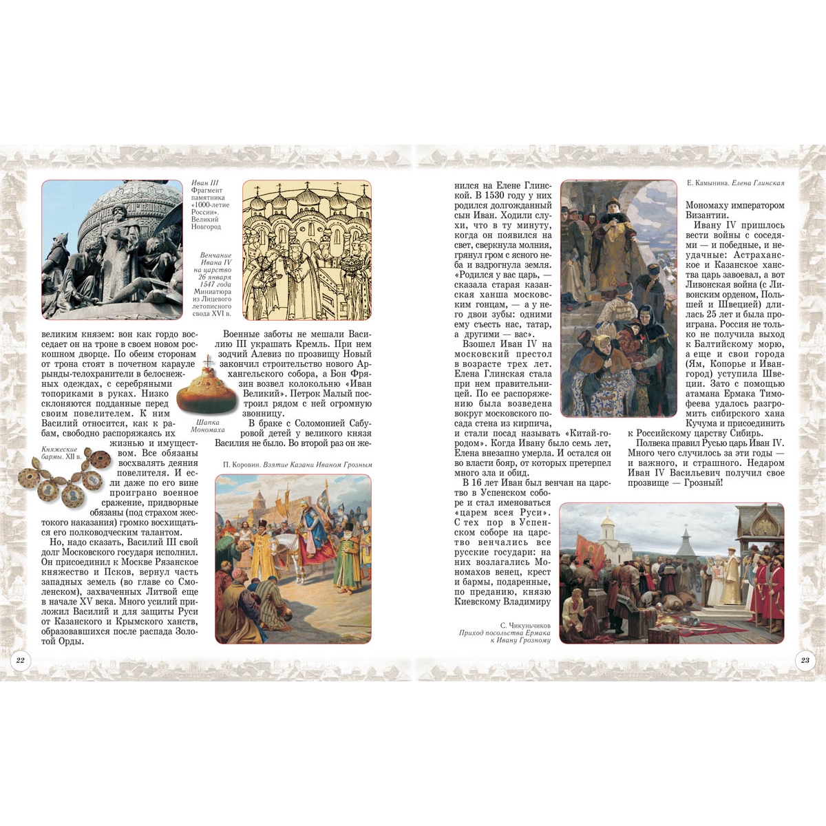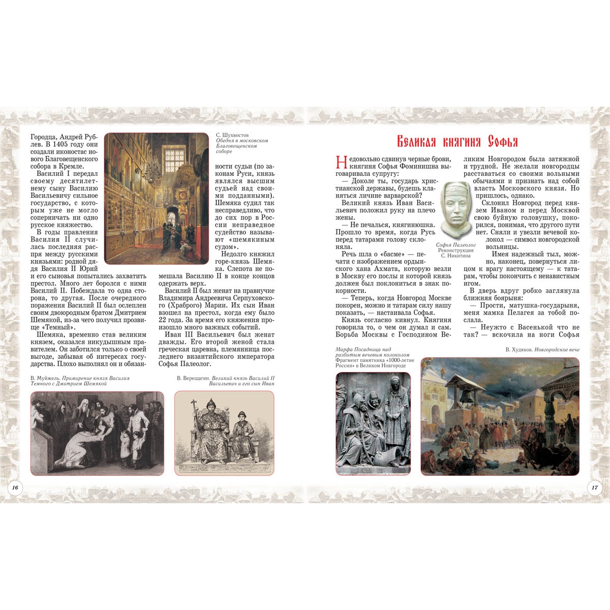 «Русский ребенок должен с самого начала почувствовать и понять, что он славянин, сын великого славянского пле¬мени и в то же время сын великого русского народа, имеющего за собою величавую и трагическую историю, перенесшего великие страдания и крушения и выходившего из них не раз к подъему и расцвету» – эти слова русского писателя и философа Ивана Александровича Ильина могли бы стать эпиграфом, объединяющим все книги серии «История России» для детей. Действительно, нет ничего важнее, чем научить юного гражданина гордиться своей страной и ее прошлым. Книга «Московская Русь» о том, как по крупицам собирали московские князья окрестные земли, чтобы родилось сильное Московское государство, ставшее преемником Руси Киевской и Владимирской, как Русь освободилась, наконец, от 300-летнего монголо-татарского ига, как из крошечного, никому не известного селения на Боровицком холме Москва превратилась в столицу могучей державы. Но прежде всего эта книга о людях – князьях и царях, святых подвижниках и воинах, великих зодчих и живописцах – о тех, кто творил историю и создавал культуру России. Книга «Московская Русь», хотя и выходит в серии «История России», ничуть не похожа на учебник истории. Автор, говоря о значительных исторических событиях, смотрит на них глазами своих героев: гордо шествующего по Москве Ивана Калиты, отправляющегося на Куликово поле Дмитрия Донского, великого князя Ивана III, при котором Русь сбросила, наконец, 300-летнее монголо-татарское иго, вспоминающего о своих праведных делах и раскаивающегося в грехах Ивана Грозного, уличных мальчишек, прибежавших к Москве-реке поглазеть на «гуляй-город» и других реальных и вымышленных персонажей. Многочисленные иллюстрации: репродукции икон, портретов московских государей, жанровых картин, написанных замечательными русскими живописцами XIX–XX столетий и нашими современниками, помогают сделать образы живыми и яркими и почувствовать дух Московской Руси XIV–XVI столетий. «Клянусь Вам моей честью, что я ни за что не согласился бы ни переменить родину, ни иметь другую историю, чем история наших предков, какую нам послал Бог», – писал Пушкин а письме к Чаадаеву. Согласитесь, каждый из нас мечтает, чтобы так же думали и чувствовали наши дети. А для этого они должны знать эту самую родную историю. Книга «Московская Русь» поможет совершить увлекательное путешествие в средневековую Москву XIV–XVI столетий: увидеть князя Ивана Калиту, гуляющего по Кремлю, почувствовать тревогу и сомнения Дмитрия Донского перед Куликовской битвой, узнать, как при Иване III Русь сбросила, наконец, ненавистное монголо-татарское иго, подивиться вместе с уличными мальчишками на диковинный «гуляй-город» на Москве-реке, спуститься в сокровищницу Ивана Грозного, поиграть вместе с юным царевичем Алексеем Михайловичем – словом, узнать, а благодаря многочисленным иллюстрациям и увидеть много интересного. Книга «Московская Русь», изданная в серии «История России», – это занимательное путешествие в русское Средневековье, которое представлено в ярких образах московских князей и царей, святых и воинов, живописцев и зодчих XIV–XVI столетий. При стандартном объеме книга содержит 146 цветных иллюстраций. Все это делает издание полезным и интересным для школьников младшего и среднего школьного возраста. об авторе Роньшин