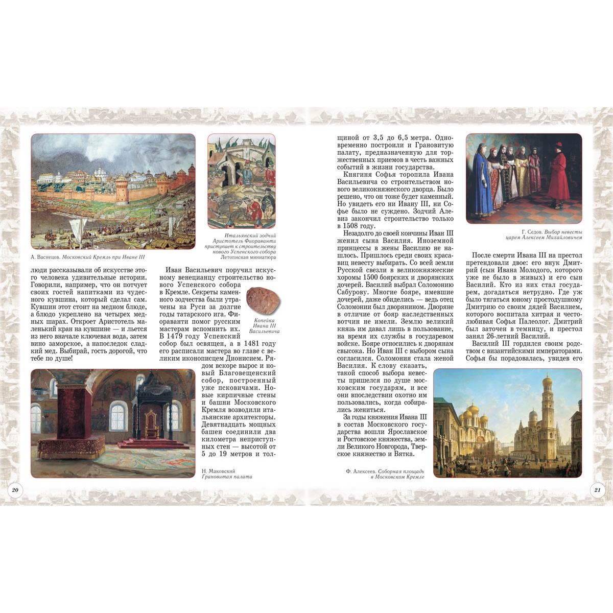 Хотите увидеть средневековую Московскую Русь и узнать, как из маленького безвестного селения на Боровицком холме Москва превратилась в столицу огромной державы? Тогда отправляйтесь с нами. Мы совершим прогулку по Кремлю вместе с Иваном Калитой, разделим тревогу и сомнения князя Дмитрия Донского перед Куликовской битвой, узнаем, как при Иване III Русь сбросила, наконец, ненавистное монголо-татарское иго, спустимся в царскую сокровищницу Ивана Грозного, подивимся вместе с уличными мальчишками на диковинный «гуляй-город», поиграем с юным царевичем Алексеем Михайловичем. Все это делает издание полезным и интересным для школьников младшего и среднего школьного возраста.
