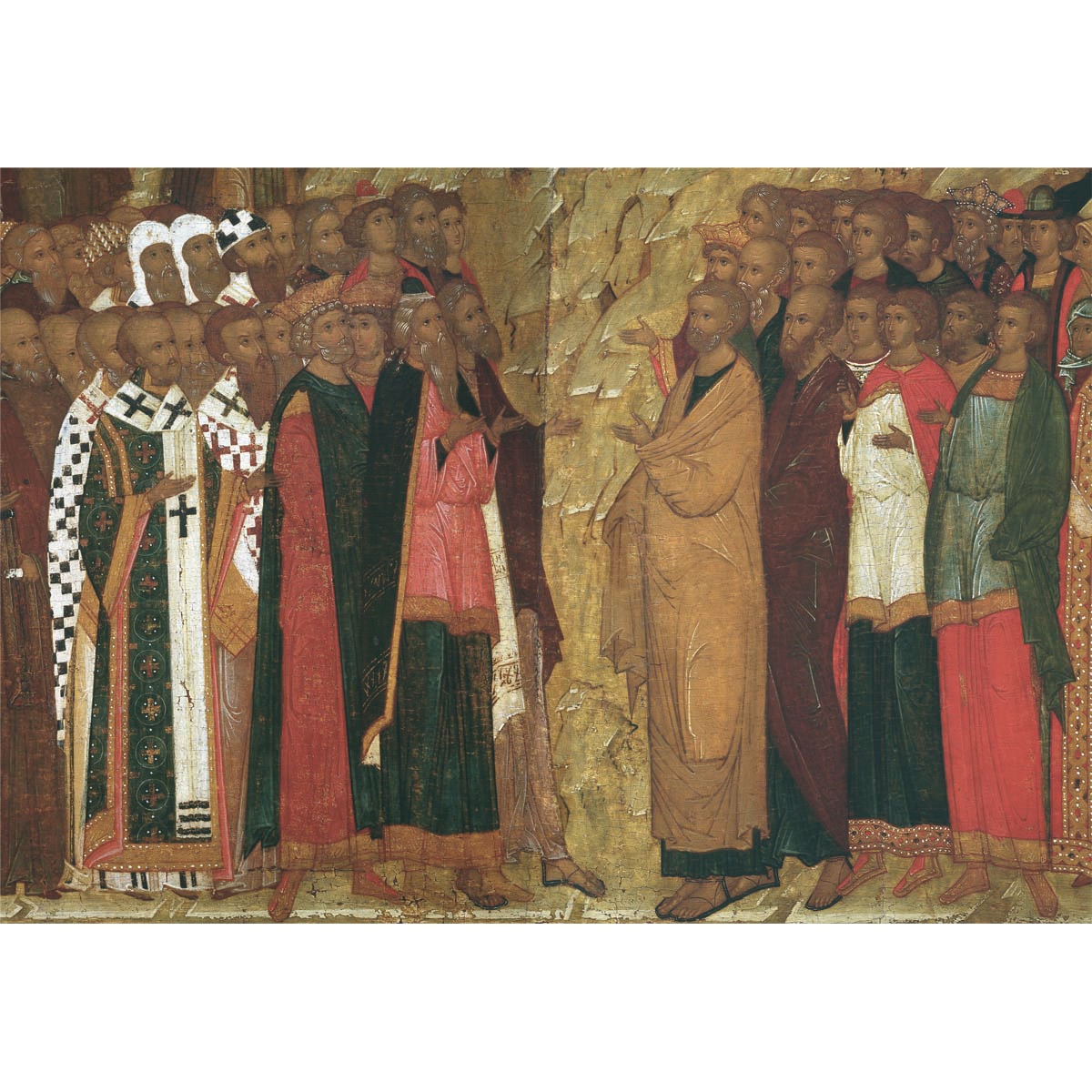 Однако ни одна вершина не существует без опоры, в пустоте. И к Троице, ныне пребывающей в залах Третьяковской галереи, русское иконописание шло не одно столетие. Шло за Византией, смиренным учеником в великой школе христианской веры, от светоча тысячелетнего принятой. Потом, в темные дни монголо-татарской напасти, в поиске самосмыслительном, оно с Божией помощью училось смотреть на ослепительный свет Истины своими глазами, протягивать руки навстречу Духу Господню и принимать истечение благодати, перенося ее в святые образа. А в ХIV веке, обретя собственный опыт, уже по-иному – не ученическим, но братским сознанием восприняло тот ослепительный луч света, который пришел из Византии, воссиял на пороге гибели империи, готовой передать святыню православия Руси как новой его опоре.