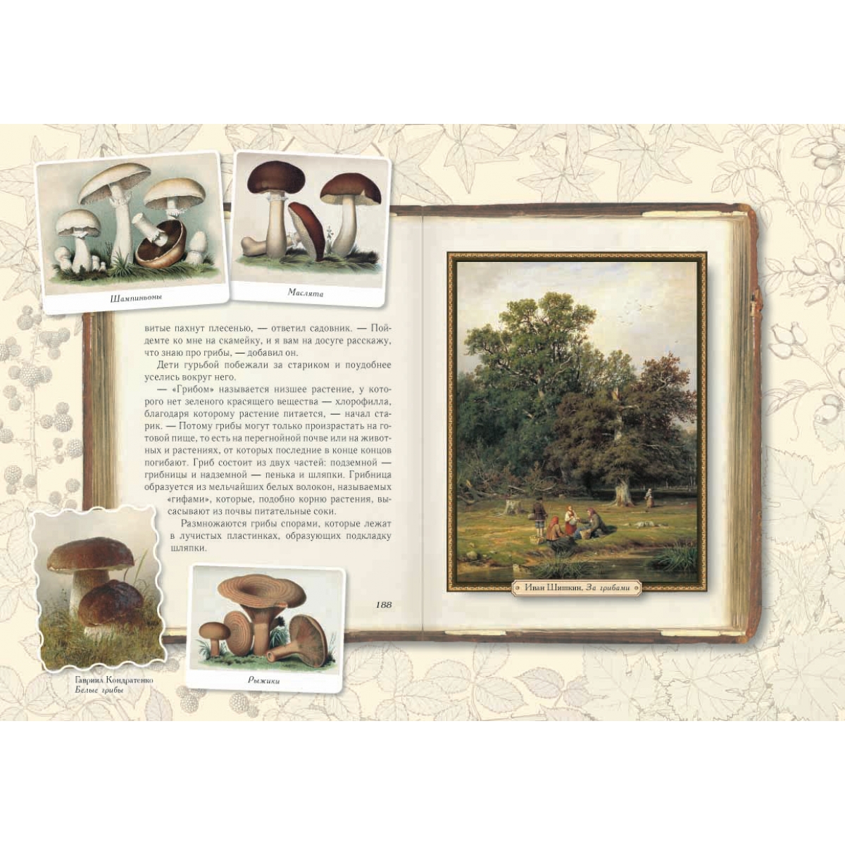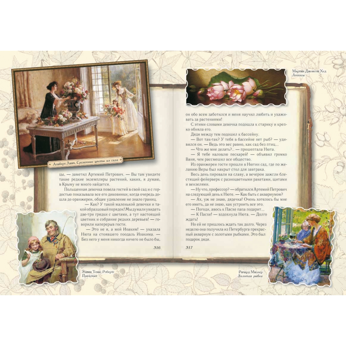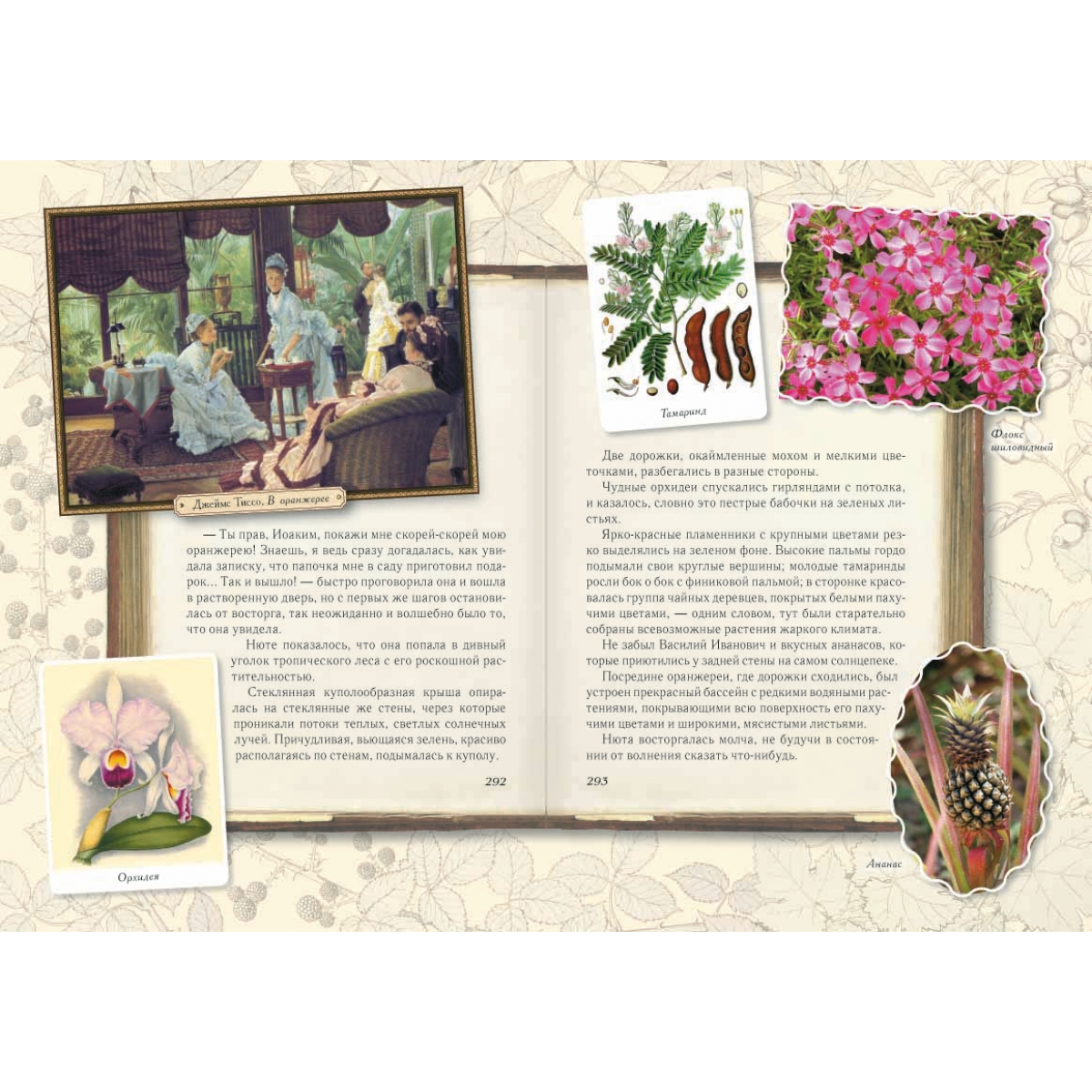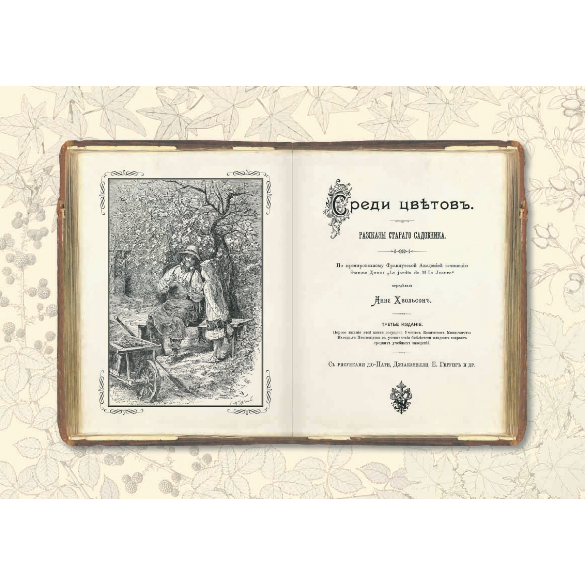 Сочинение Эмиля Дебо «Le jardin de M-lle Jeanne» в переводе и обработке Анны Хвольсон. Художники-иллюстраторы - Дю-Пати, Джиакомелли, Е. Герунг и др. Книга «Среди цветов. Рассказы старого садовника» была по достоинству оценена еще более ста лет назад: в конце XIX века она была «премирована Французской академией», а в русском переводе и обработке детской писательницы Анны Хвольсон одобрена российским Министерством просвещения, о чем есть соответствующие пометки на титульном листе издания 1895 года. И это не удивительно. Потому что задача научить ребенка любить и понимать окружающую его живую природу была актуальна во все времена, а сегодня она приобрела первостепенное значение. «Среди цветов. Рассказы старого садовника» – это увлекательные рассказы по ботанике для детей младшего школьного возраста, которые были написаны более 100 лет назад французским ученым Эмилем Дебо и переведены на русский язык и обработаны детской писательницей Анной Борисовной Хвольсон. Детям предстоит совершить много маленьких открытий: узнать, как из семечка вырастает цветок или целое дерево, чем растения питаются и как дышат, какие диковинки произрастают на нашей планете, а также познакомиться с другими обитателями сада: птицами, пчелами, муравьями, светлячками, лягушками. В нашем издании текст и черно-белые иллюстрации оригинала (напечатанного в 1895 году) получили обрамление в виде цветных рисунков из старинных ботанических атласов и современных фотографий. Поэтому все цветы, деревья, насекомые, птицы и животные, о которых рассказывает старый садовник, обрели на страницах книги свои «портреты». А пейзажи и жанровые картины известных русских и зарубежных художников не только делают книгу красивой и яркой, но и знакомят юного читателя с замечательными образцами мировой живописи. В настоящем издании использованы полотна художников из следующего списка: И. Айвазовский, С. Андерсон, А. Анкер, Е. Бём, В. Борисов-Мусатов, А. Бугро, К. Брюллов, В. Ван Гог, А. Васнецов, С. Виноградов, А. Дюрер, Й.-Л. Йенсен, Г. Кондратенко, К. Коровин, И. Крачков-ский, Б. Кустодиев, К. Ларссон, П. де Лонпре, Д. Лэмбдин, В. Максимов, К. Маковский, Э. Мане, К. Моне, Б. Моризо, Г. Мясоедов, М. Нестеров, Б. Ольшанский, В. Орловский, К. Писсарро, В. Поле-нов, О. Ренуар, И. Репин, Д. Сарджент, В. Серов, Н. Соломин, Д. Тиссо, В. Тропинин, А. Фантен-Латур, И. Хруцкий и др. От редакции Дорогие юные читатели! Перед вами новый оригинальный вариант чудесной старинной детской книжки, написанной французским ученым Эмилем Дебо и переделанной специально для русских детей писательницей Анной Борисовной Хвольсон (которая, кстати сказать, придумала забавного человечка Мурзилку). Впервые книга «Среди цветов. Рассказы старого садовника» была издана на русском языке в конце XIX века, то есть более 115 лет назад, и ее читали, возможно, еще ваши прабабушки, когда были маленькими. Сегодня тех книжек остались единицы. Поэтому мы решили сделать вам подарок и напечатать книгу заново. Мы бережно сохранили черно-белые иллюстрации и заставки оригинала. Но наша книга не простая – она с секретом! Откройте первые страницы – и вы увидите лежащую на столе раскрытую старинную книгу, поверх которой кто-то небрежно разбросал множество цветных картинок. Здесь и рисунки из ботанических атласов, и красивые фотографии, и красочные репродукции с картин известных 