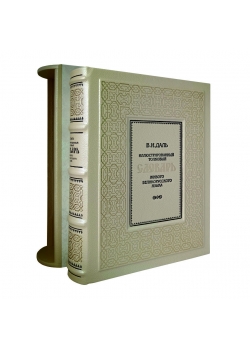 Французский цельнокожаный переплет ручной работы на шнурах. Натуральная переплетная кожа. Форзац составной на кожаной слизуре. Дизайнерская бумага. Каптал двойной наборный, ручное плетение из шелковых нитей. Обрез торшорированный. . Ляссе шелковое. Тиснение полиграфической фольгой. Толковый словарь живого великорусского языка В. И. Даля, проиллюстрированный произведениями живописи и поясняющими русунками. Приложения: «Русские меры и денежные единицы XI—XIX веков», «Крылатые фразы русской литературы и истории». |