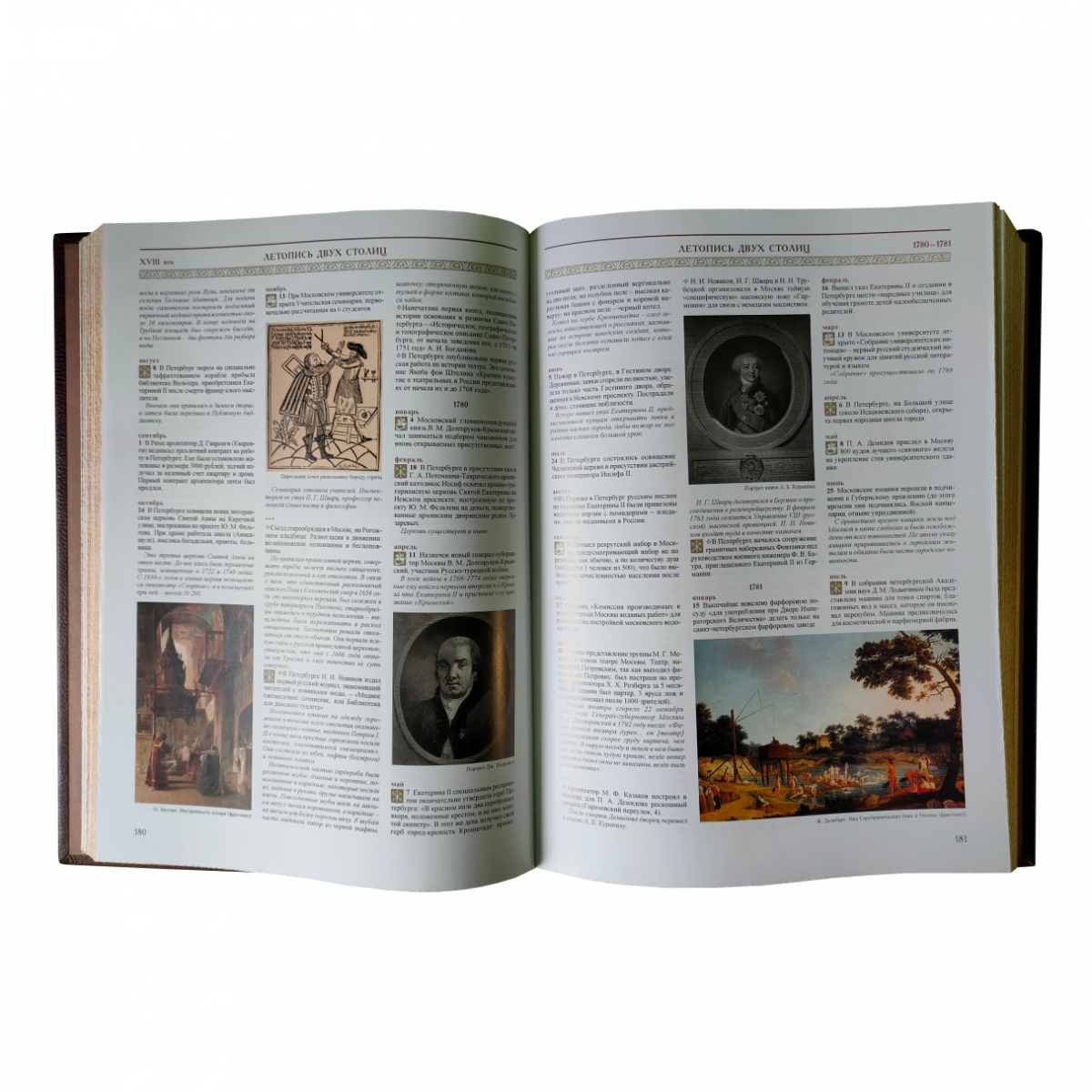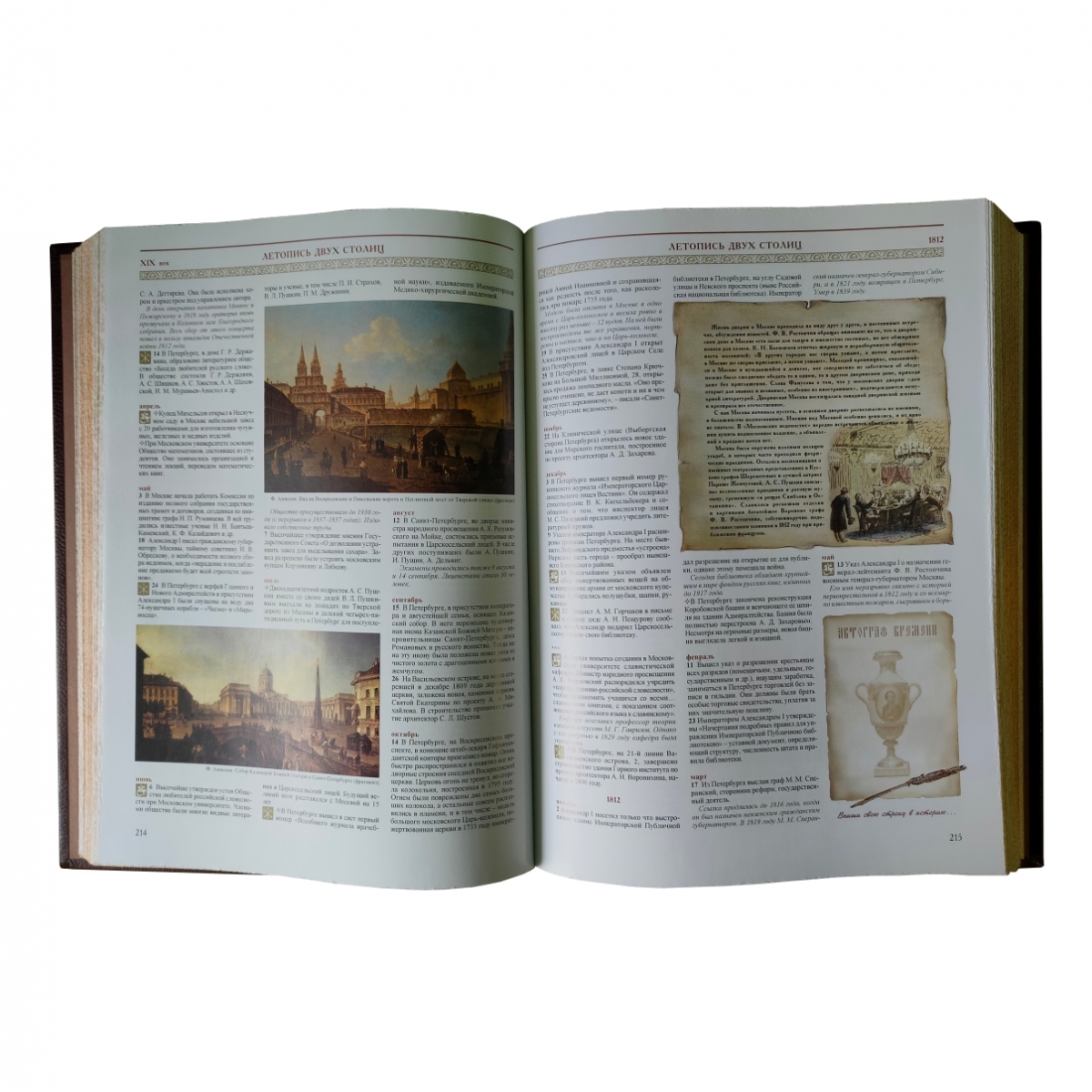 Уникальное подарочное издание: тысячи информативных, точно датированных сообщений в хронологическом порядке. Коллектив авторов успешно решил задачу по сбору самой полной, интересной и научно выверенной информации на основе огромного количества археологических памятников и документальных источников. Редакцией была проделана большая работа по подбору иллюстративного материала: книга содержит более 1 500 репродукций картин, старинных рисунков, гравюр и карт и многочисленные другие материалы. «Летопись двух столиц» первое подобное издание как у нас в стране, так и за рубежом. Переплет ручной работы. Натуральная переплетная кожа. Каптал из шелковых нитей. Ляссе шелковое. Обрез золотой. Украшение переплета: тиснение полиграфической фольгой, декоративные металлические вставки.