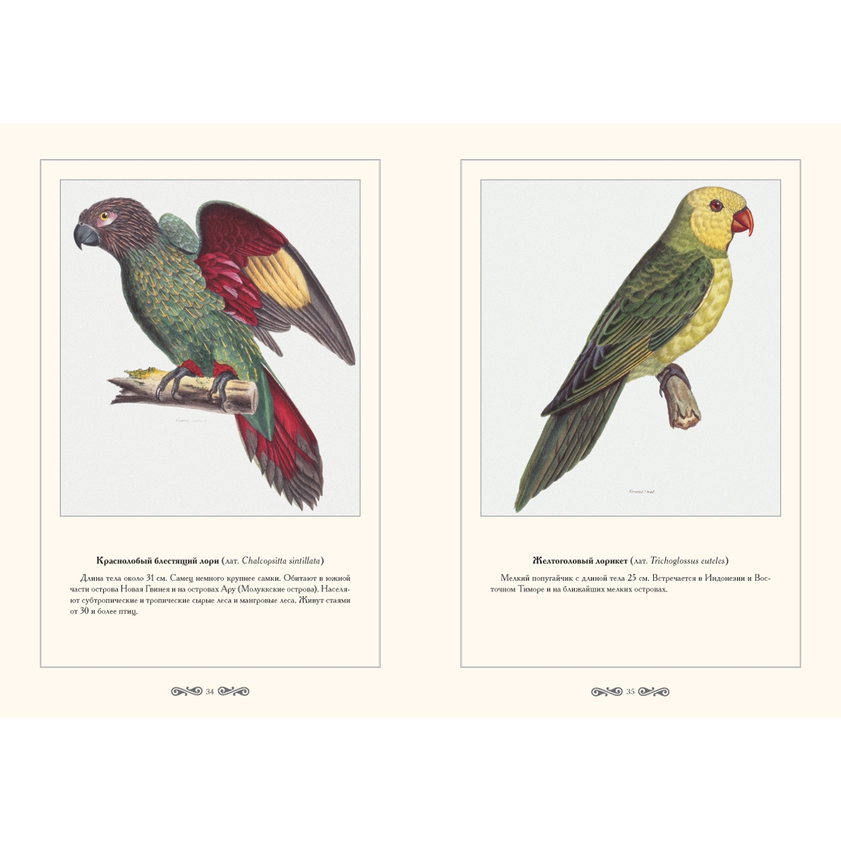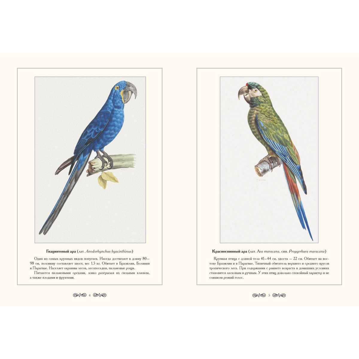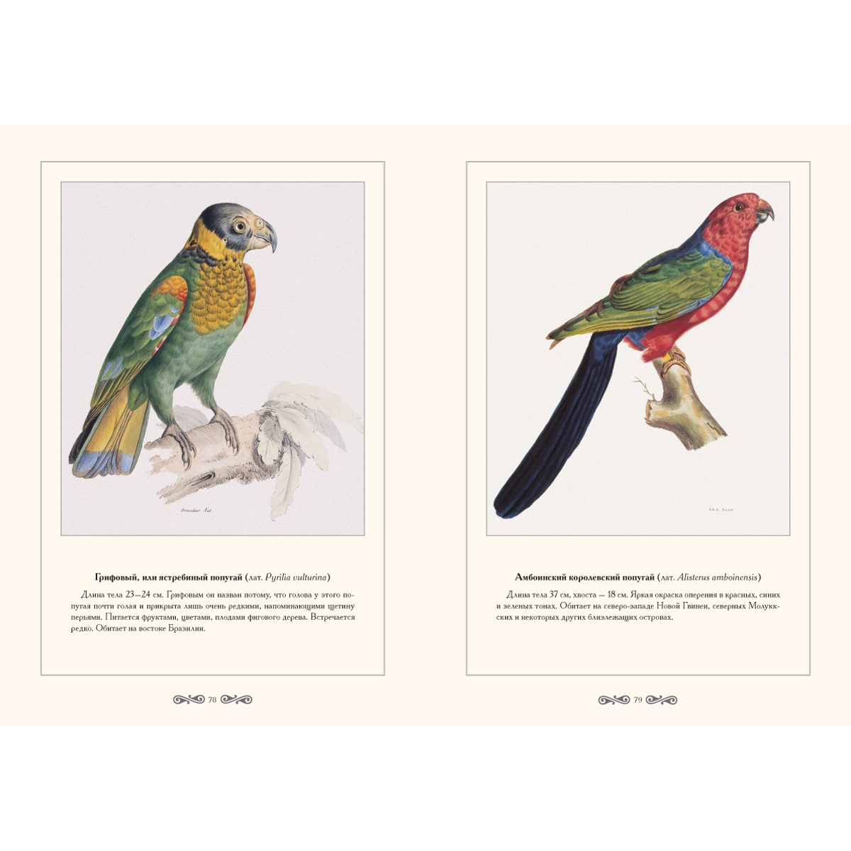 Данный альбом знакомит читателя с собранием из 110 цветных литографий ХIХ века, изображающих попугаев из разных континентов. Литографии служили иллюстрациями научных книг или издавались в виде красочных альбомов в разных странах Европы: в Англии, Франции и др